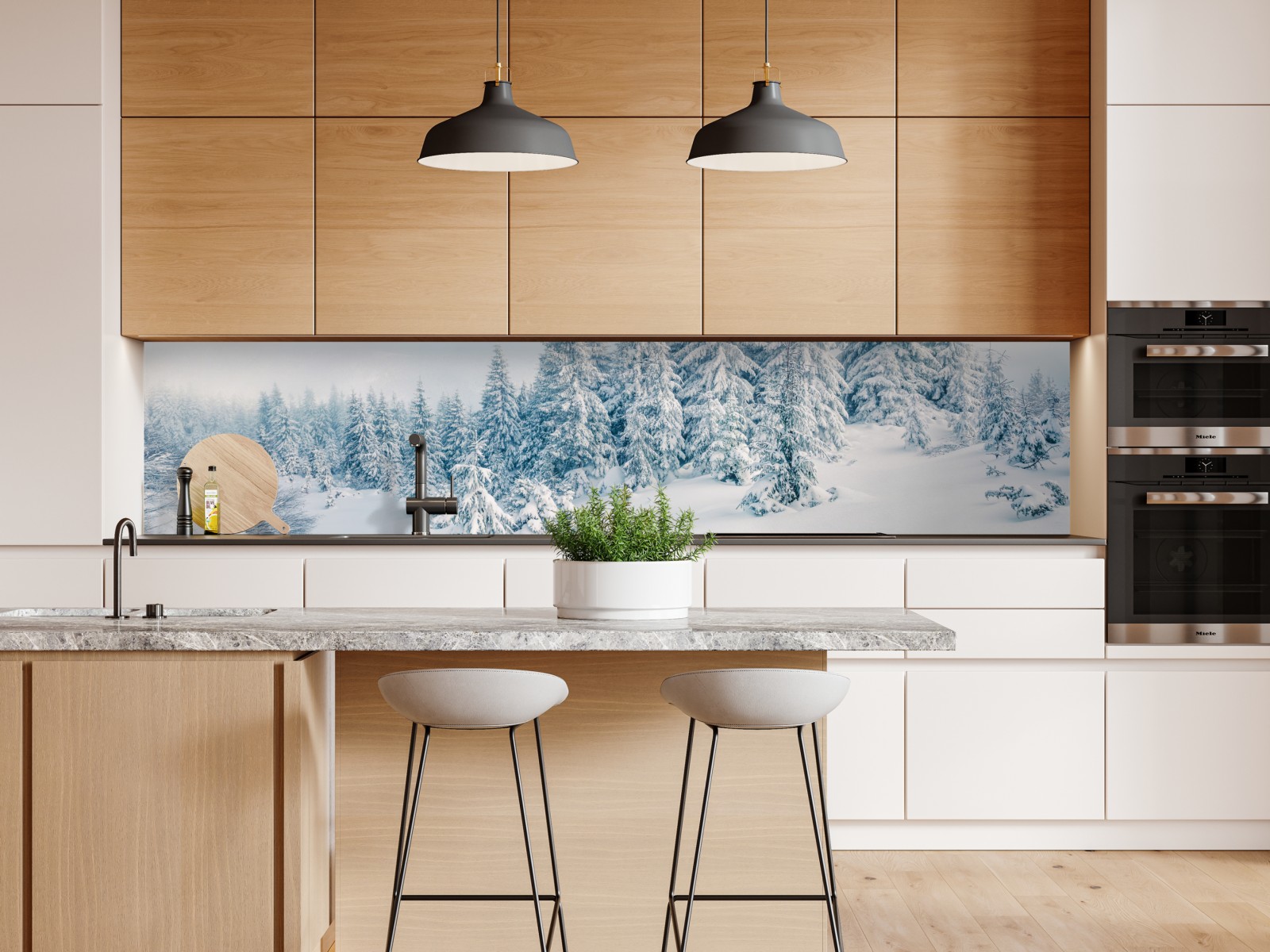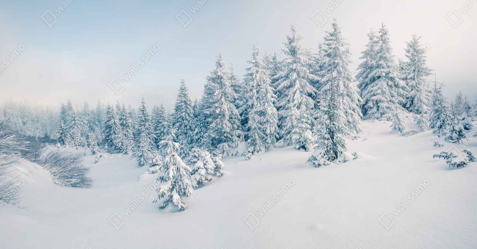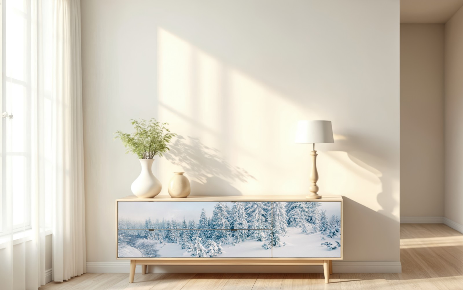 Ruhige winterliche Panoramaaufnahme mit schneebedeckten Fichten und sanften Hügeln, die jedem Raum eine kühle, naturnahe Atmosphäre verleiht.