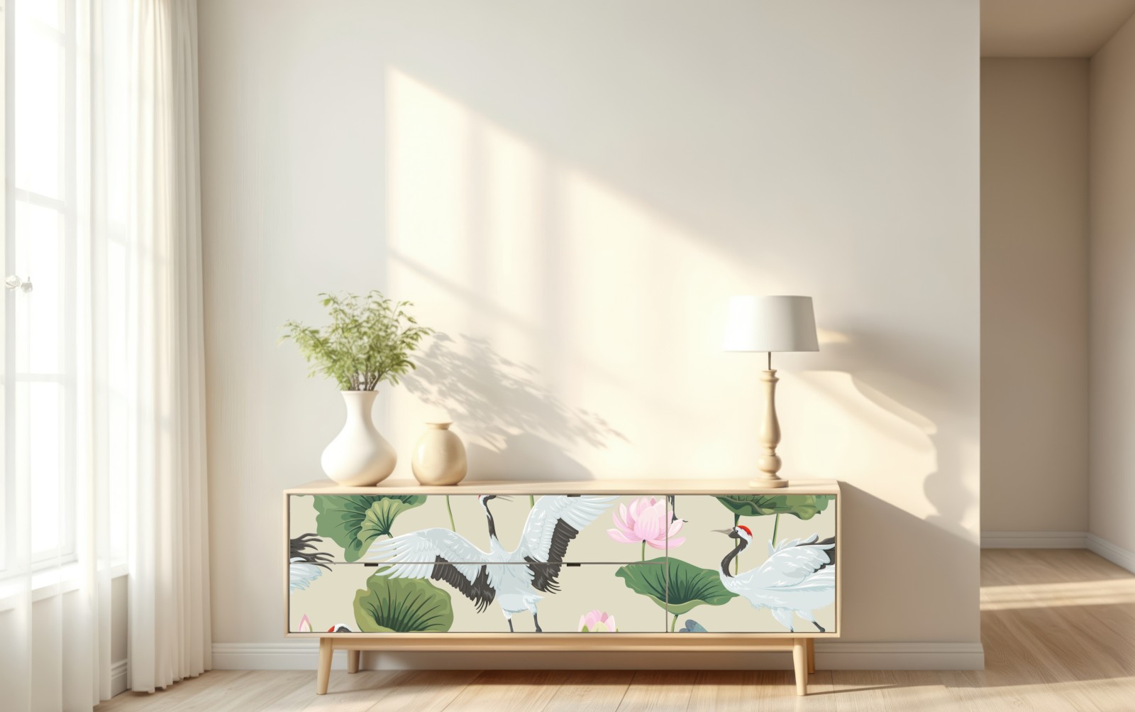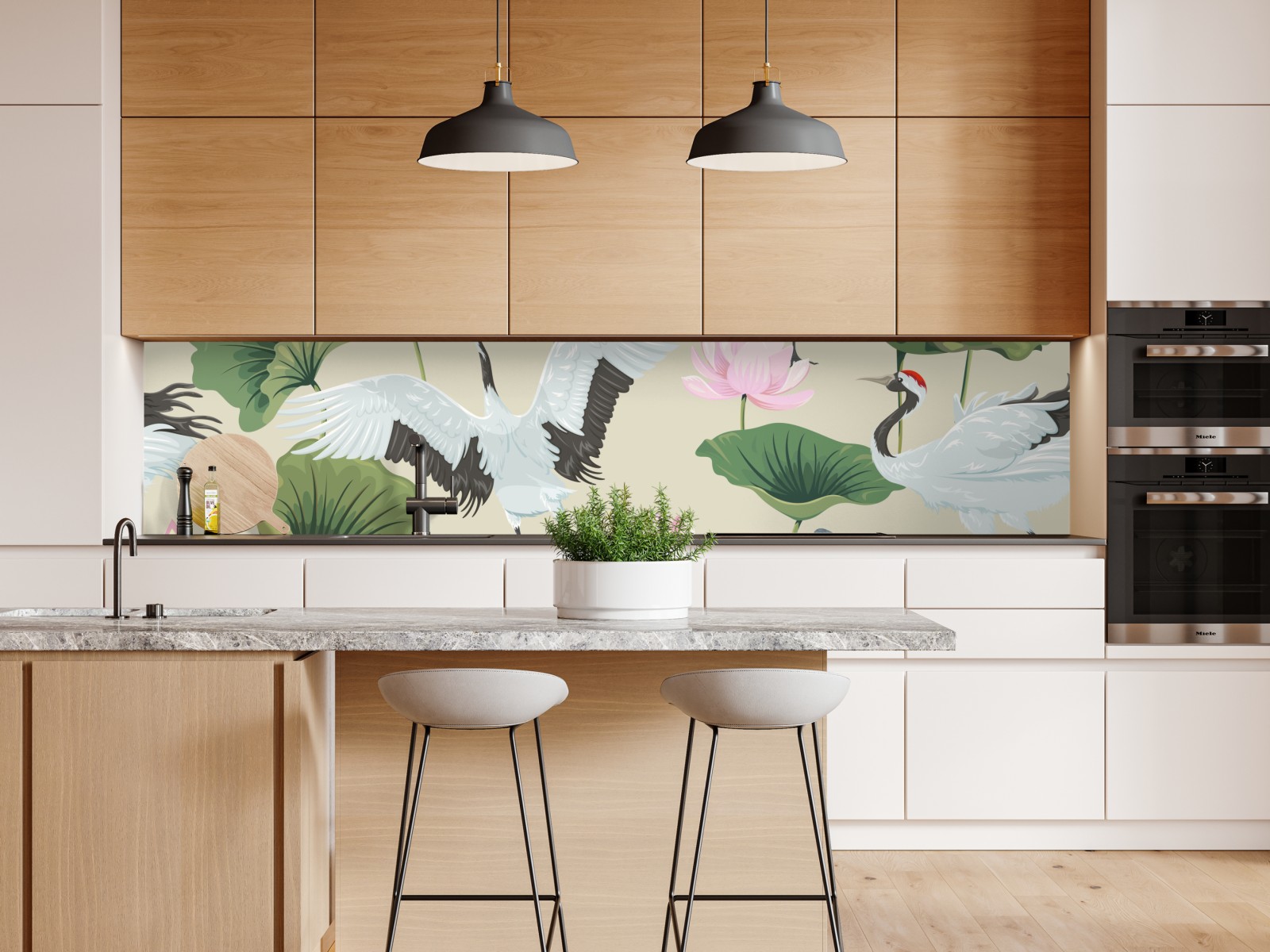 Zarte Kraniche und Lotusblüten schaffen ein ruhiges, vom asiatischen Stil inspiriertes botanisches Muster, das jedem Raum Gelassenheit und Eleganz verleiht.