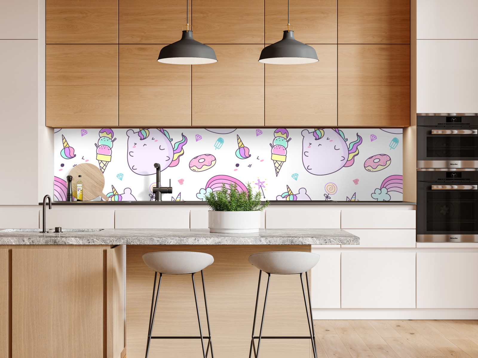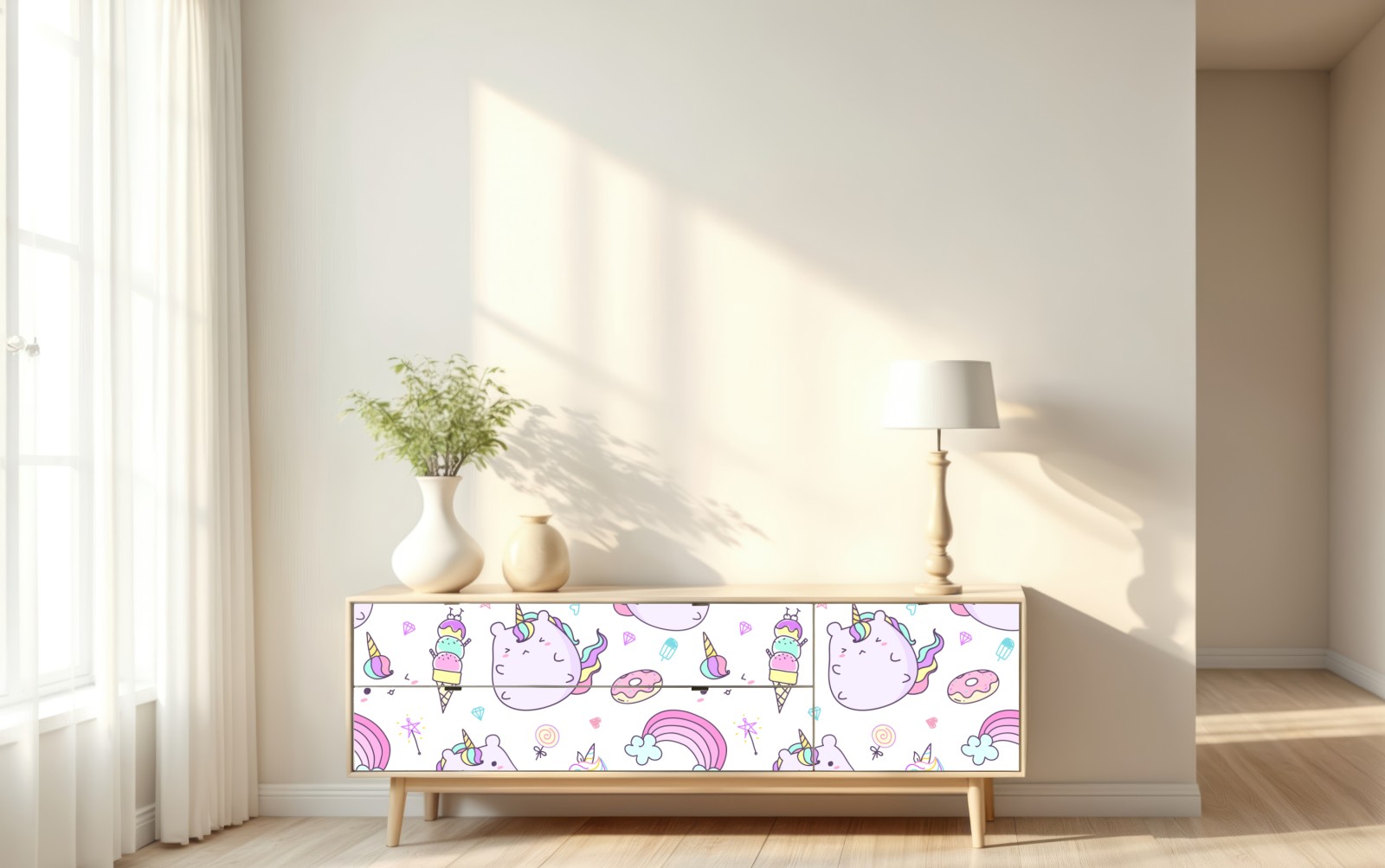 niedliches pastell-einhorn-katzenmuster bringt verspielten charme mit regenbögen und süßigkeiten ins kinderzimmer.