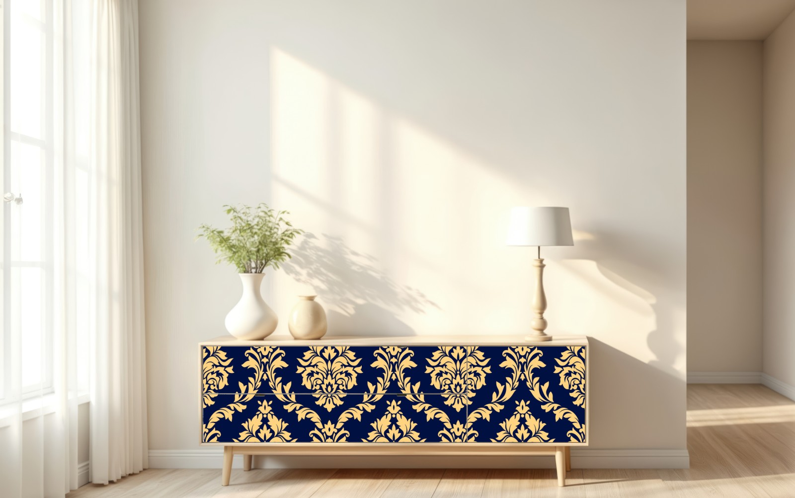 Luxuriöses goldenes Damastmuster auf tiefblauem Hintergrund verleiht jedem Raum klassische Eleganz und eignet sich ideal als Akzentwand.