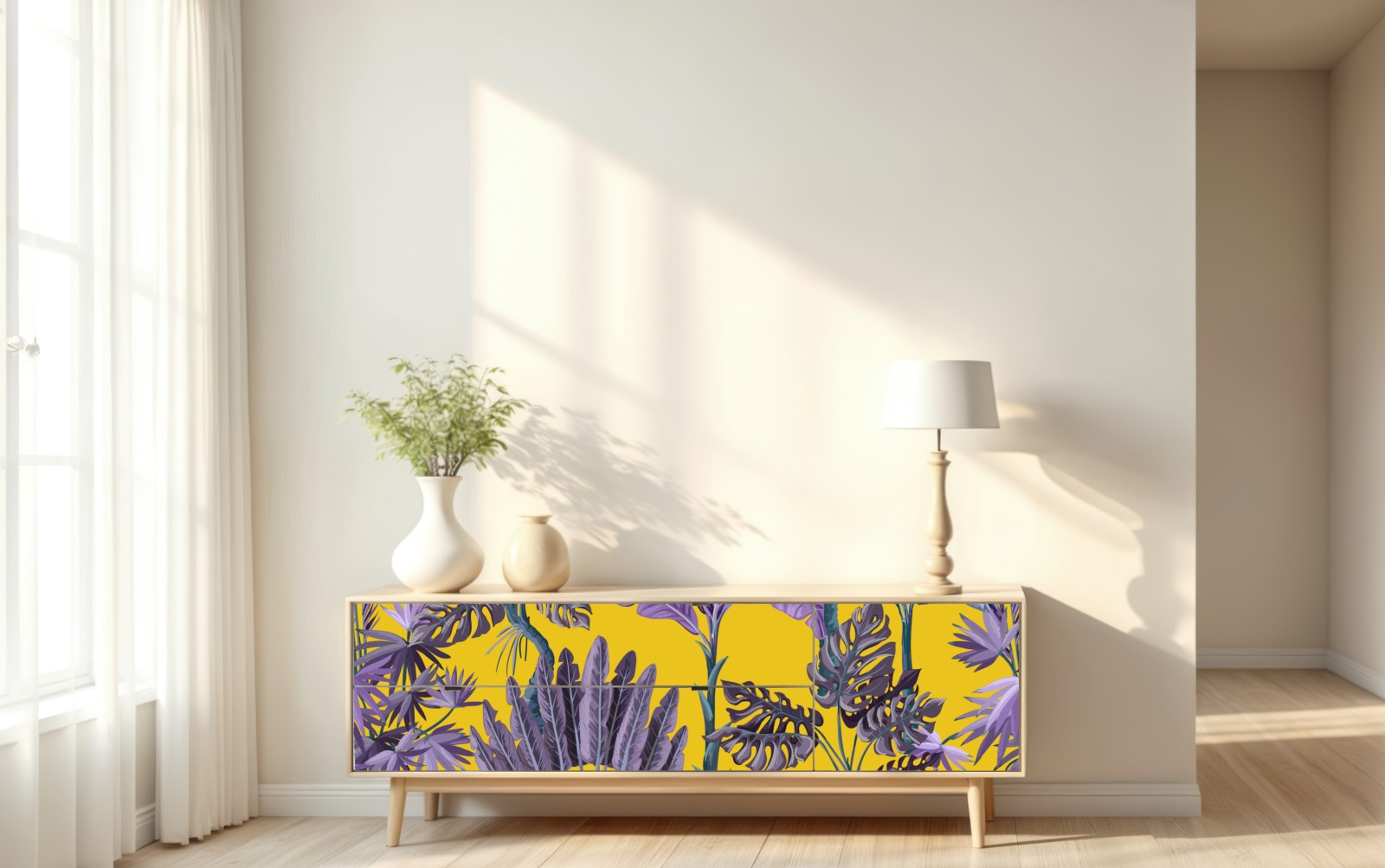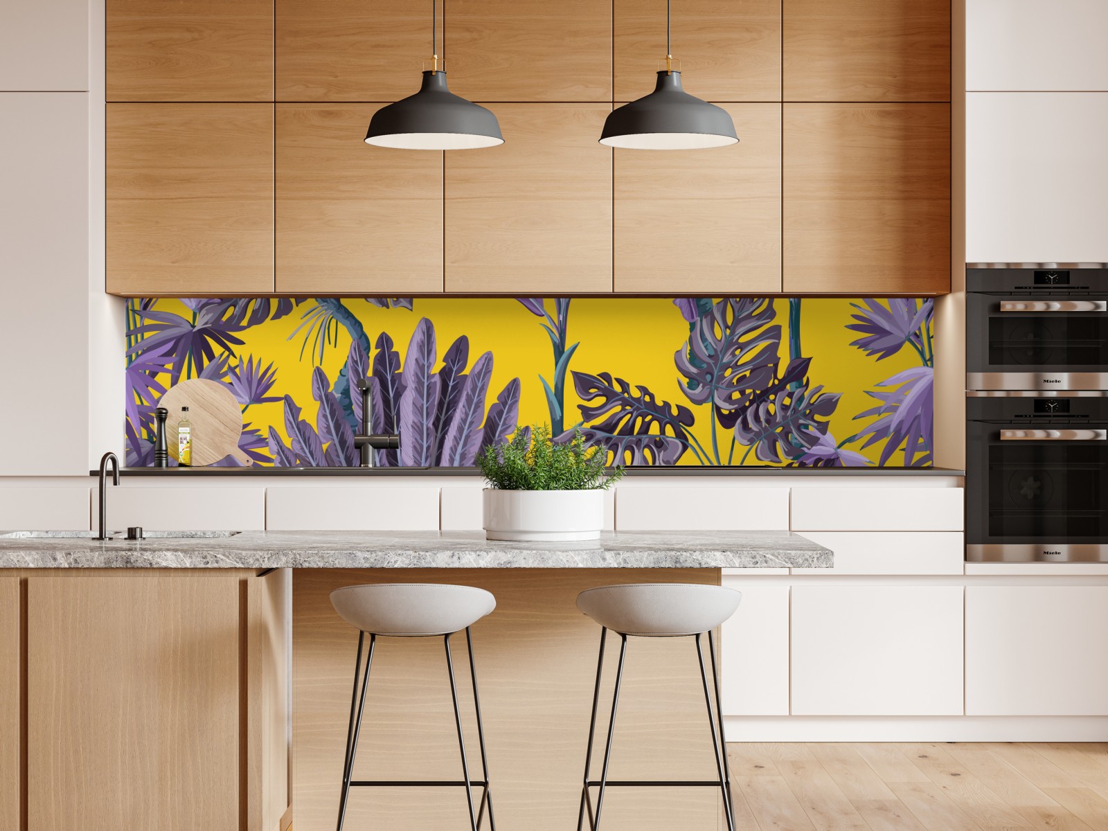 Kräftiges tropisches Blattmuster in lila Tönen auf sonnigem gelb schafft lebendige Akzente in jedem Raum.