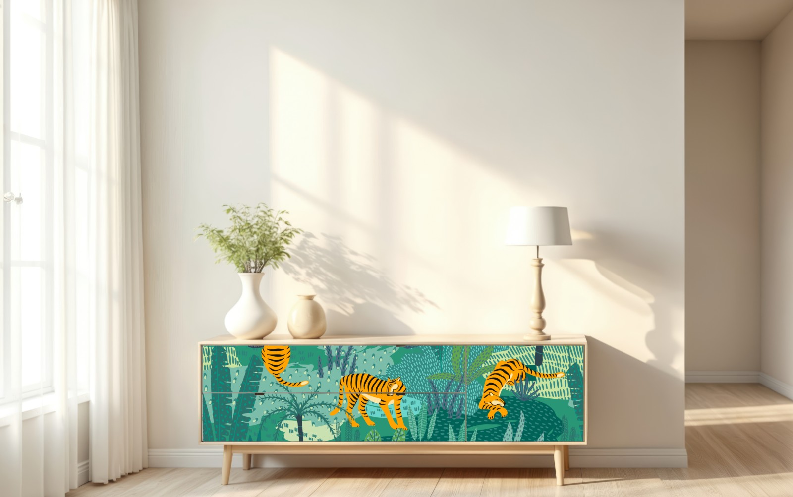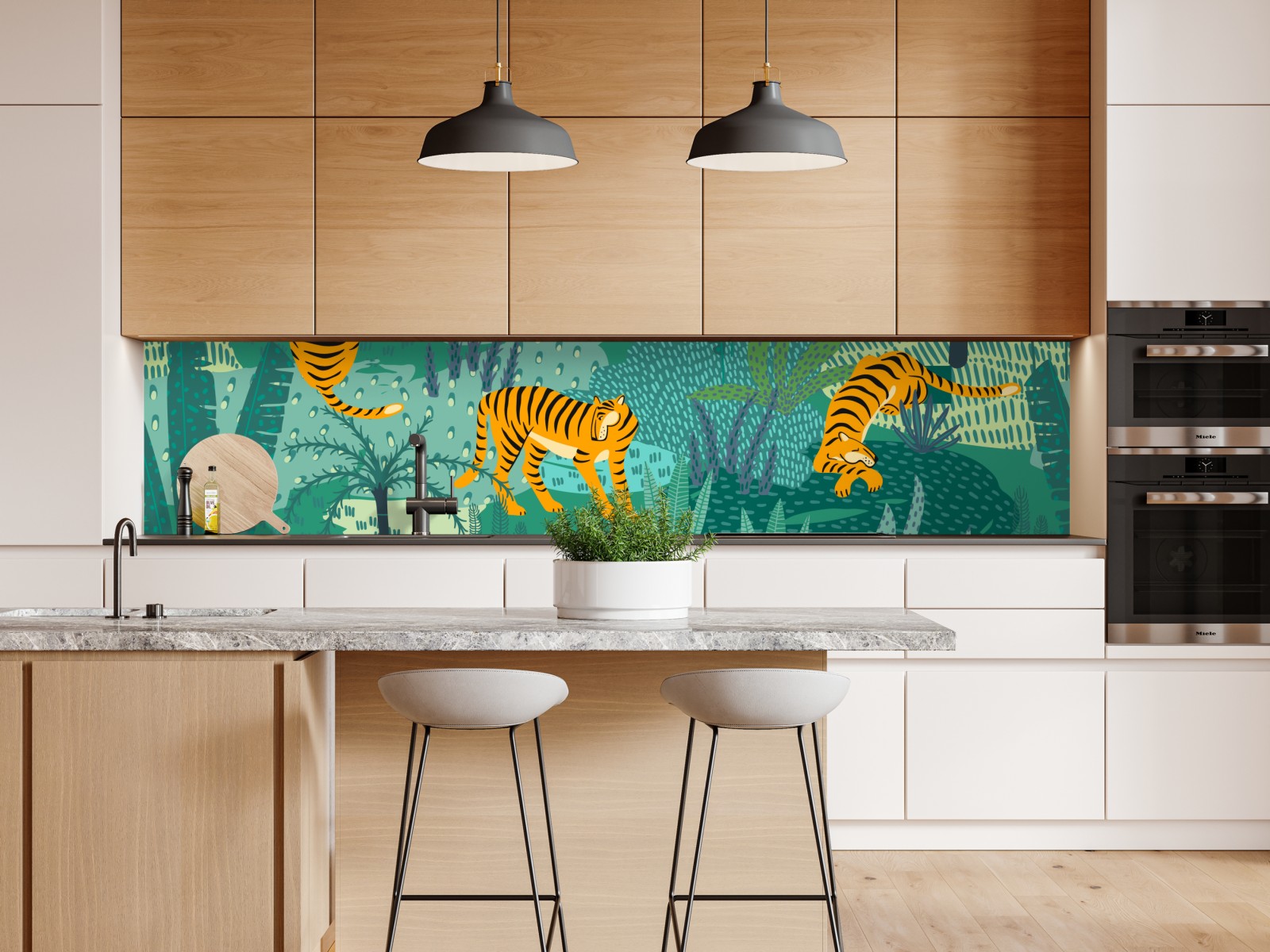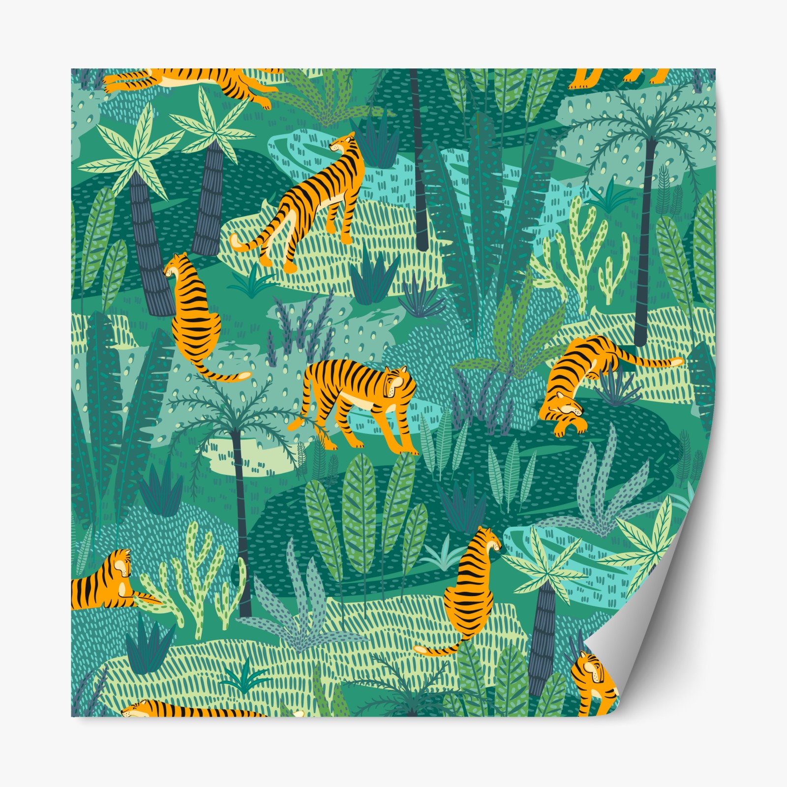 Lebendiges illustratives Muster mit Tigern und üppigem Blattwerk, ideal um Räumen einen natürlichen, fröhlichen Akzent zu verleihen.