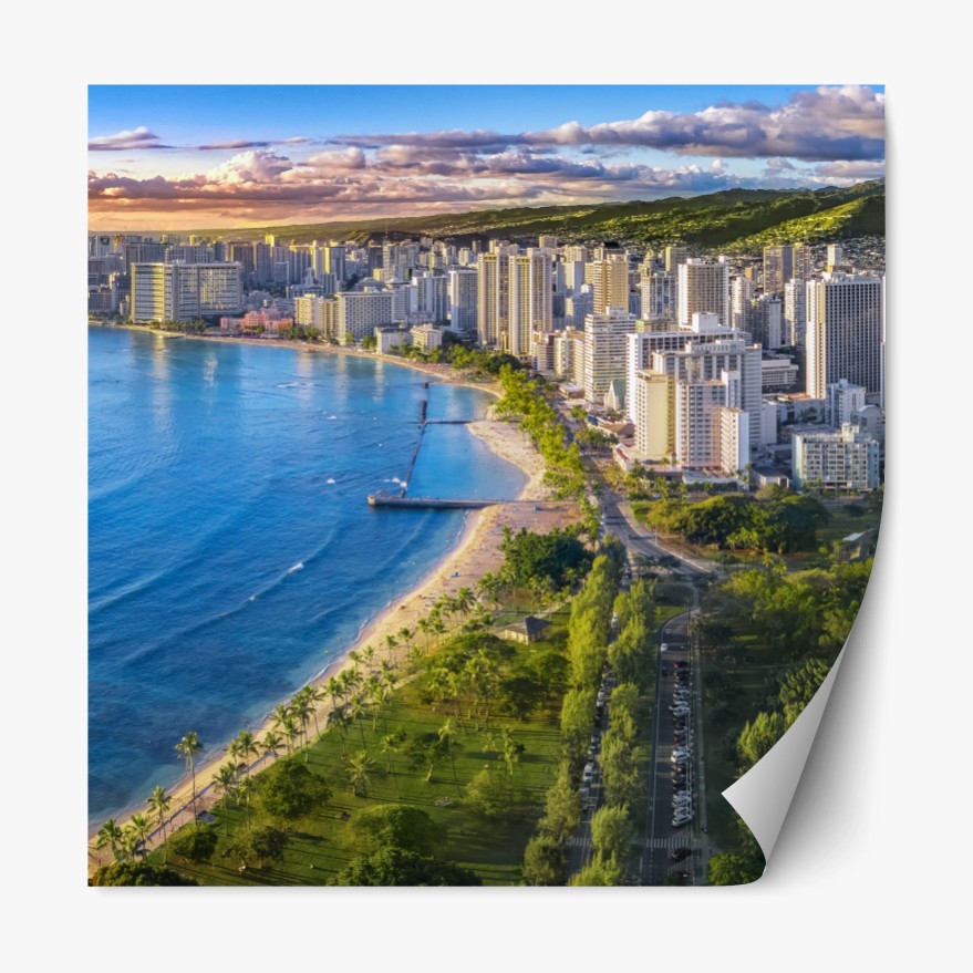 Repositionierbarer Aufkleber Skyline einer küstenstadt bei sonnenuntergang