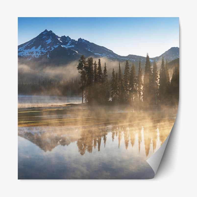 Repositionierbarer Aufkleber Nebliger bergspiegel am see bei sonnenaufgang