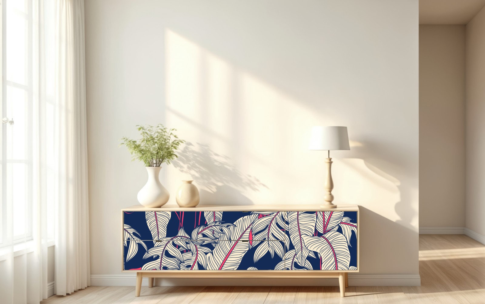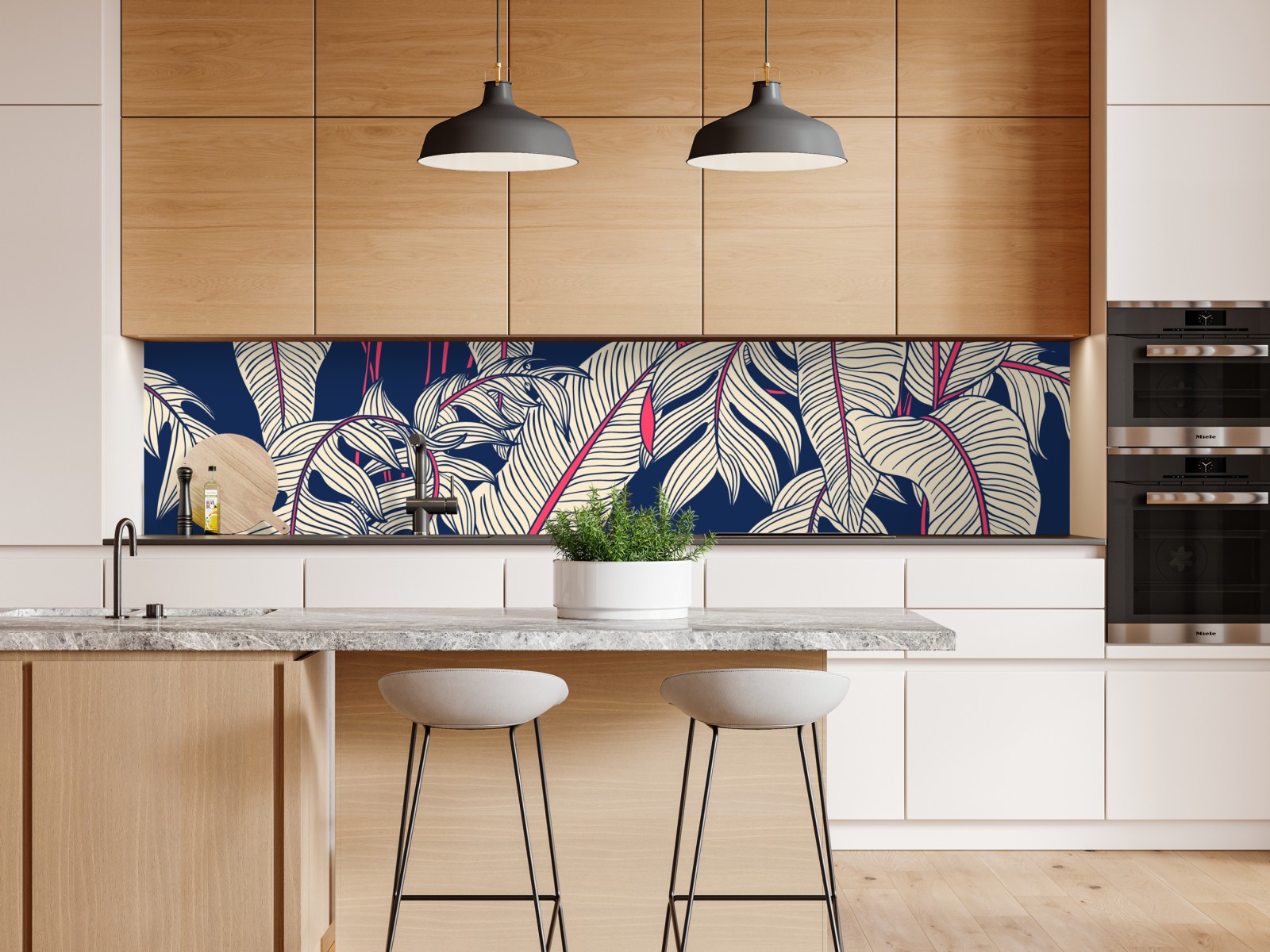 Kräftiges tropisches Blattmotiv in Marineblau, Creme und Rosa verleiht jedem Raum modernen botanischen Charme.