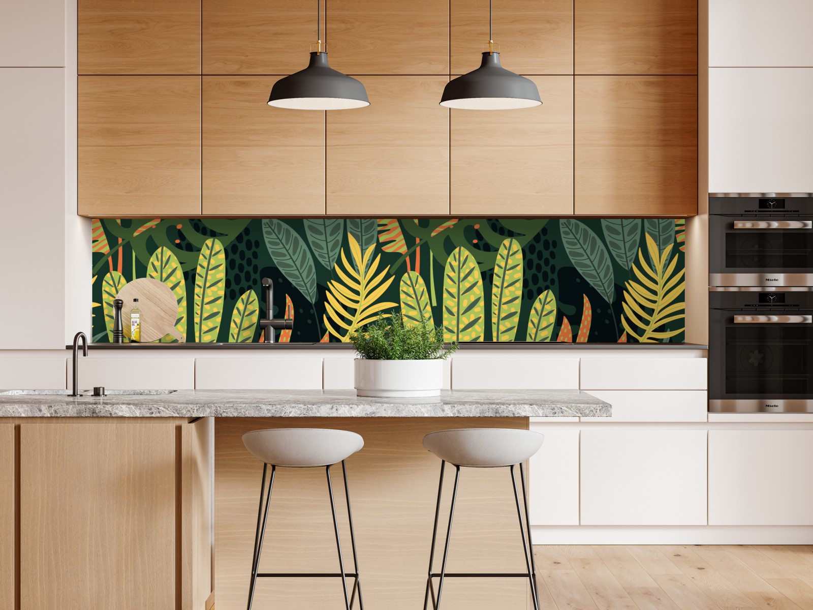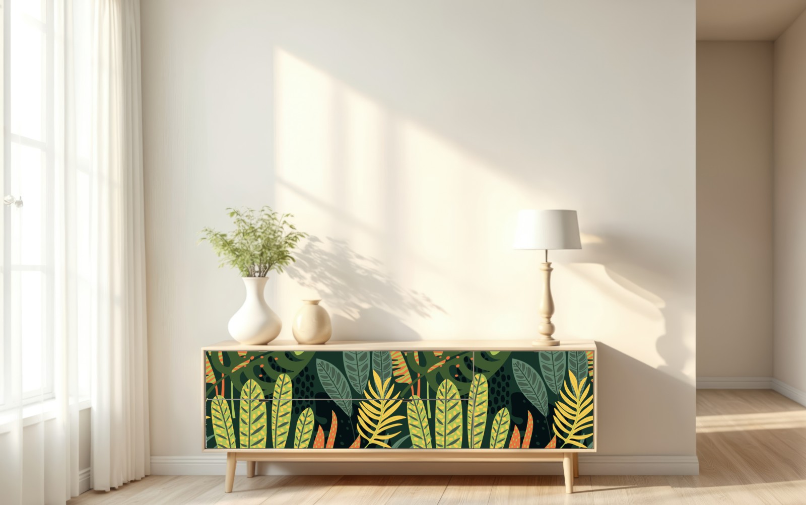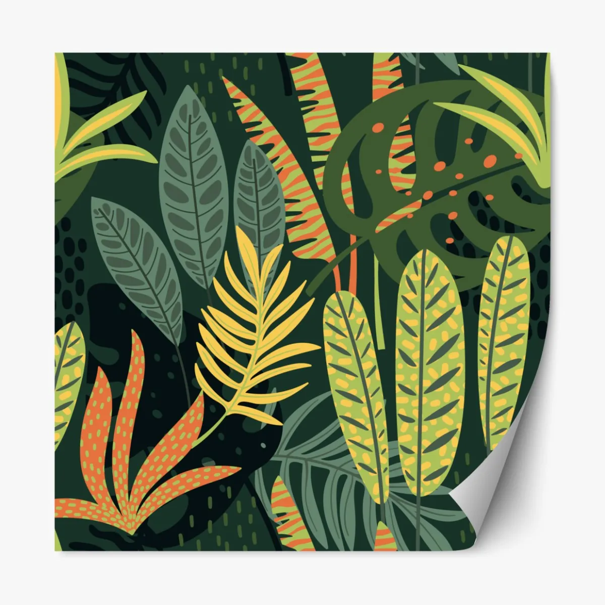 Ein lebendiges tropisches Blättermuster, das üppige botanische Atmosphäre und beruhigendes Grün in jeden Raum bringt.
