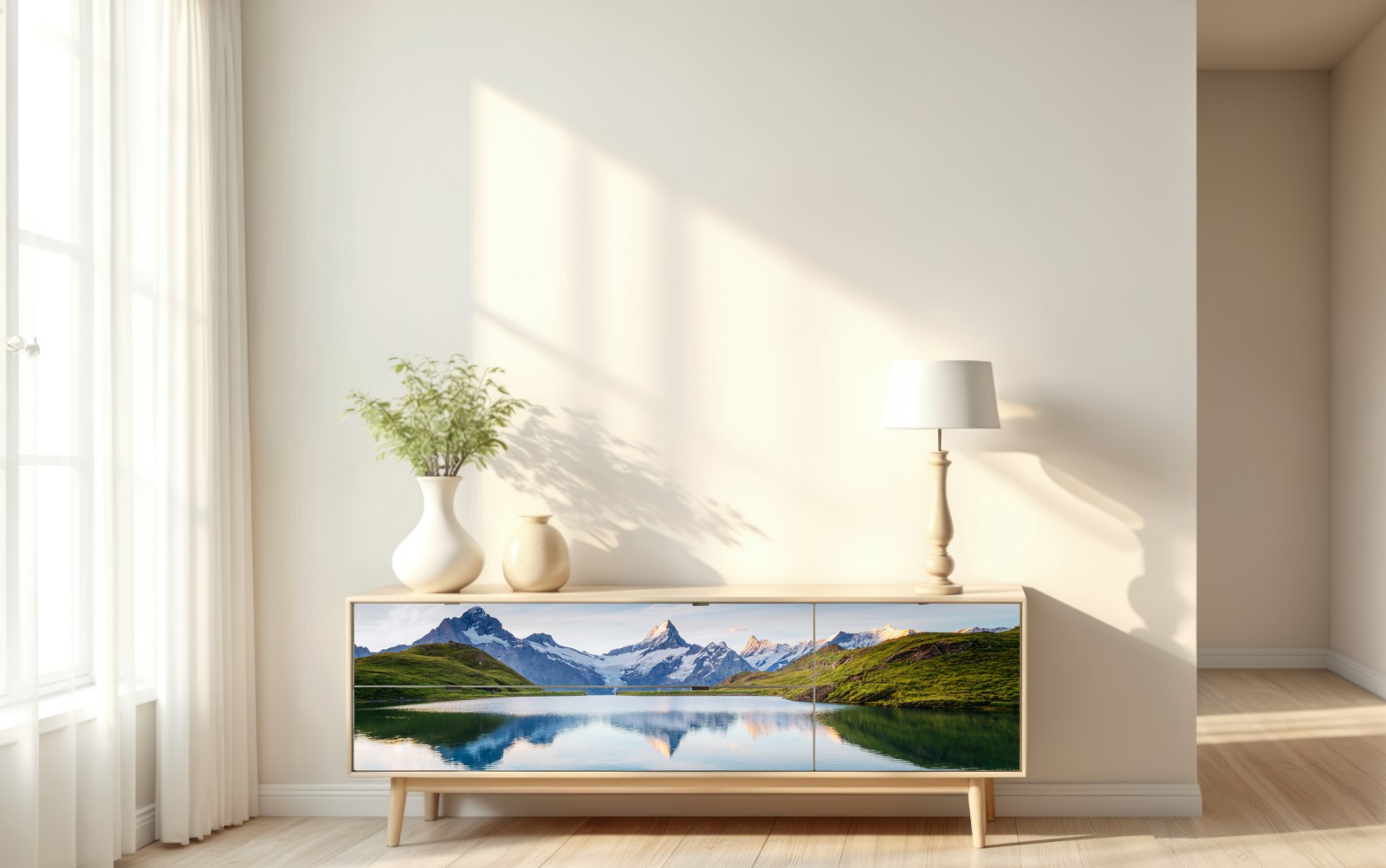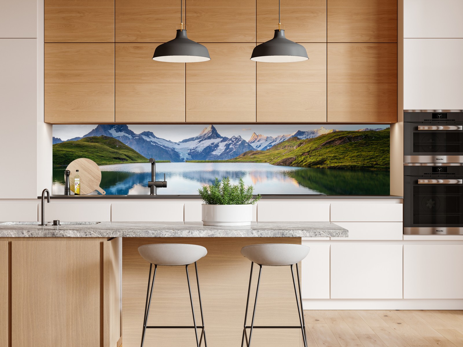 Ein ruhiges Panorama des Bachalpsees mit spiegelnden Gipfeln und klaren Wassern, das alpine Gelassenheit und natürliche Schönheit in jeden Raum bringt.