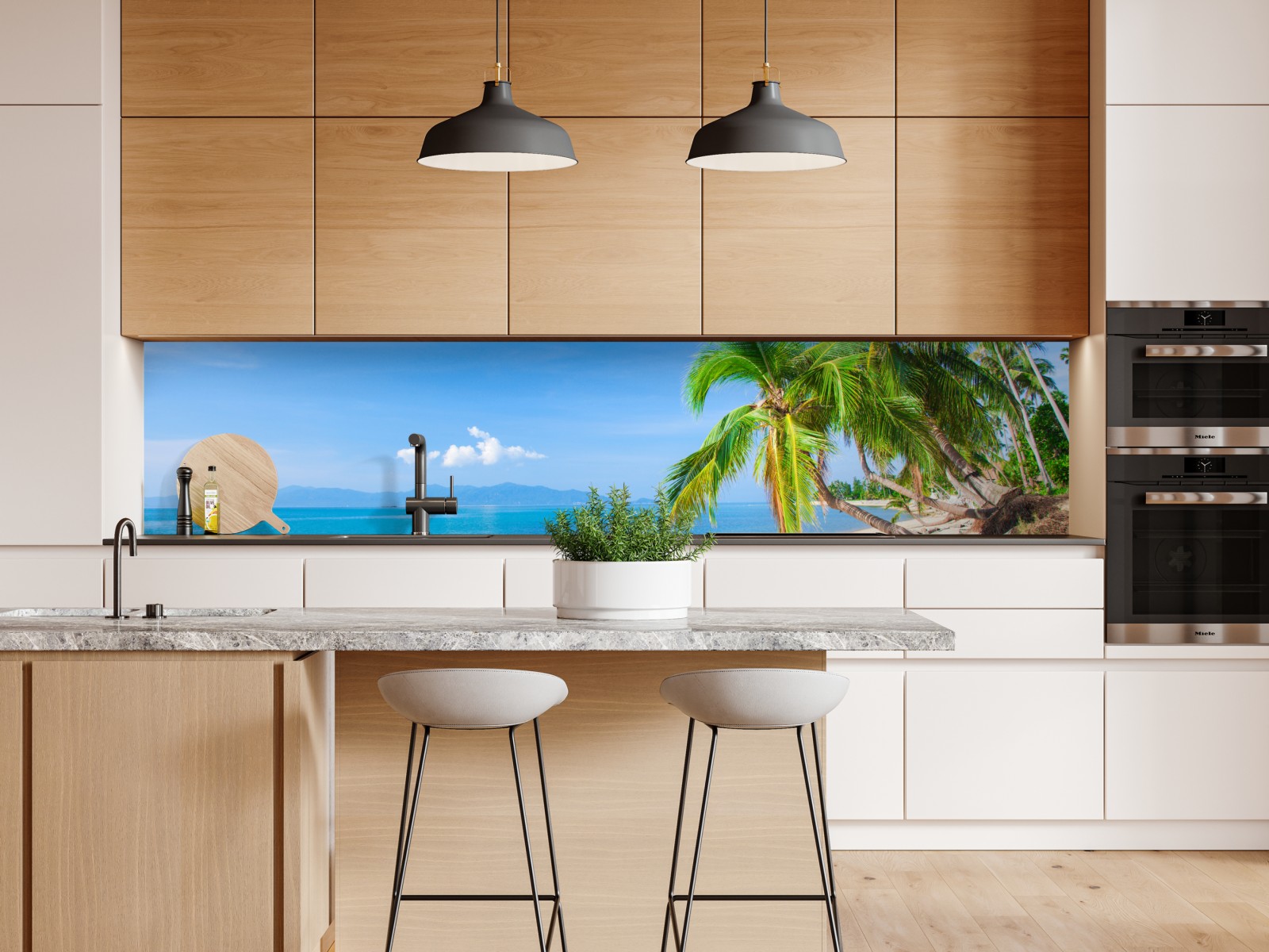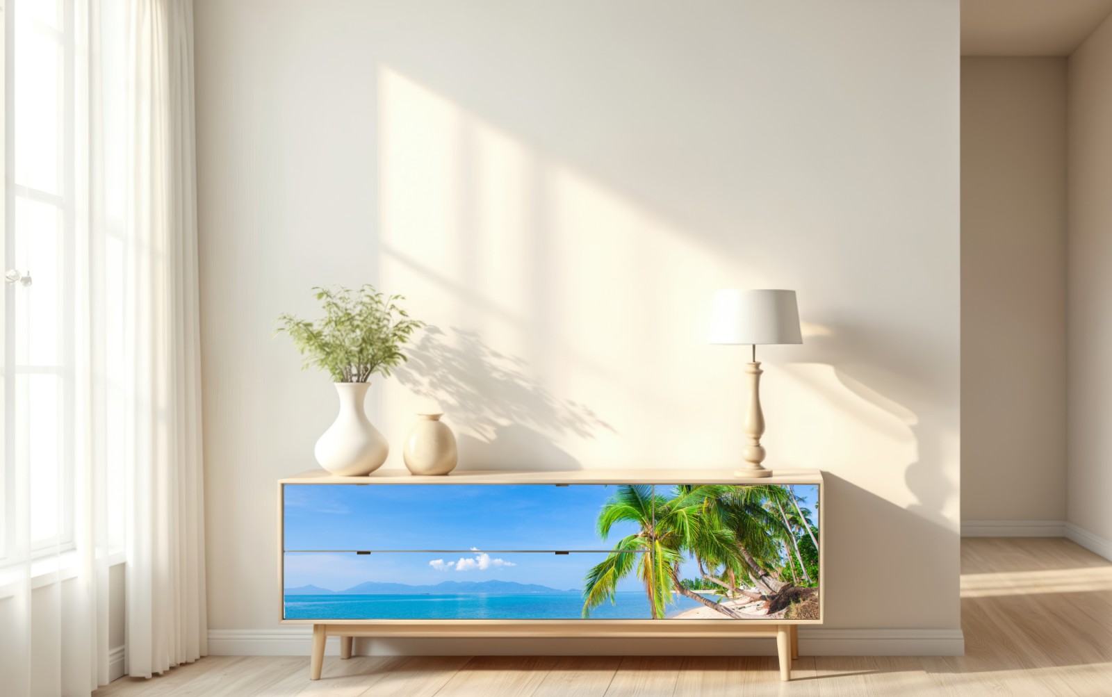 Helles tropisches Strandmotiv mit wiegenden Palmen und türkisfarbenem Meer, das eine beruhigende Küstenatmosphäre in jeden Raum bringt.