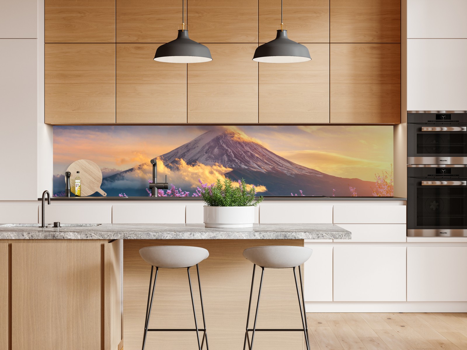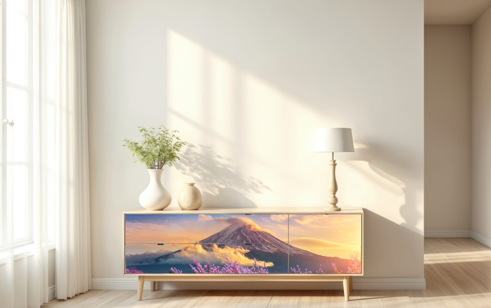 Ein atemberaubender blick auf Berg Fuji, eingerahmt von blühenden kirschblüten bei sonnenaufgang, bringt ruhige natürliche schönheit in jeden raum.