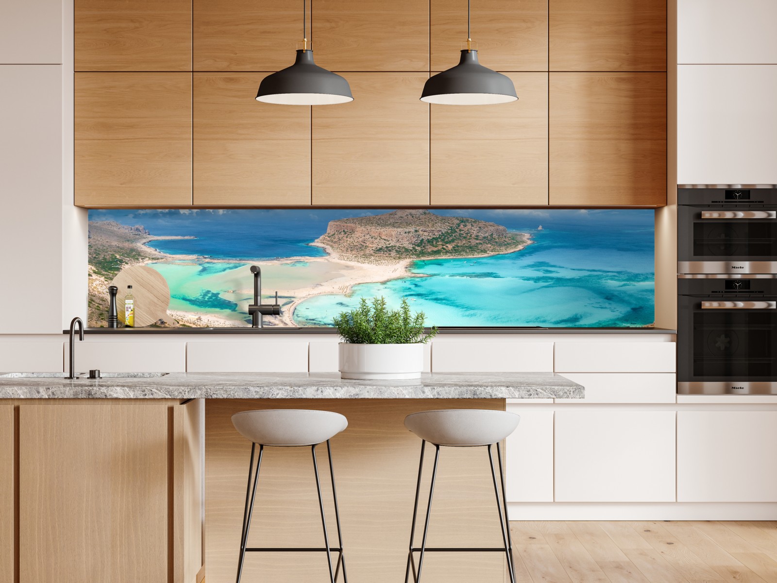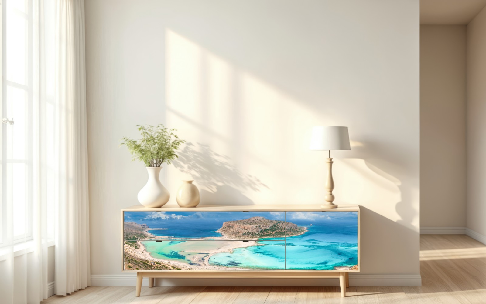 Holen Sie das sanfte Türkiswasser und die sonnigen Strände von Balos Lagoon in Ihren Raum mit diesem panoramischen Küstenmotiv, das Ruhe und Urlaubsgefühl vermittelt.