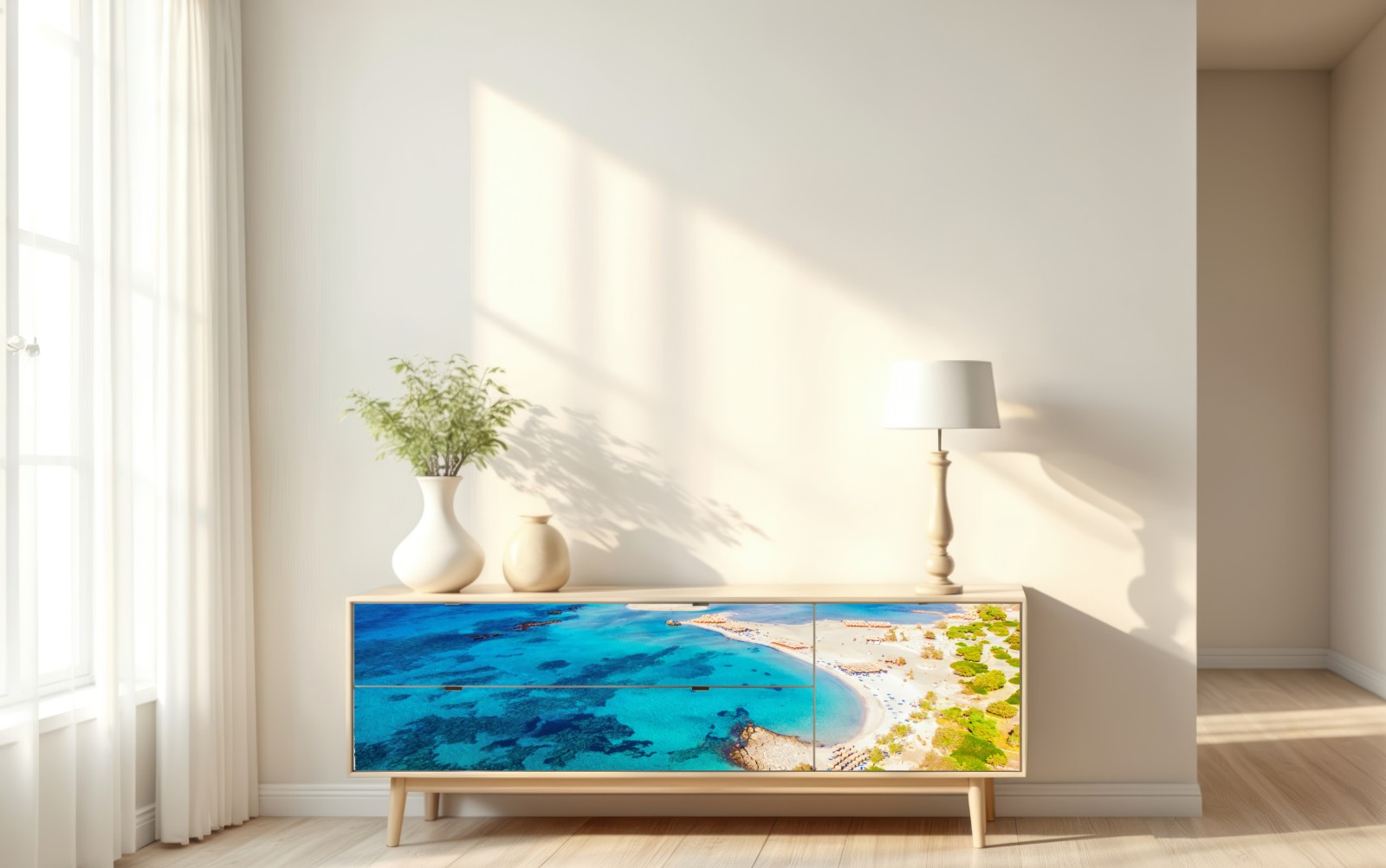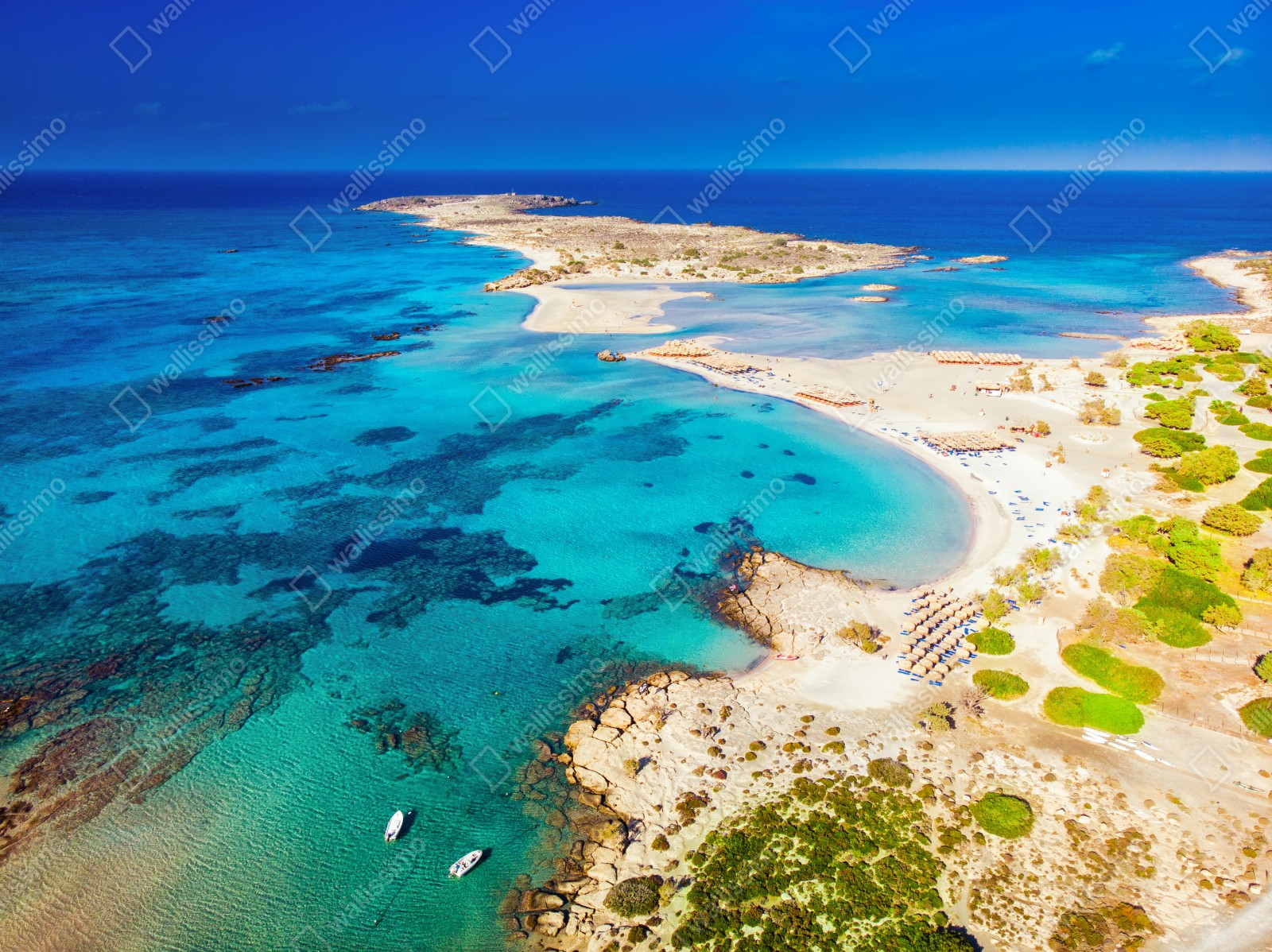 Bringen Sie mediterrane Ruhe in Ihr Zuhause mit dieser Luftaufnahme des Elafonissi-Strandes auf Kreta mit kristallklarem türkisfarbenem Wasser und weichem Sand.