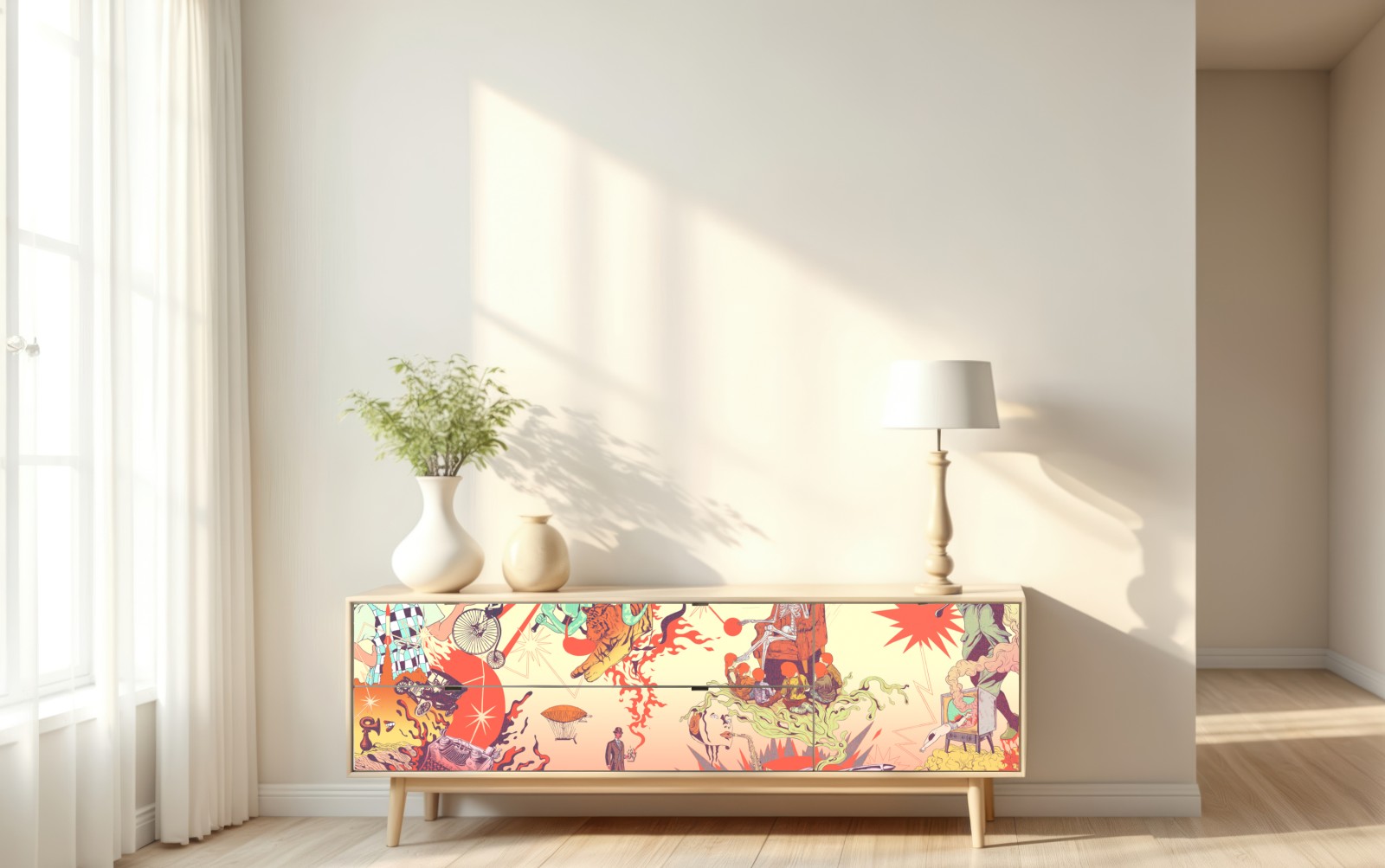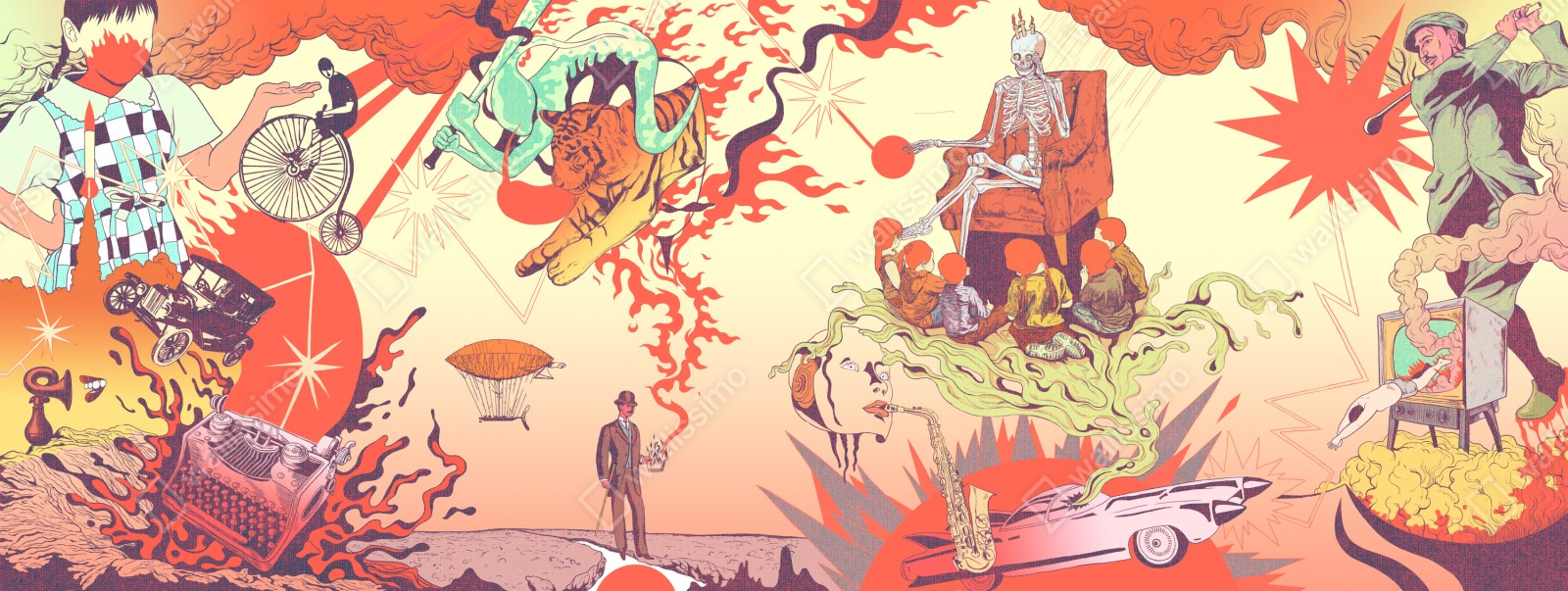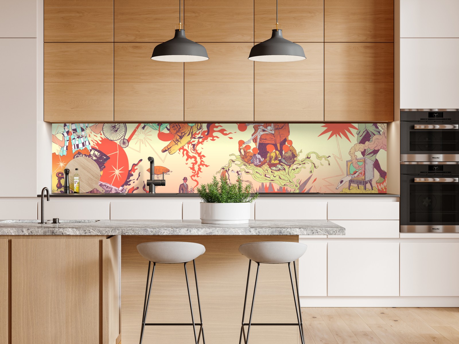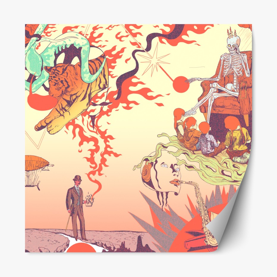 Kräftige psychedelische Collage im Retro-Look, die surreale Geschichten und lebendige Farben an Ihre Wände bringt. Perfekt als auffälliger Blickfang im modernen Wohnzimmer.