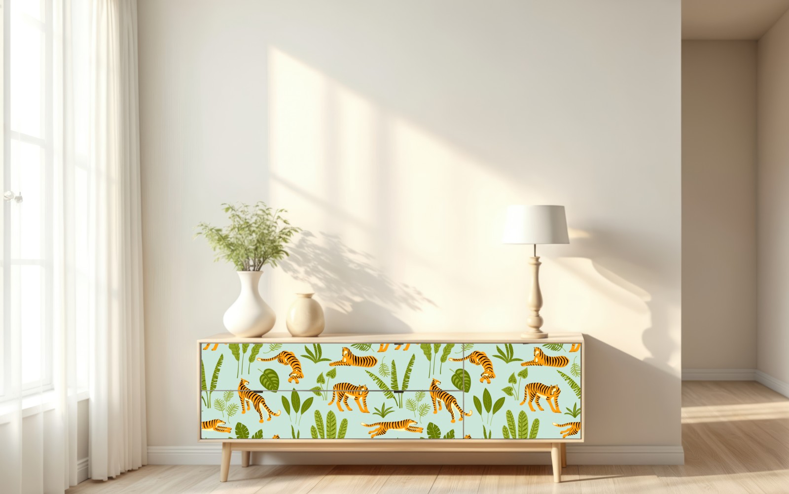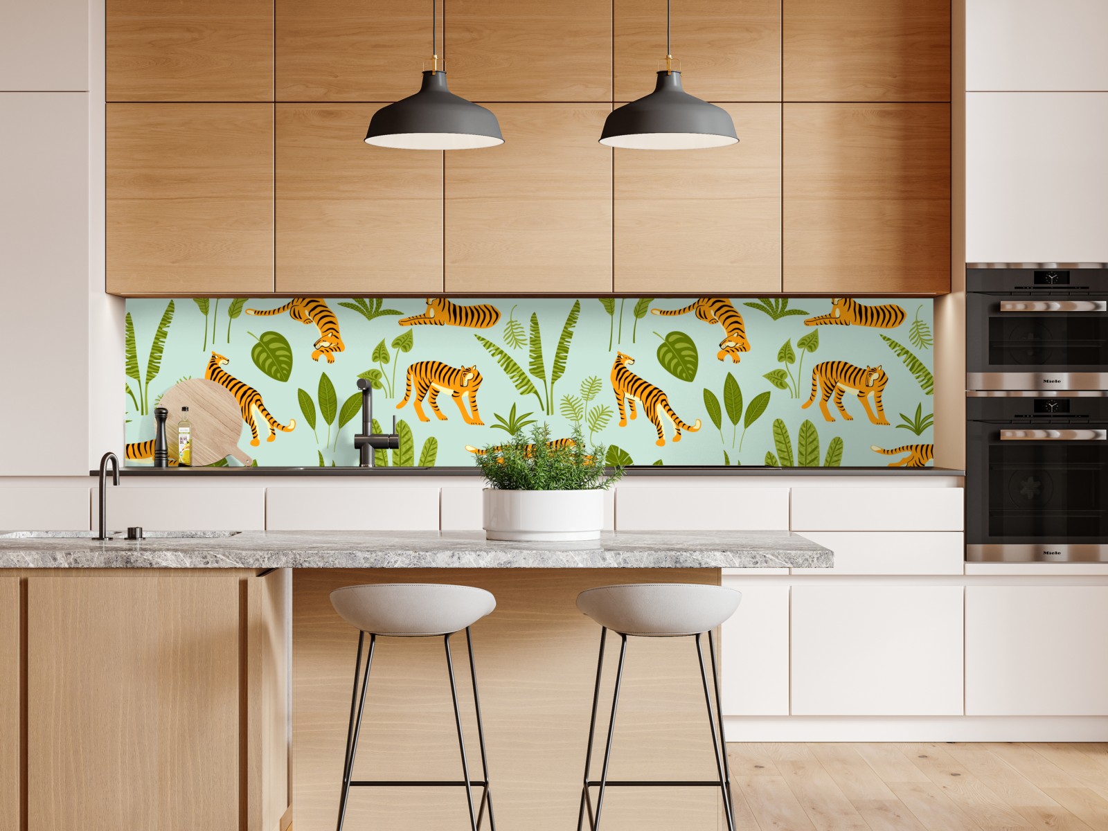 Fröhliches Muster mit Tigern und tropischen Blättern bringt einen verspielten Dschungelstil in Kinderzimmer oder Wohnräume.