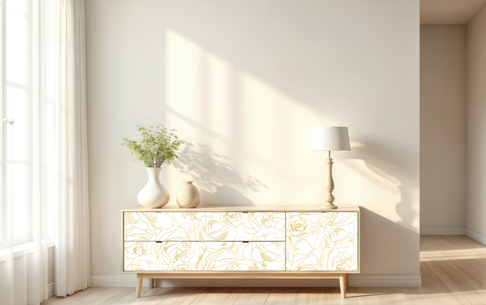 Feine goldene Linien zeichnen Rosen auf hellem Hintergrund und verleihen jedem Raum eine elegante, moderne botanische Note.