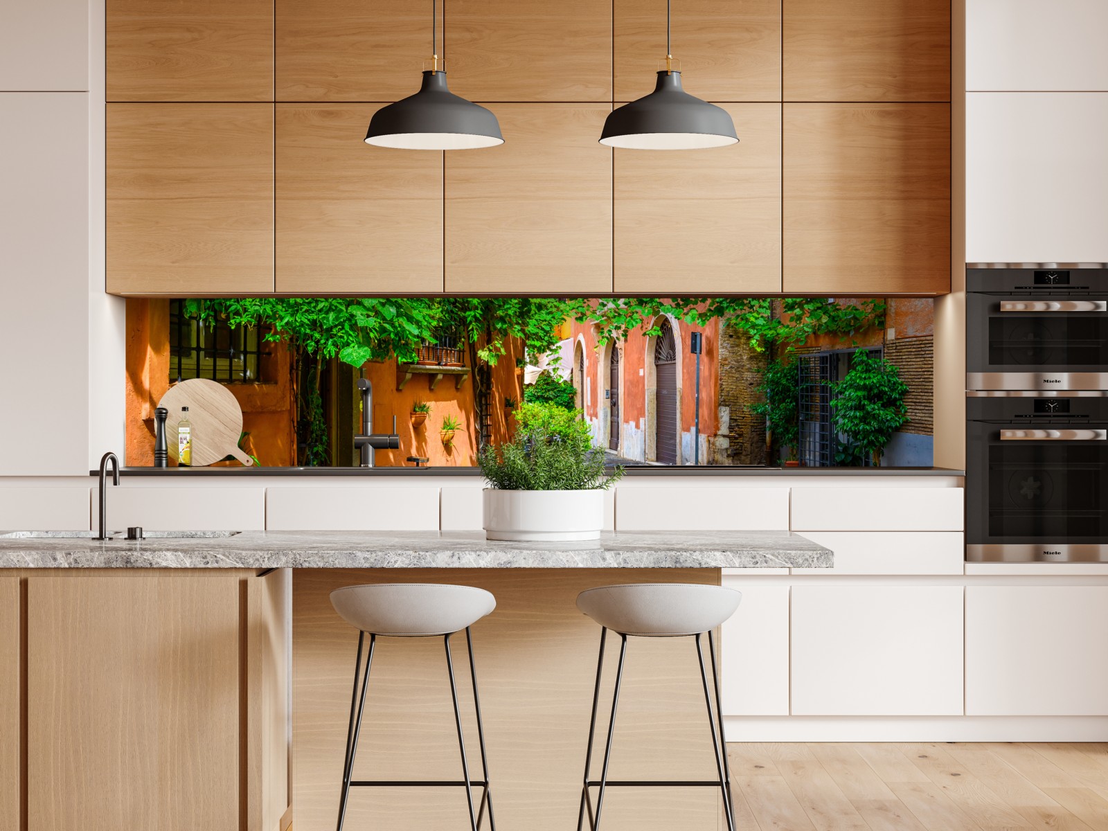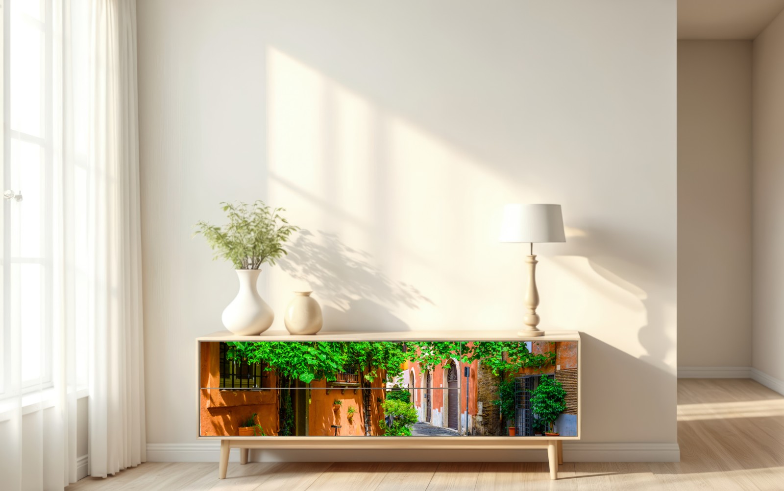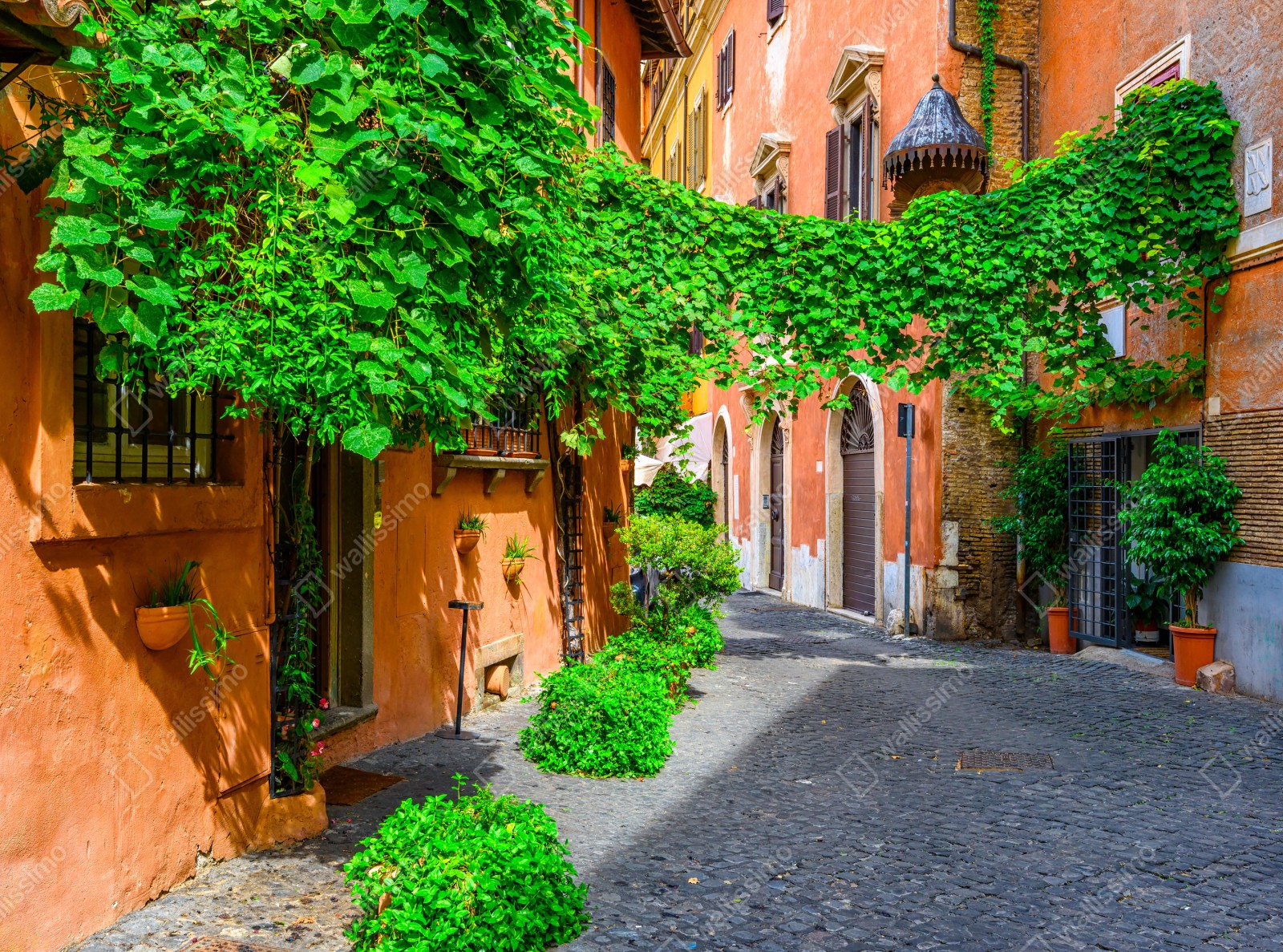 Eine sonnenverwöhnte Kopfsteinpflastergasse in Trastevere, Rom mit üppigem Grün und warmen terrakottafarbenen Fassaden, die mediterranes Flair in Ihren Raum bringt.