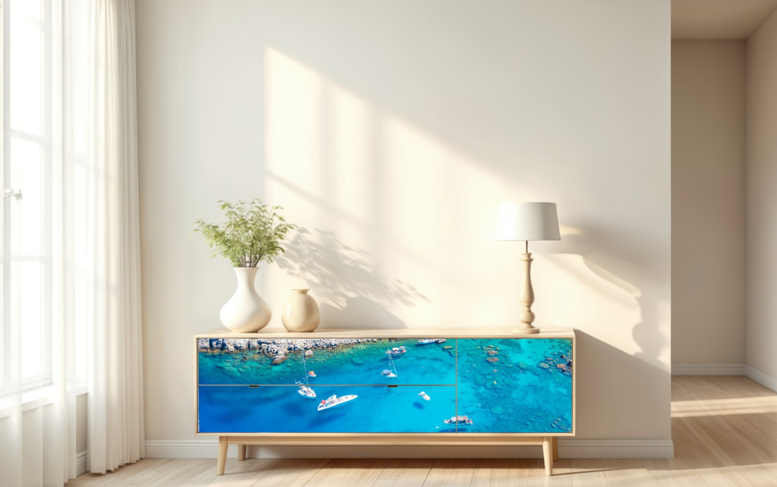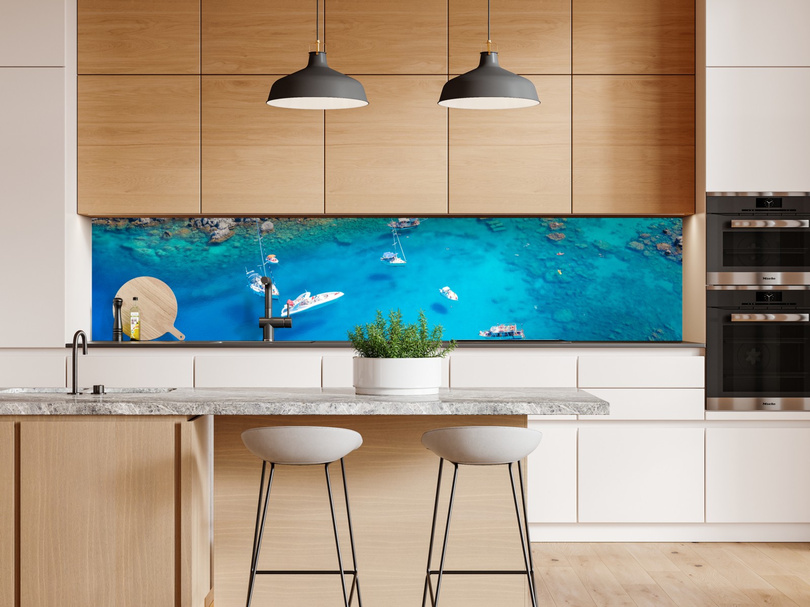 Bringen Sie das leuchtende türkisfarbene Wasser der Anthony Quinn Bucht in Rhodos in Ihr Zuhause mit dieser beeindruckenden Luftaufnahme, die jedem Raum ein mediterranes Flair verleiht.