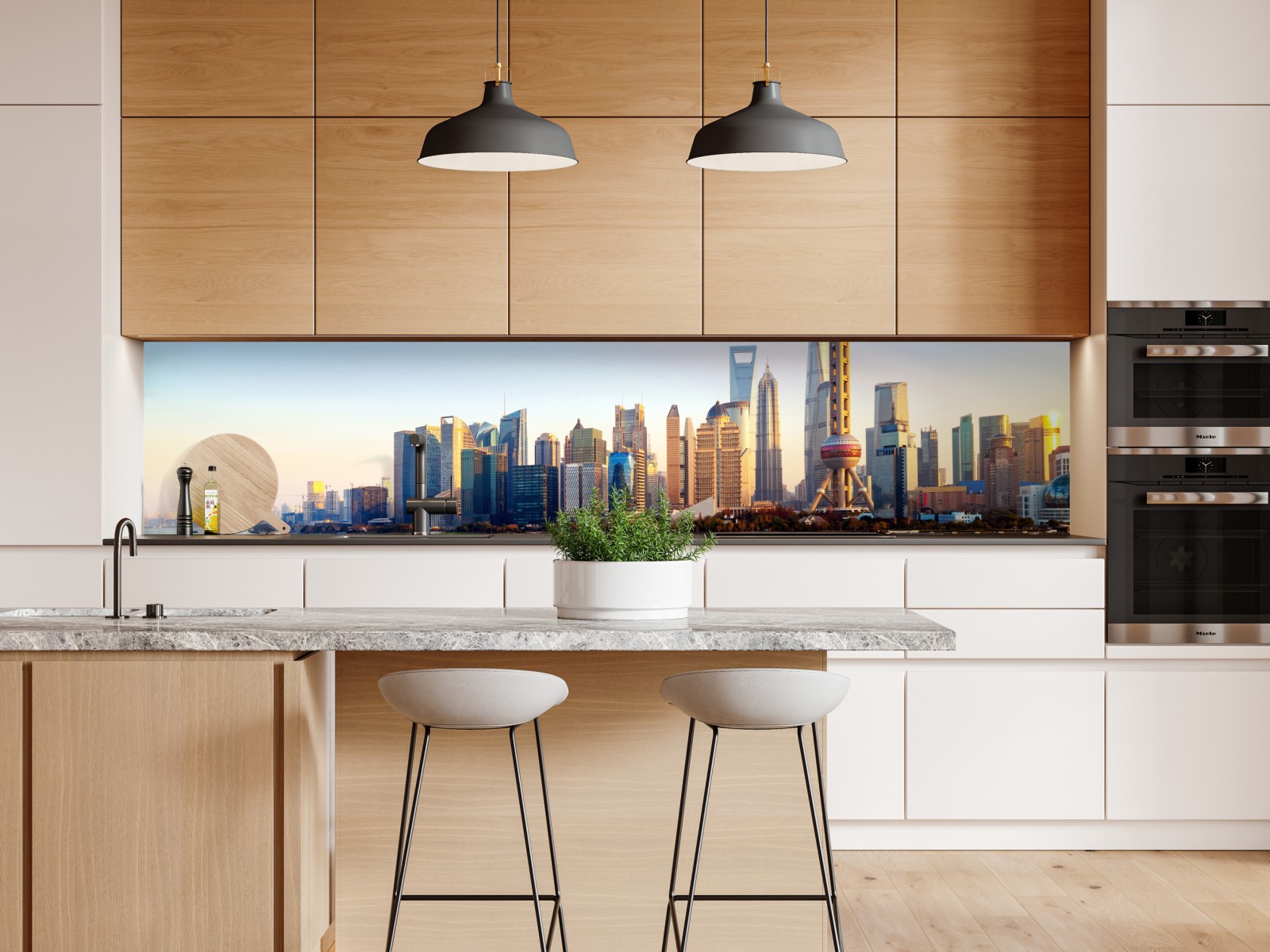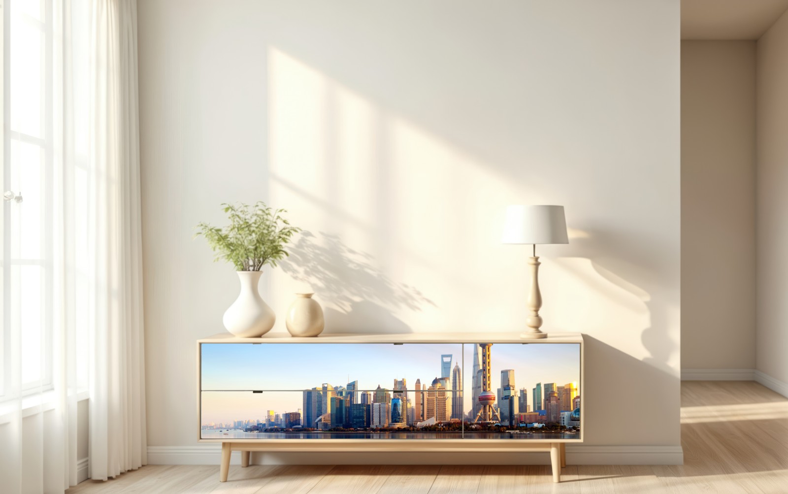 Eine ruhige Panoramaansicht der modernen Skyline von Shanghai, reflektiert im ruhigen Wasser und ideal für urbanes Ambiente.