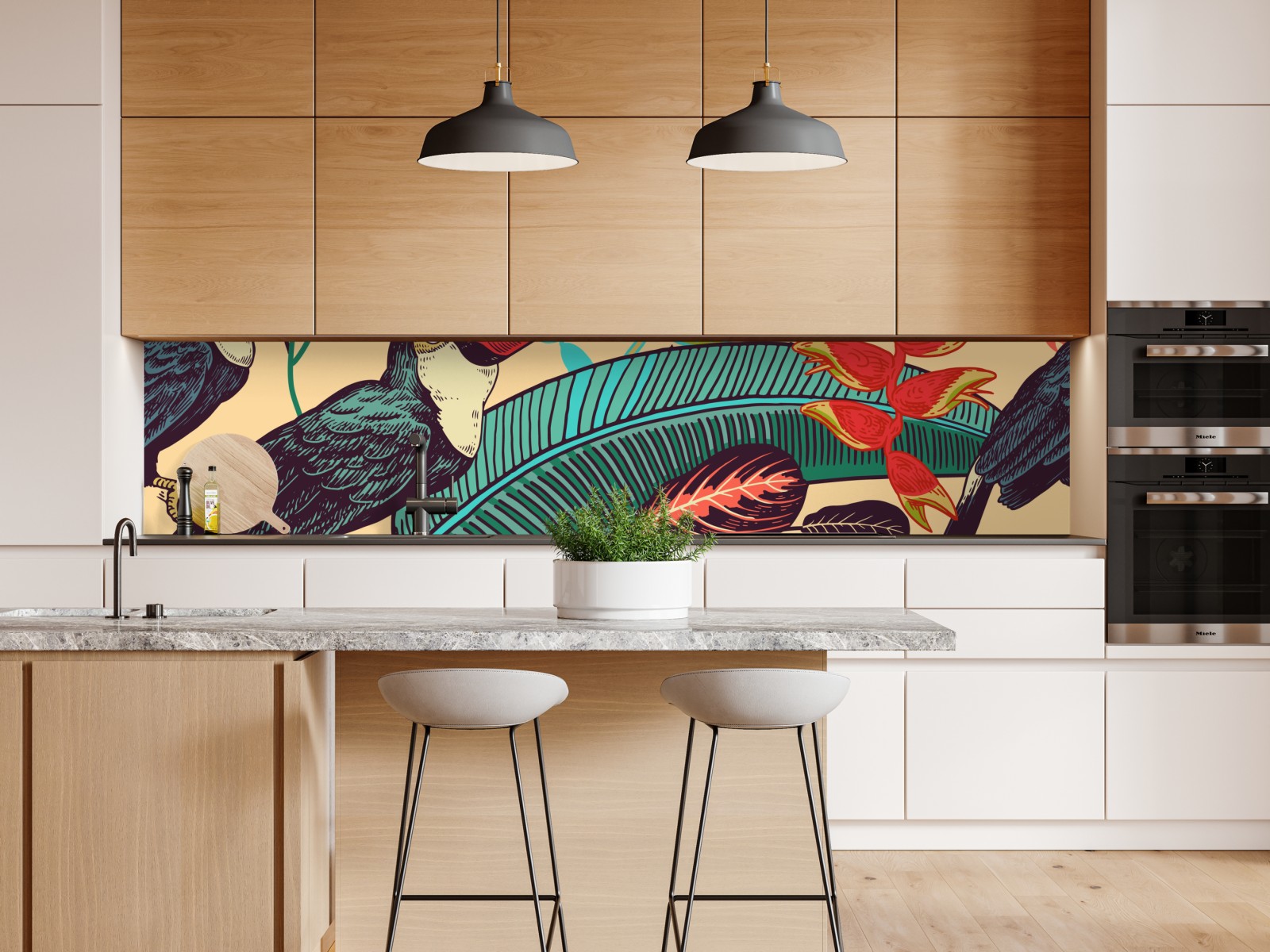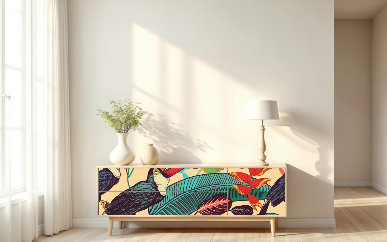 Lebendige tropische illustration mit tukanen und üppigem blattwerk, die exotische farben und verspielte energie in jeden raum bringt.