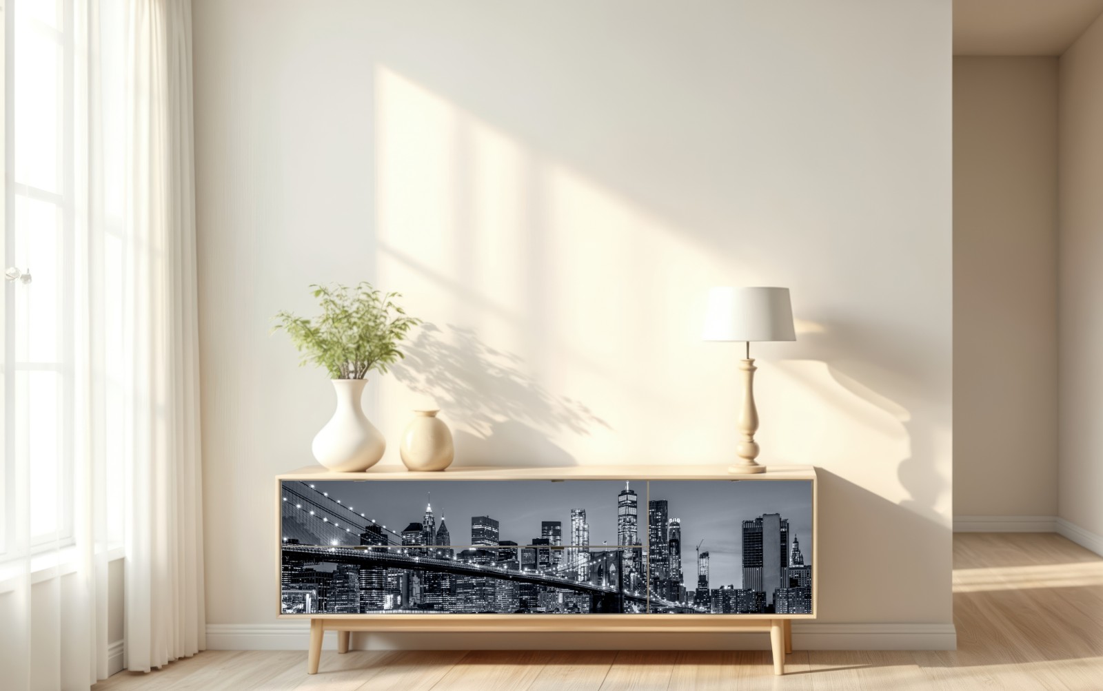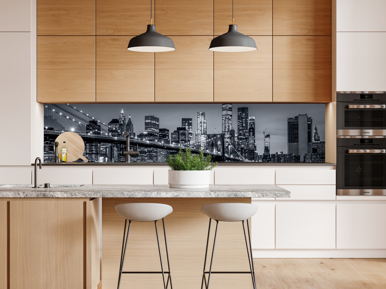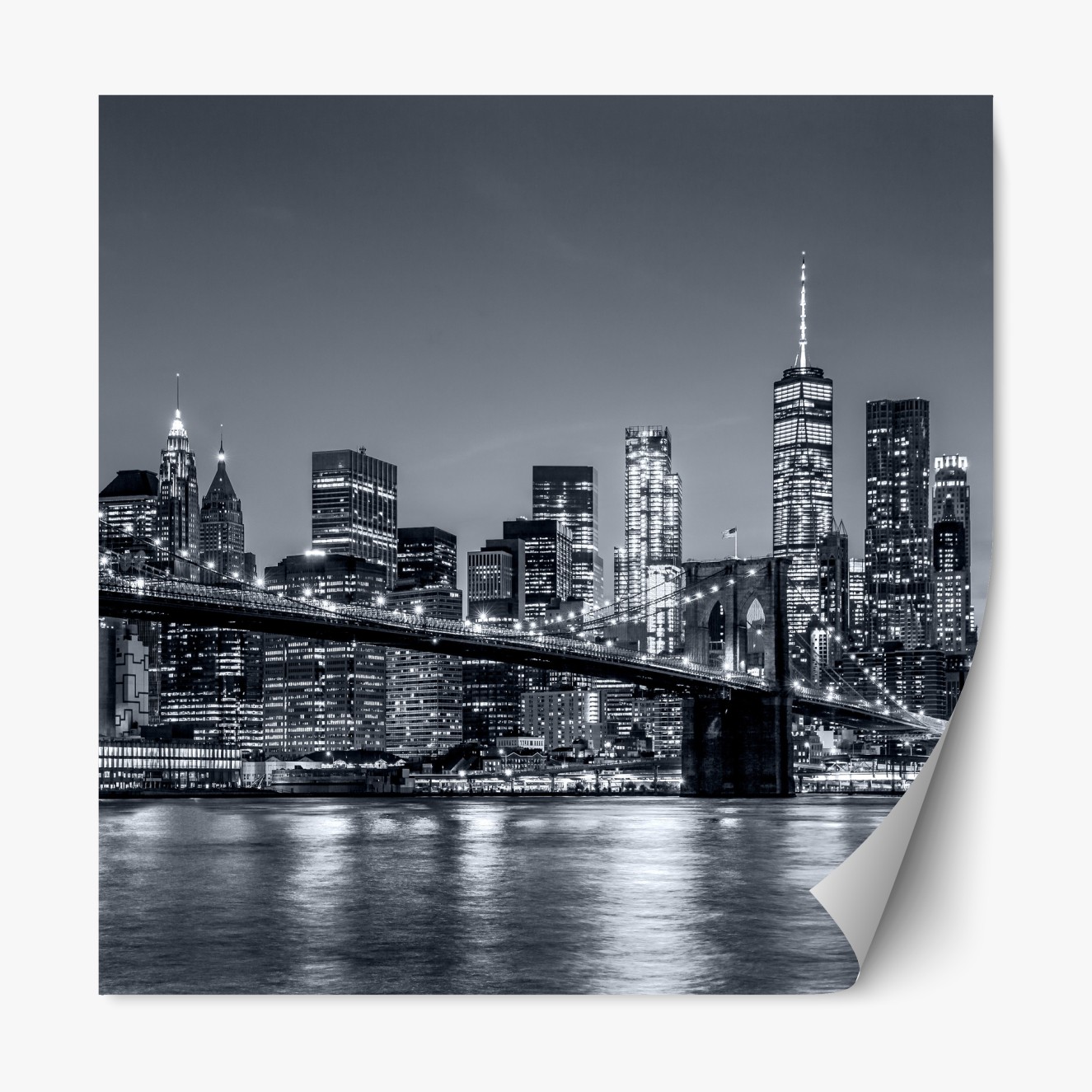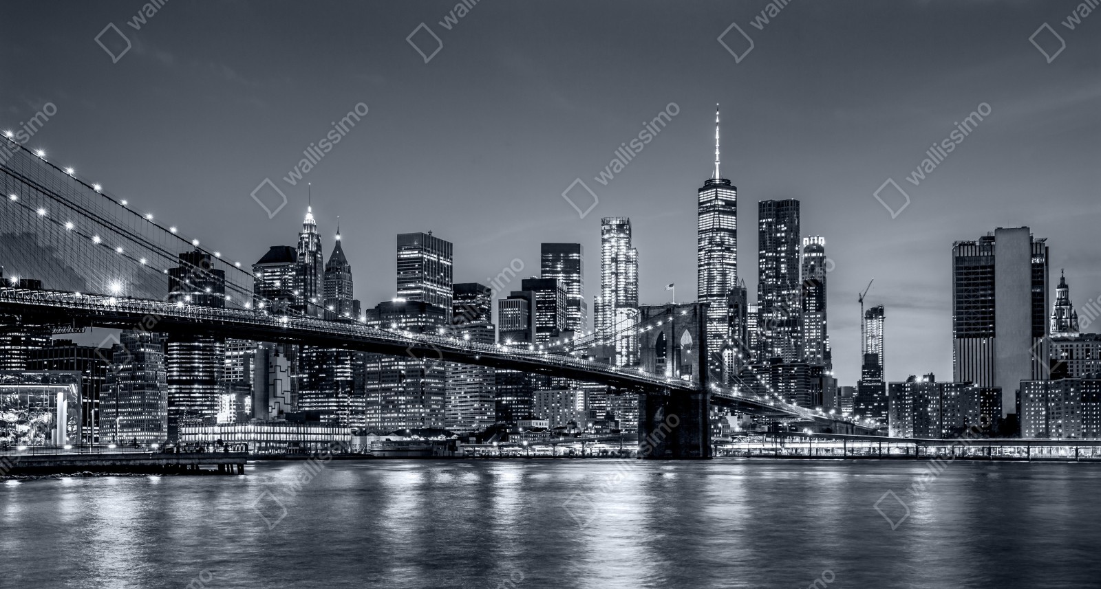 Beeindruckende schwarzweiße Panoramaaufnahme von New York und der Brooklyn Bridge, ideal für moderne Wohnräume.