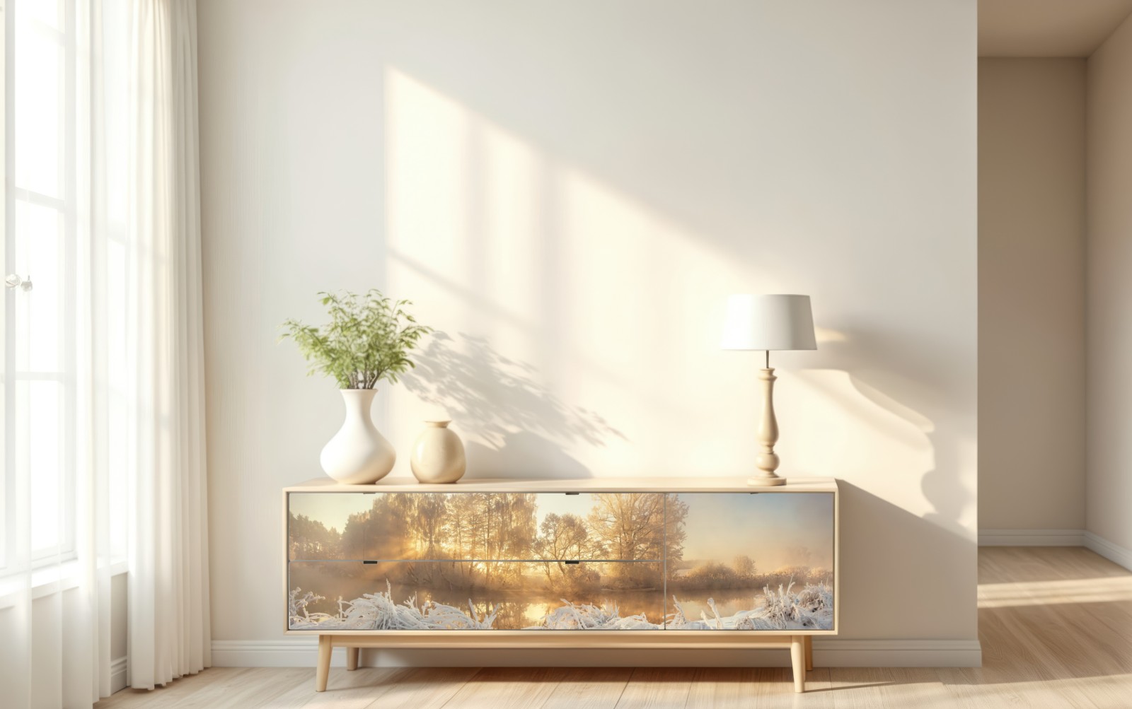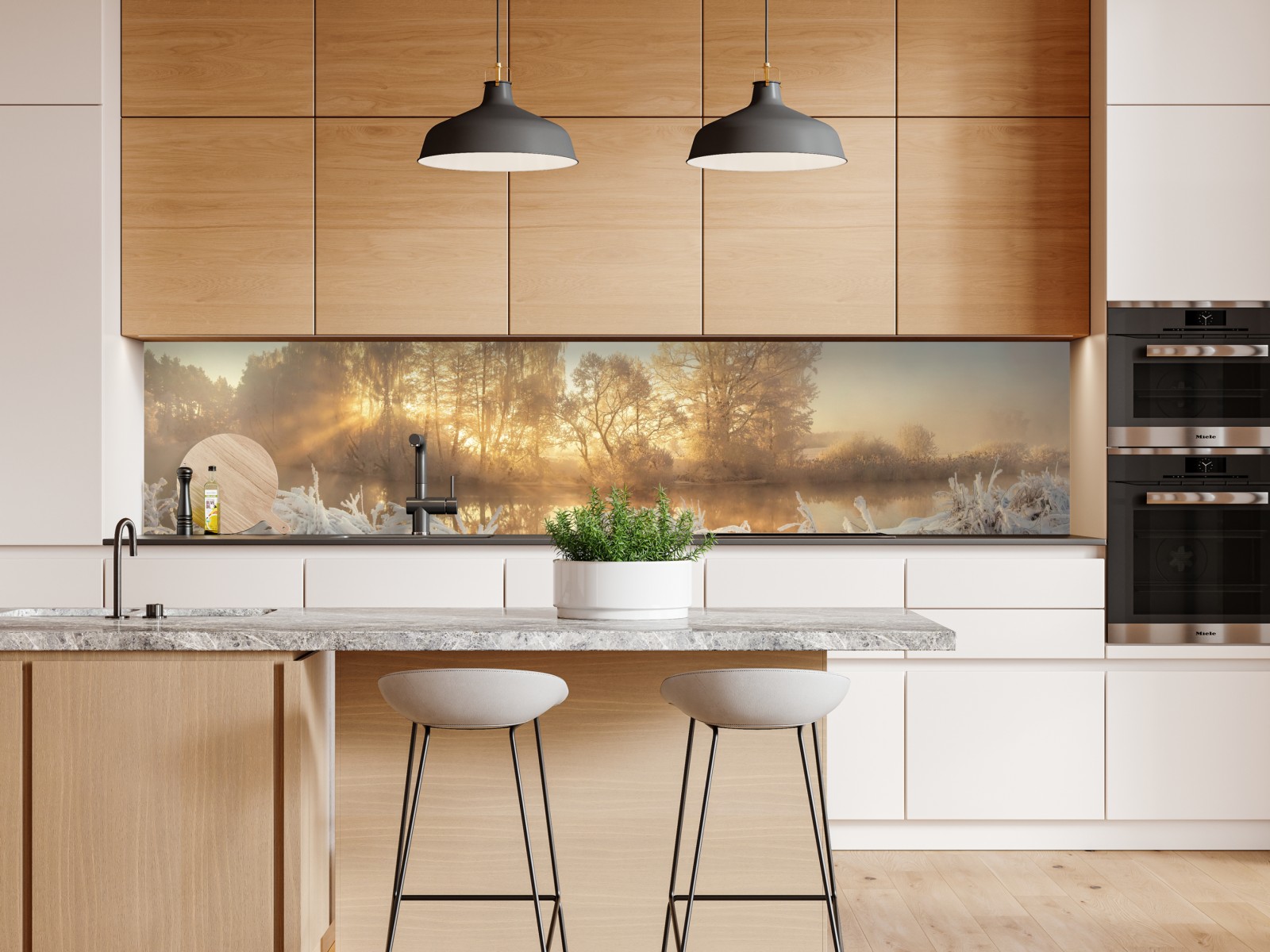 Eine ruhige Winterlandschaft im goldenen Morgenlicht mit frostigen Bäumen und einem stillen Fluss, die kalte Morgen wärmer erscheinen lassen.
