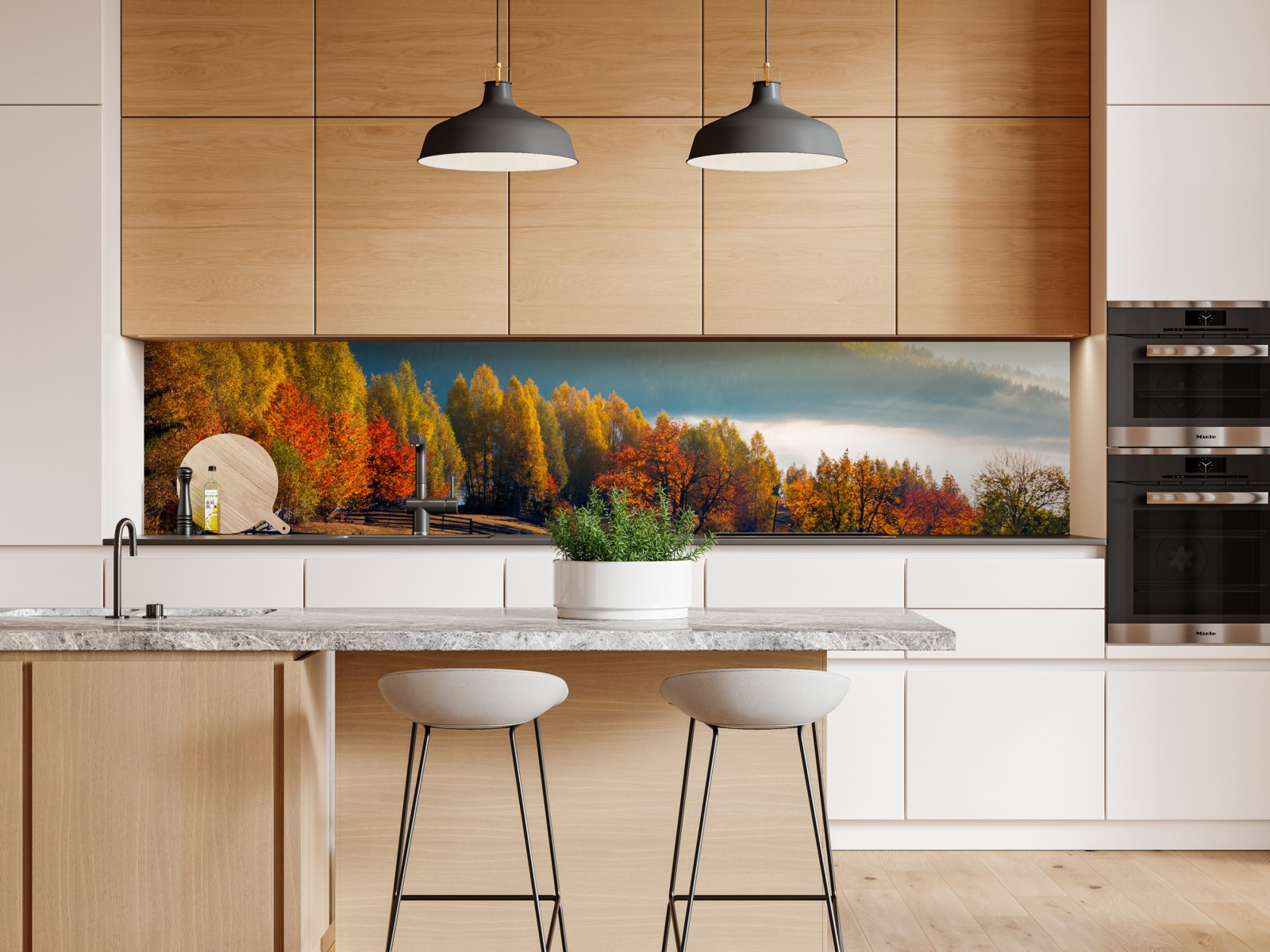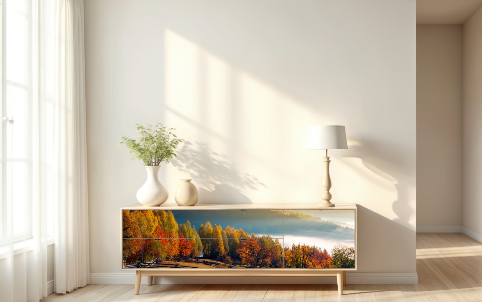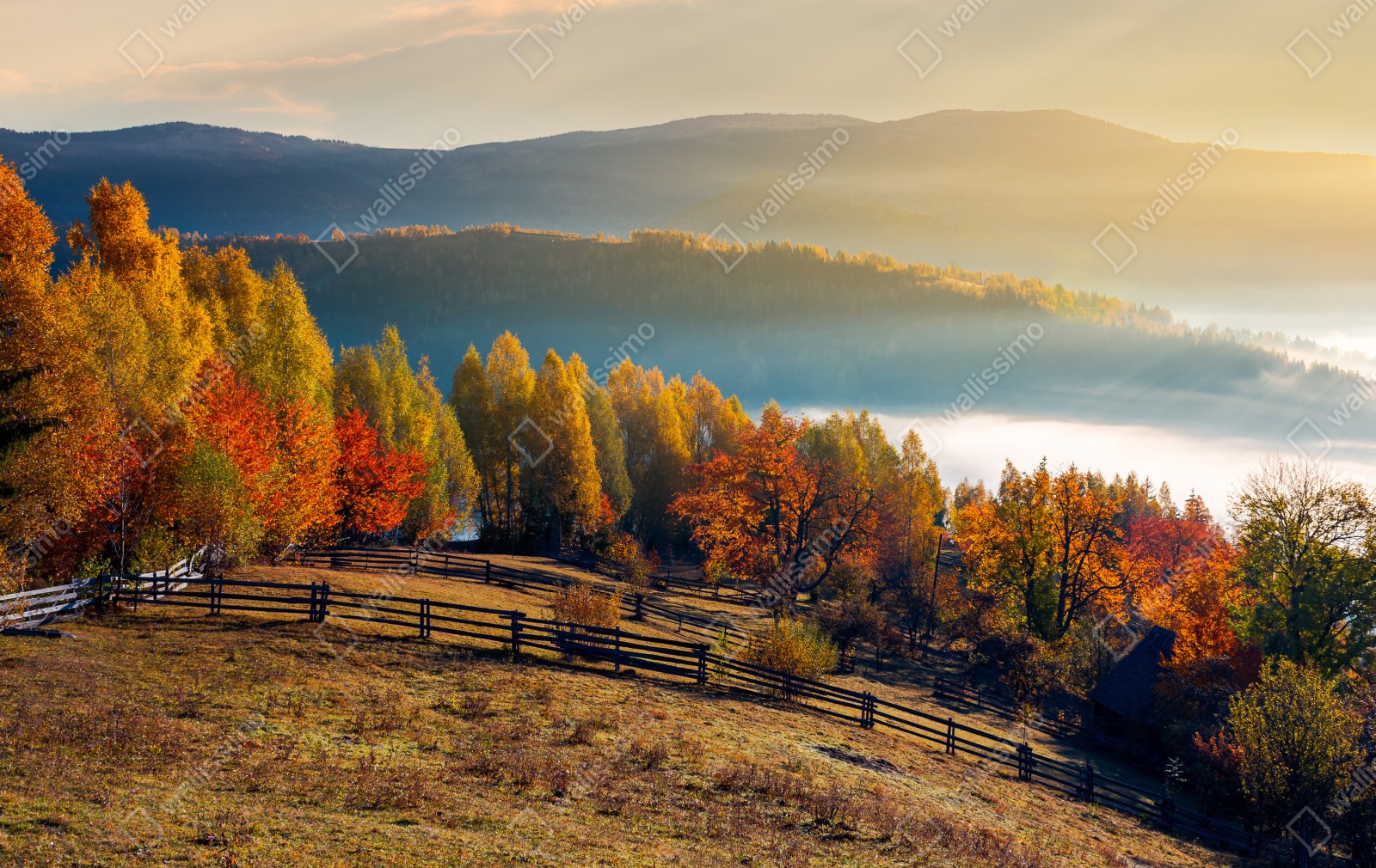 Ein warmer, nebliger herbstlicher Sonnenaufgang über sanften Hügeln und bunten Bäumen bringt rustikalen Charme und eine beruhigende Atmosphäre in jeden Raum.