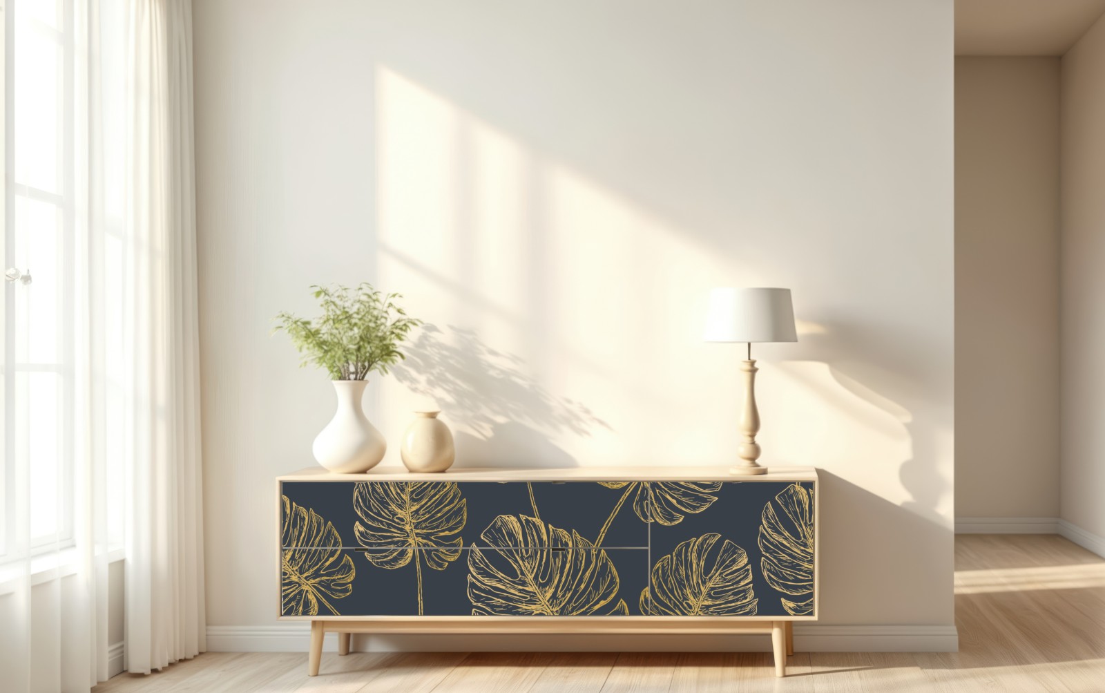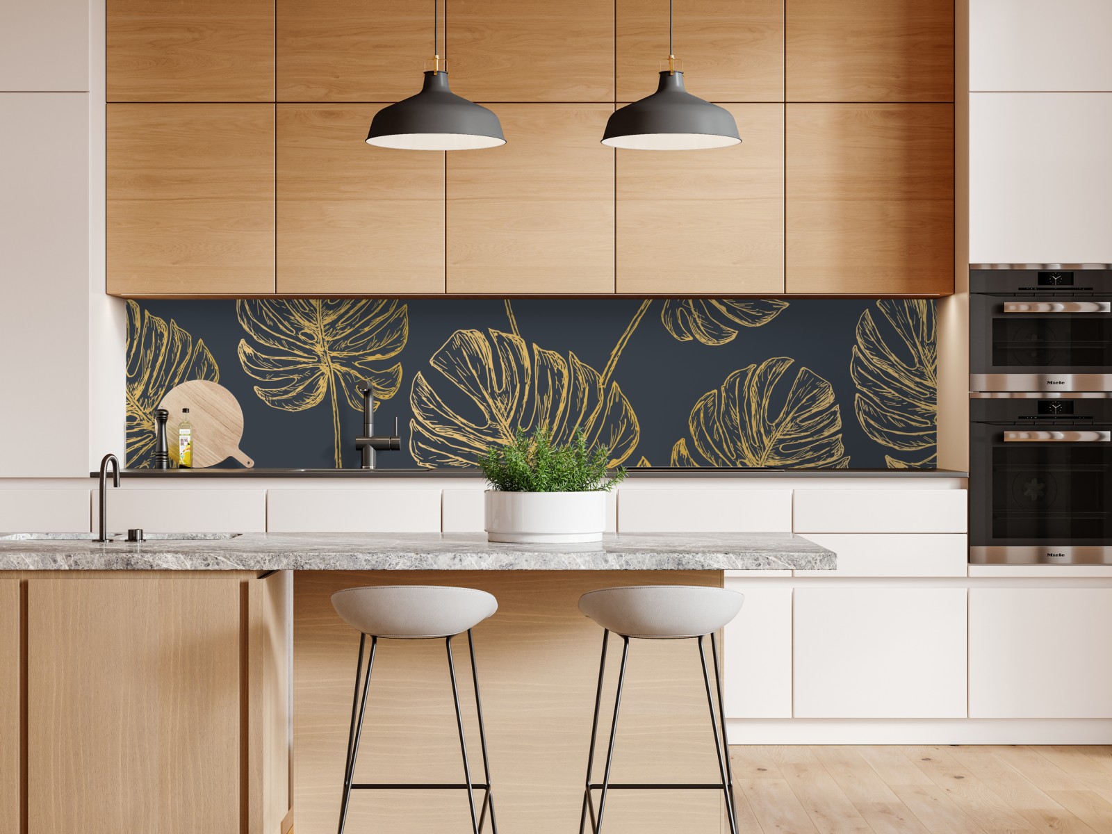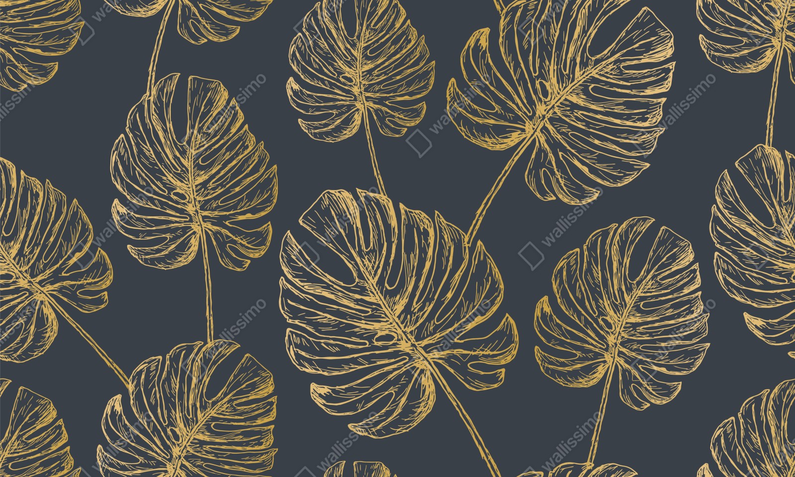 Elegantes tropisches Monstera-Muster in goldener Linienführung auf dunklem Hintergrund verleiht jedem Raum botanischen Charme und einen Hauch von Luxus.