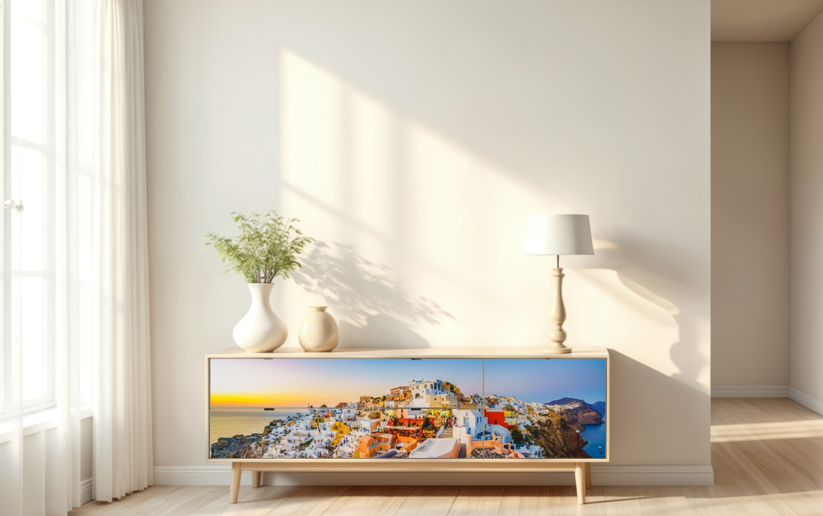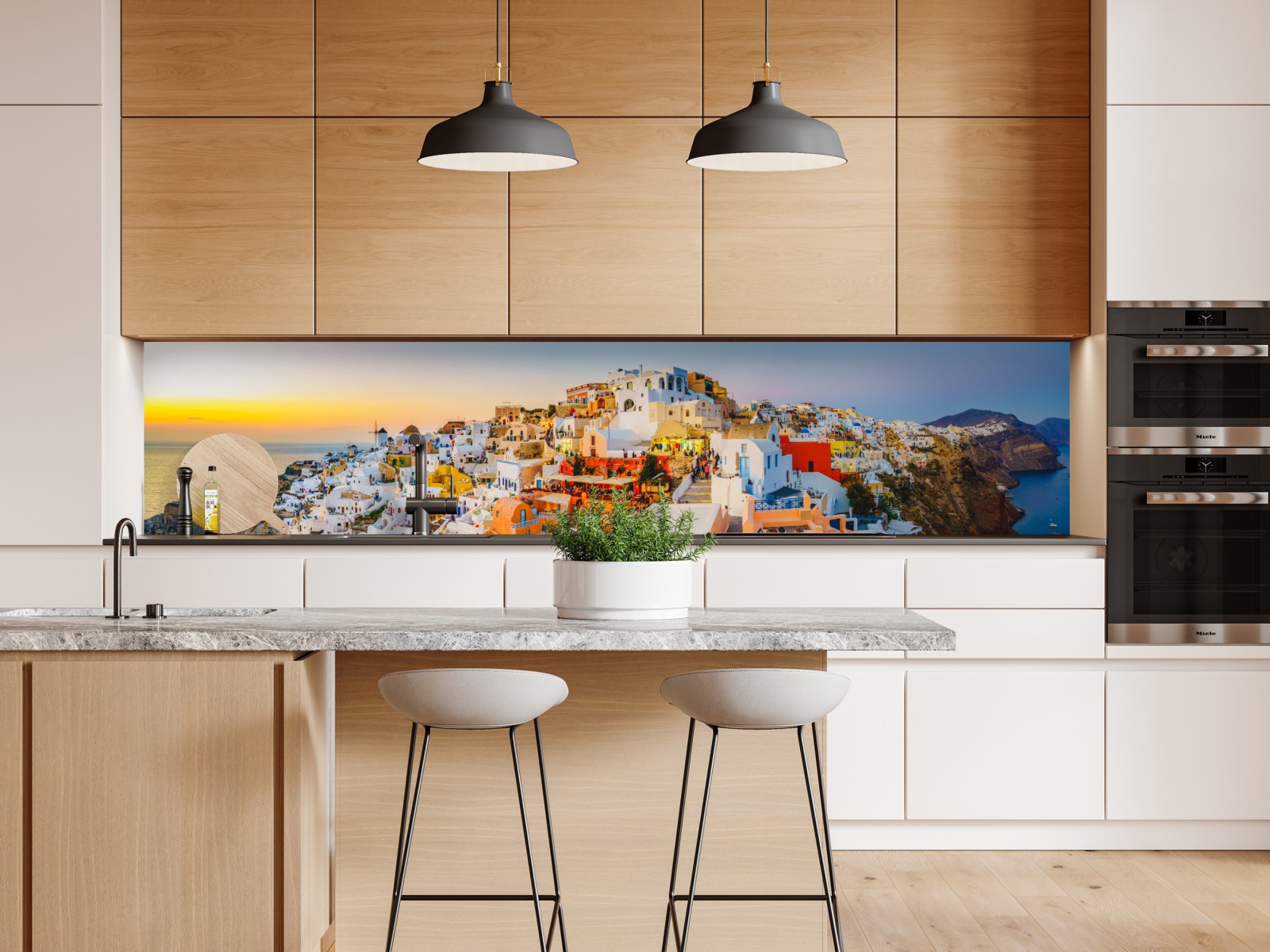 Lebendiges Panoramabild von Santorini bei Sonnenuntergang mit den ikonischen weißen Häusern an der Klippe und dem ruhigen blauen Meer, ideal um mediterranes Flair zu schaffen.