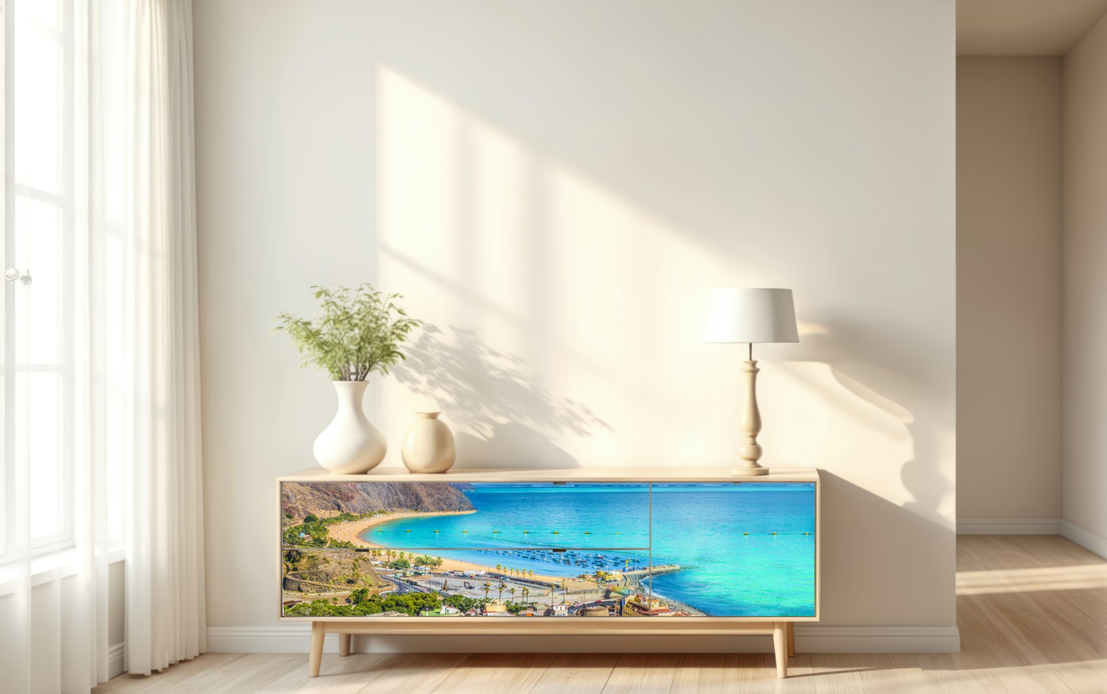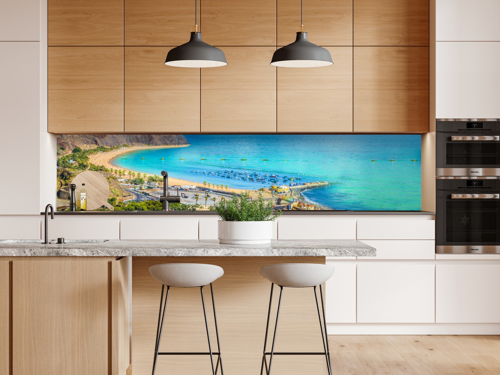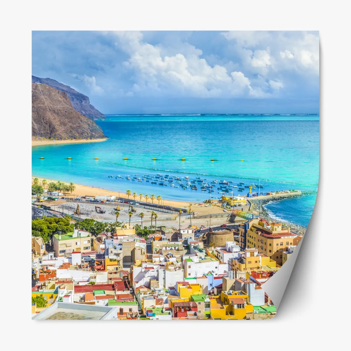 Helles Küstenpanorama des Strandes Las Teresitas auf Teneriffa mit türkisfarbenem Meer und malerischem Dorfcharakter für eine ruhige Wanddekoration.