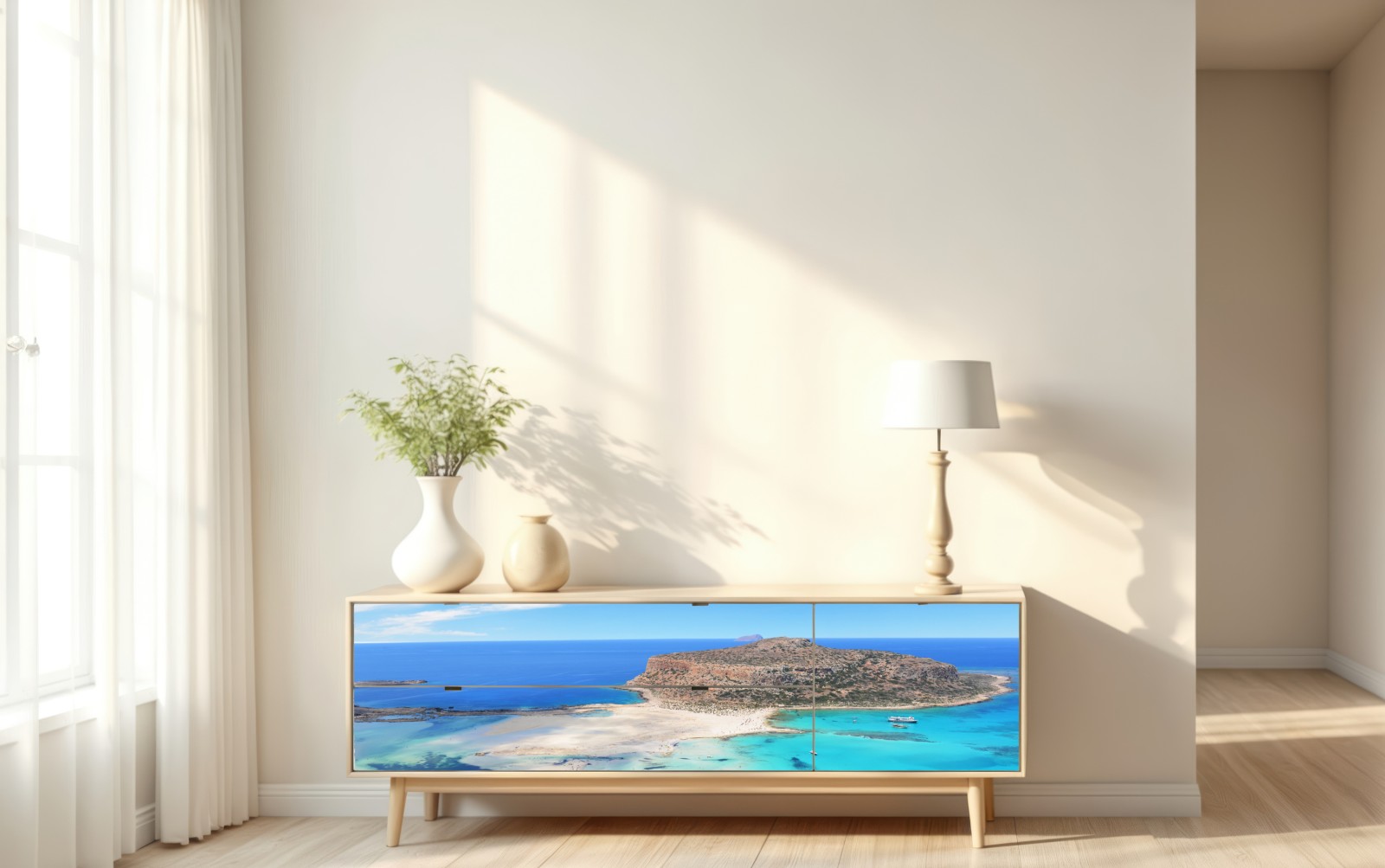 Fangen Sie die ruhige Schönheit der Lagune Balos mit türkisfarbenem Wasser und feinem Sand ein. Perfekt, um jedem Raum eine maritime Atmosphäre zu verleihen.