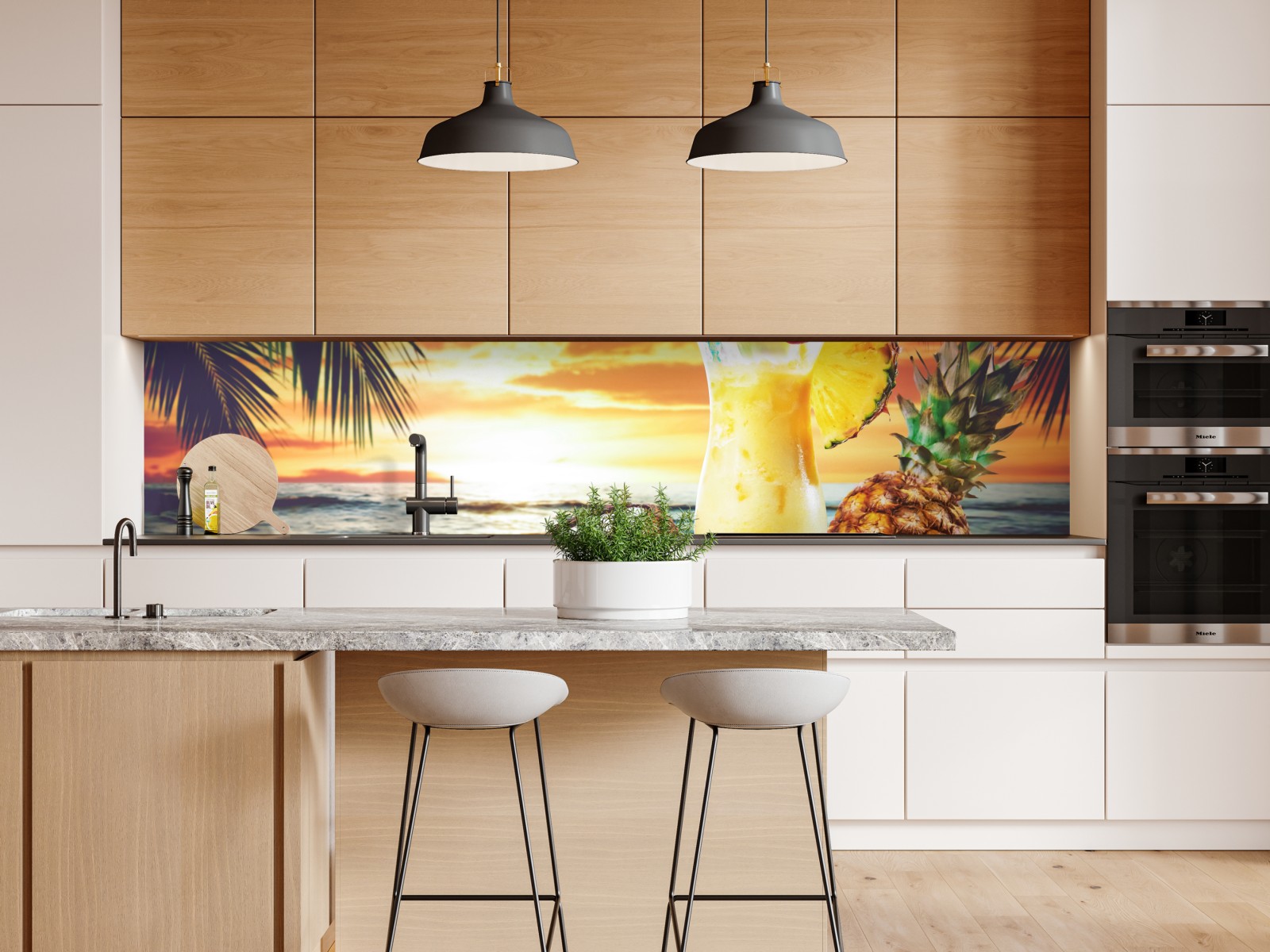 Lebendige tropische Szene mit erfrischendem Cocktail, frischer Ananas und Kokosnuss vor einem goldenen Strandsonnenuntergang, perfekt um sommerliches Flair in jeden Raum zu bringen.