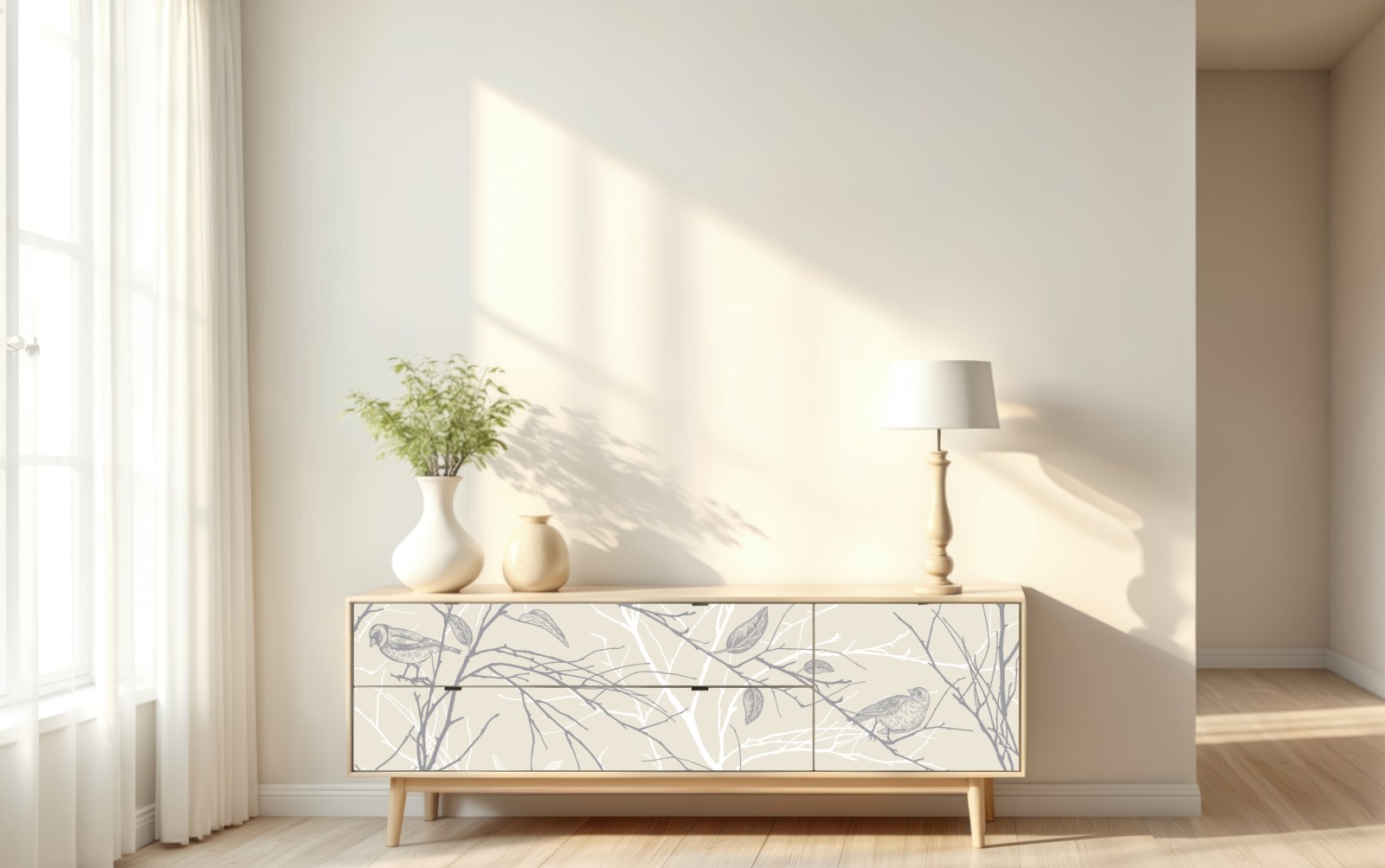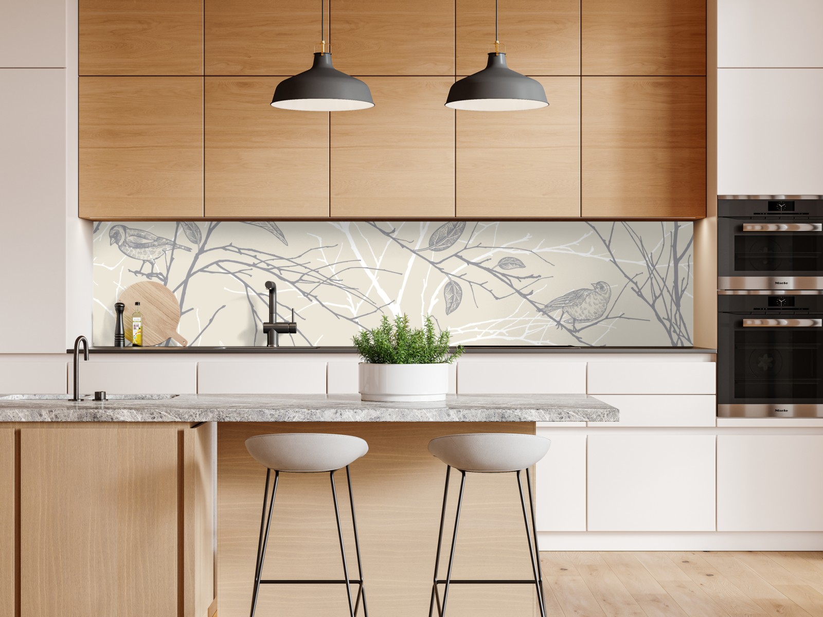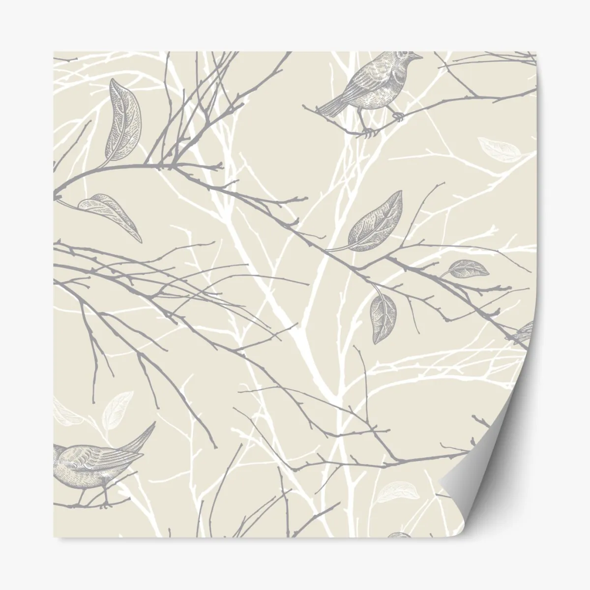 zartes muster mit vögeln und ästen in einer dezenten beige-grauen palette, das eine ruhige, natürliche atmosphäre schafft.