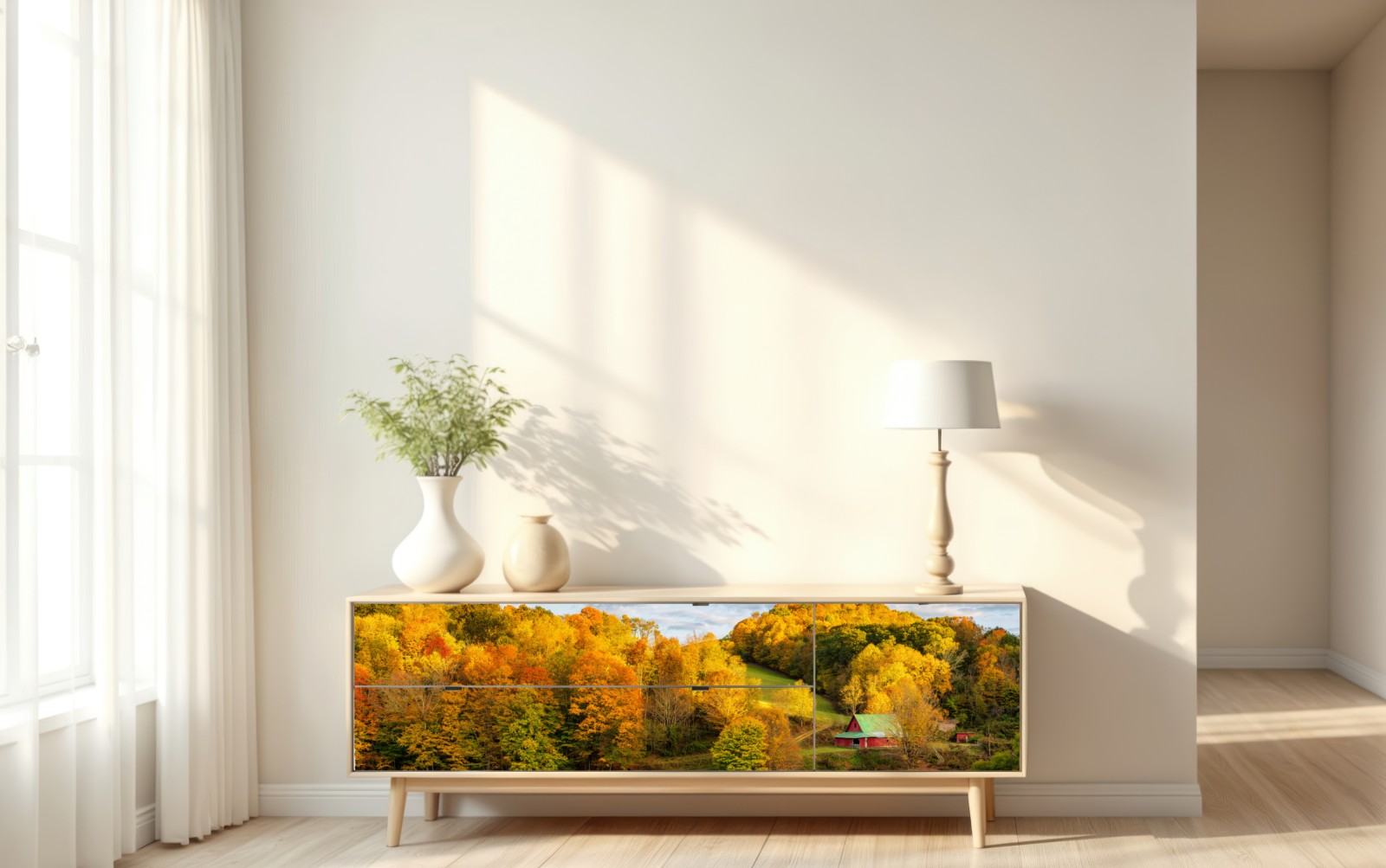 Warmes herbstliches Landschaftsmotiv mit sanften Hügeln, weidenden Kühen und einer roten Scheune, perfekt um eine gemütliche rustikale Atmosphäre zu schaffen.