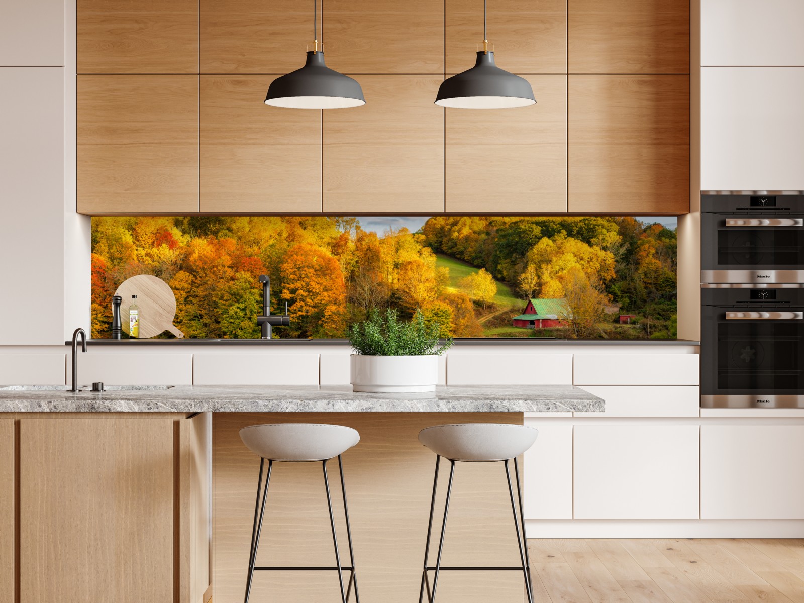 Repositionierbarer Aufkleber herbstliche landschaft mit roter scheune