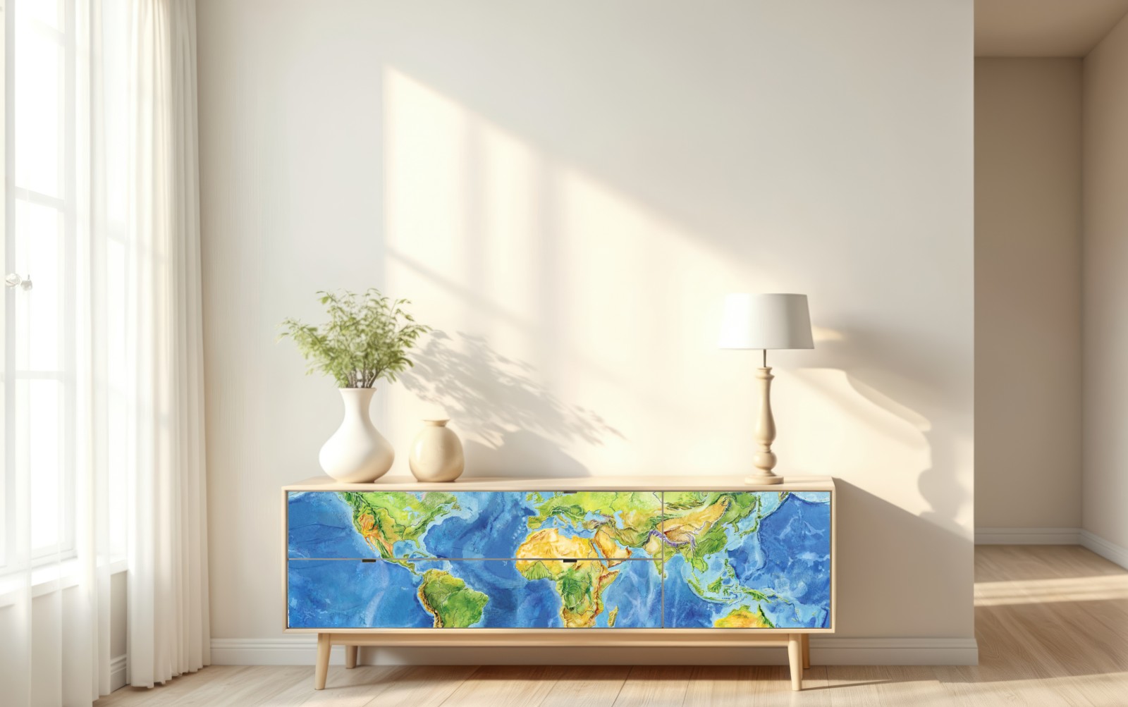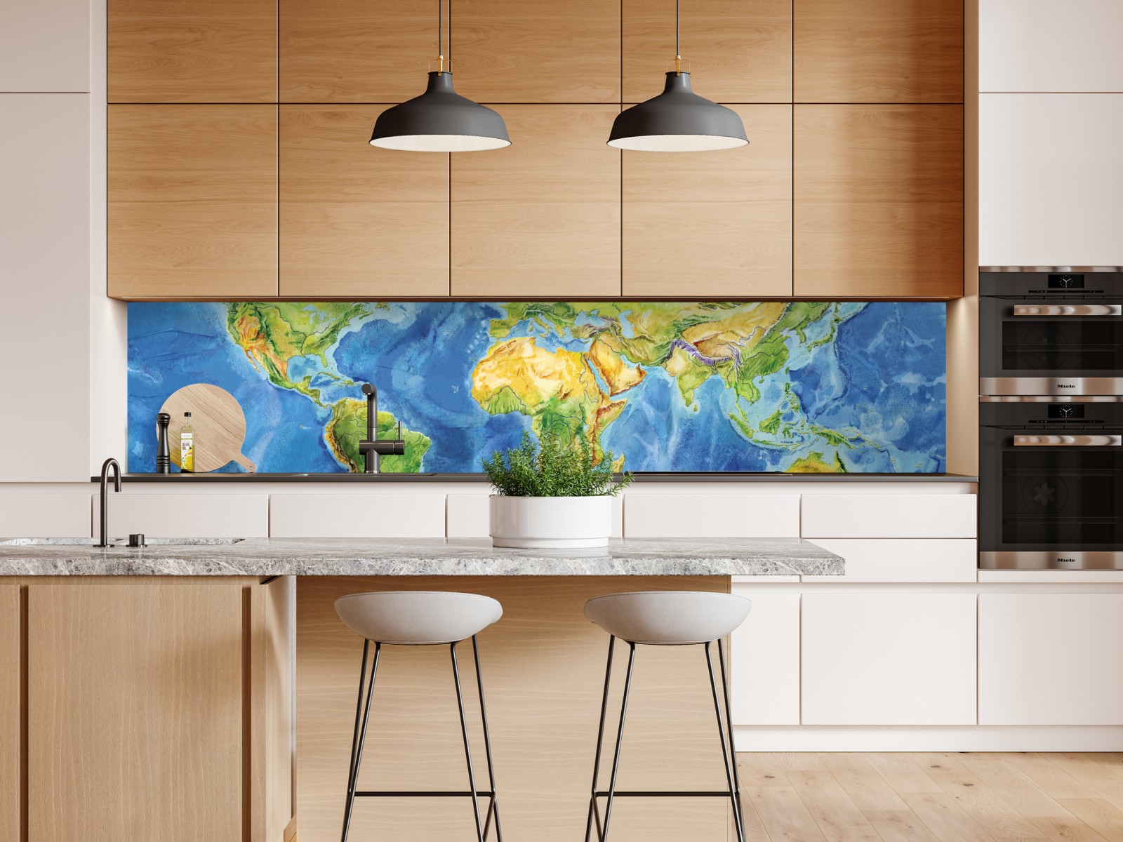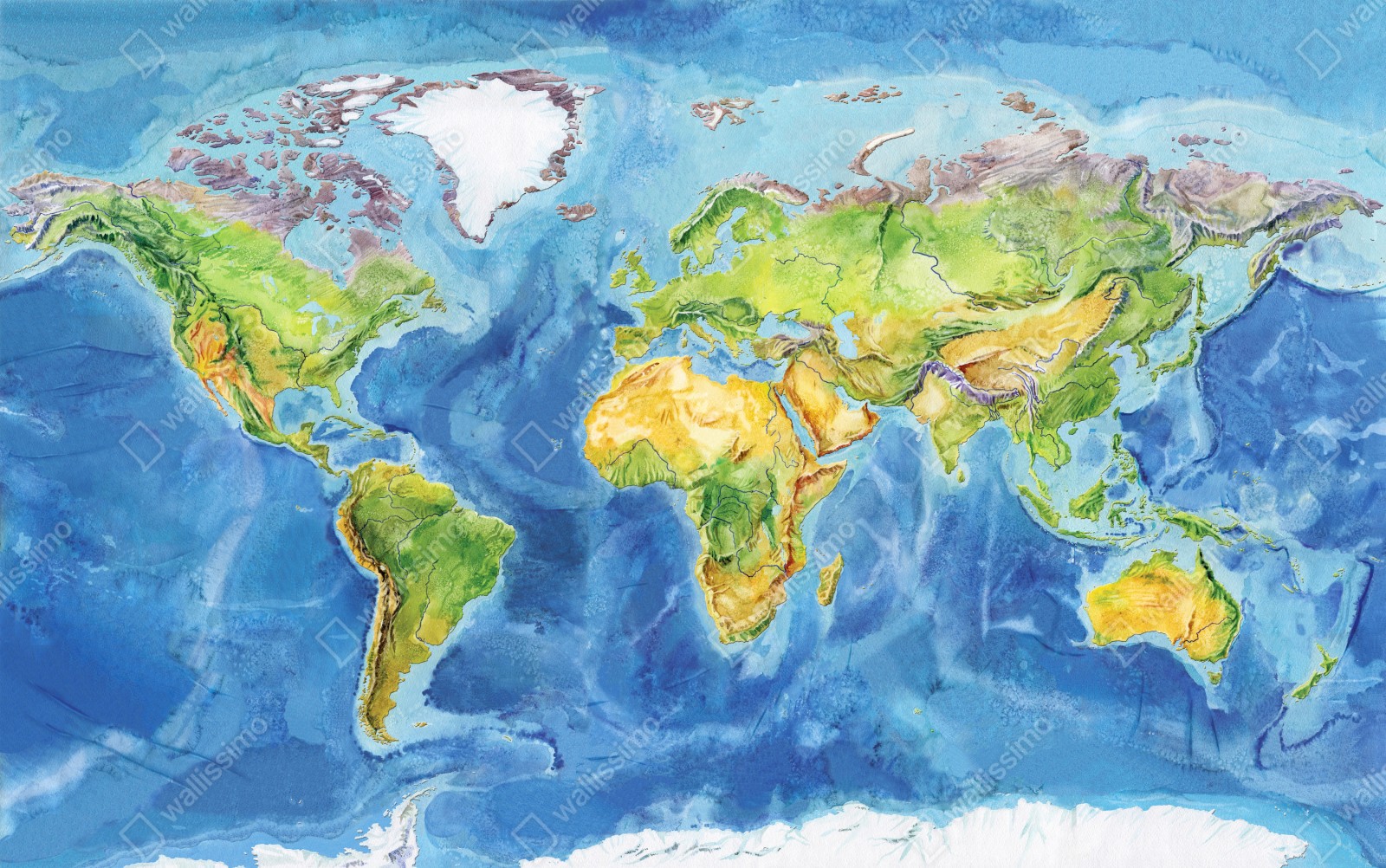 Lebendige aquarell-physische Weltkarte mit hervorgehobener Topografie und Meeren, ideal für Büros, Klassenzimmer und moderne Wohnräume.