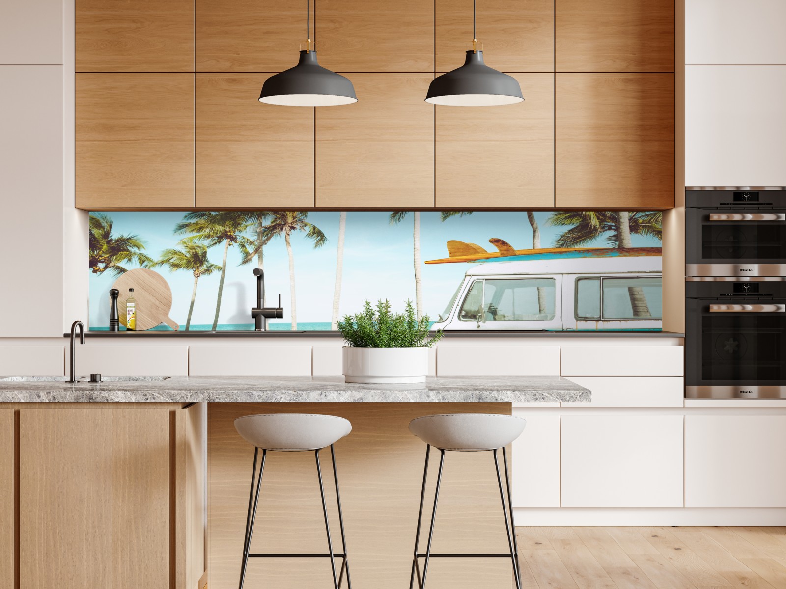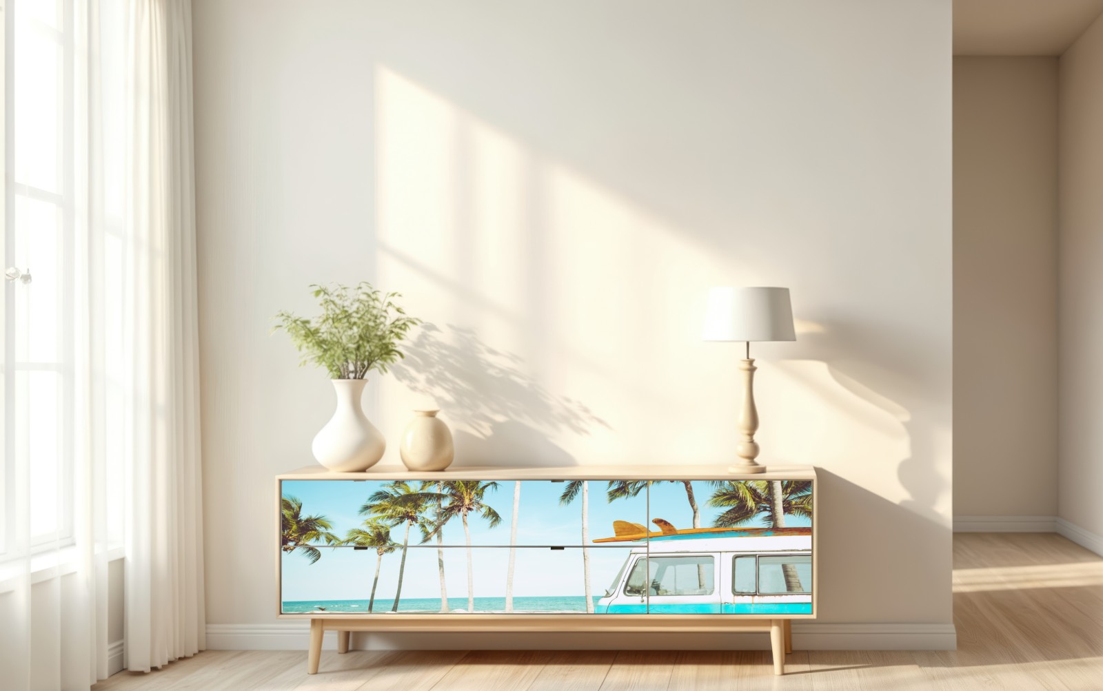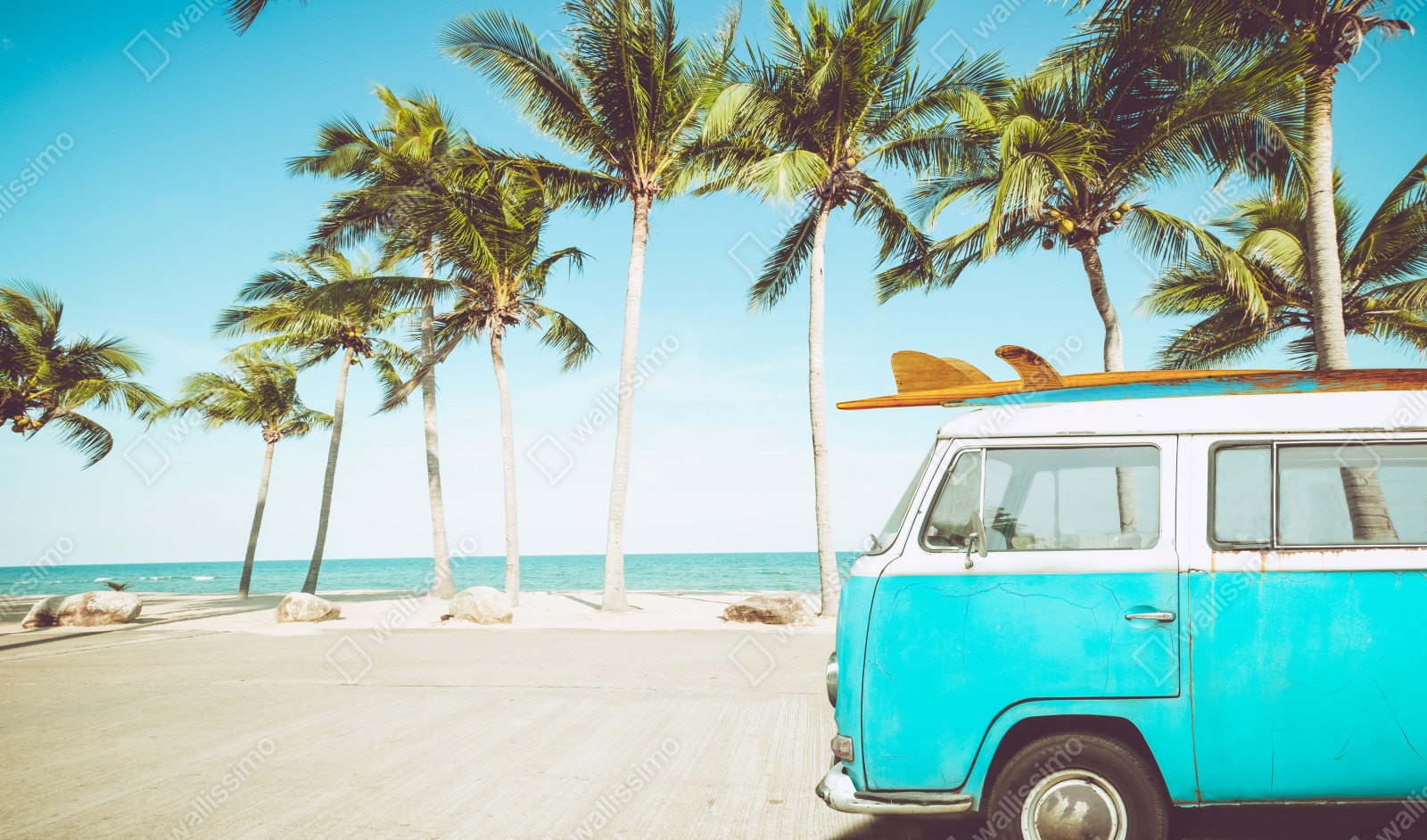 Sonnenverwöhntes Retro-Motiv mit einem Vintage-Bus und Surfbrett vor Palmen, perfekt um jedem Raum maritimen Charme zu verleihen.