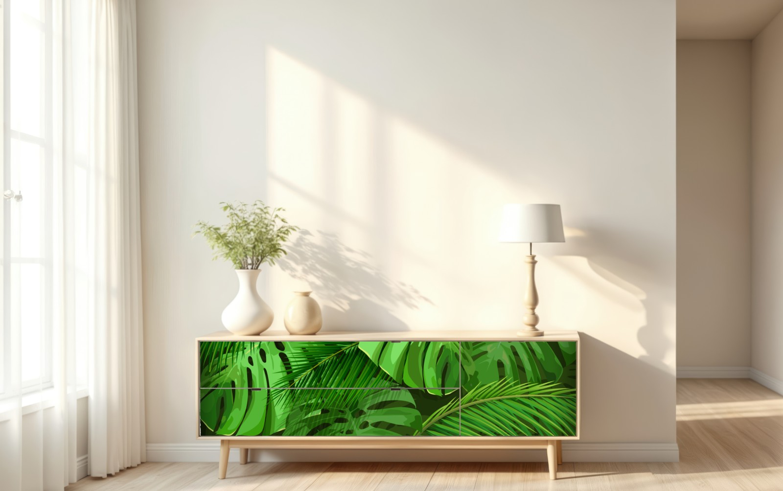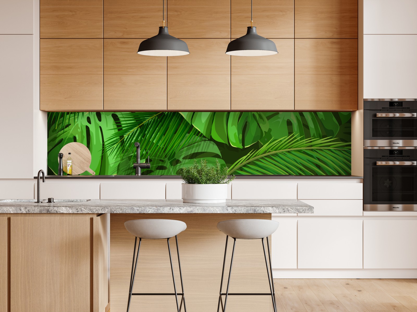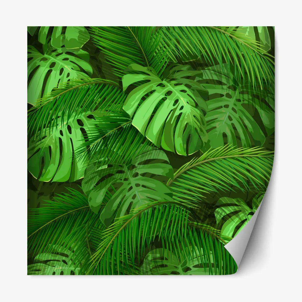 Lebendiges tropisches Blattmotiv mit überlappenden Monstera- und Palmenblättern bringt eine frische, natürliche Atmosphäre in jedes Interieur.
