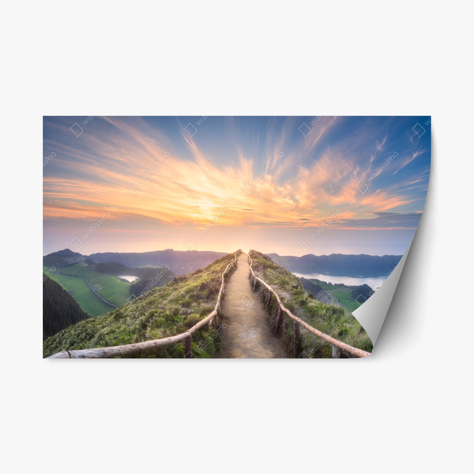 Repositionierbarer Aufkleber Sonnenuntergangspfad auf berggrat über see und tal
