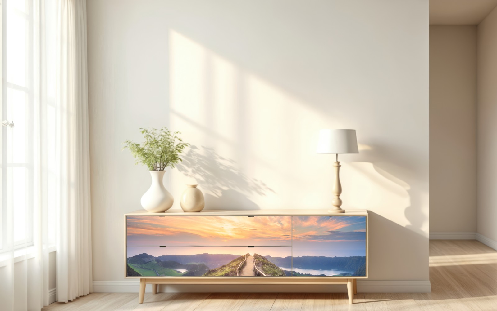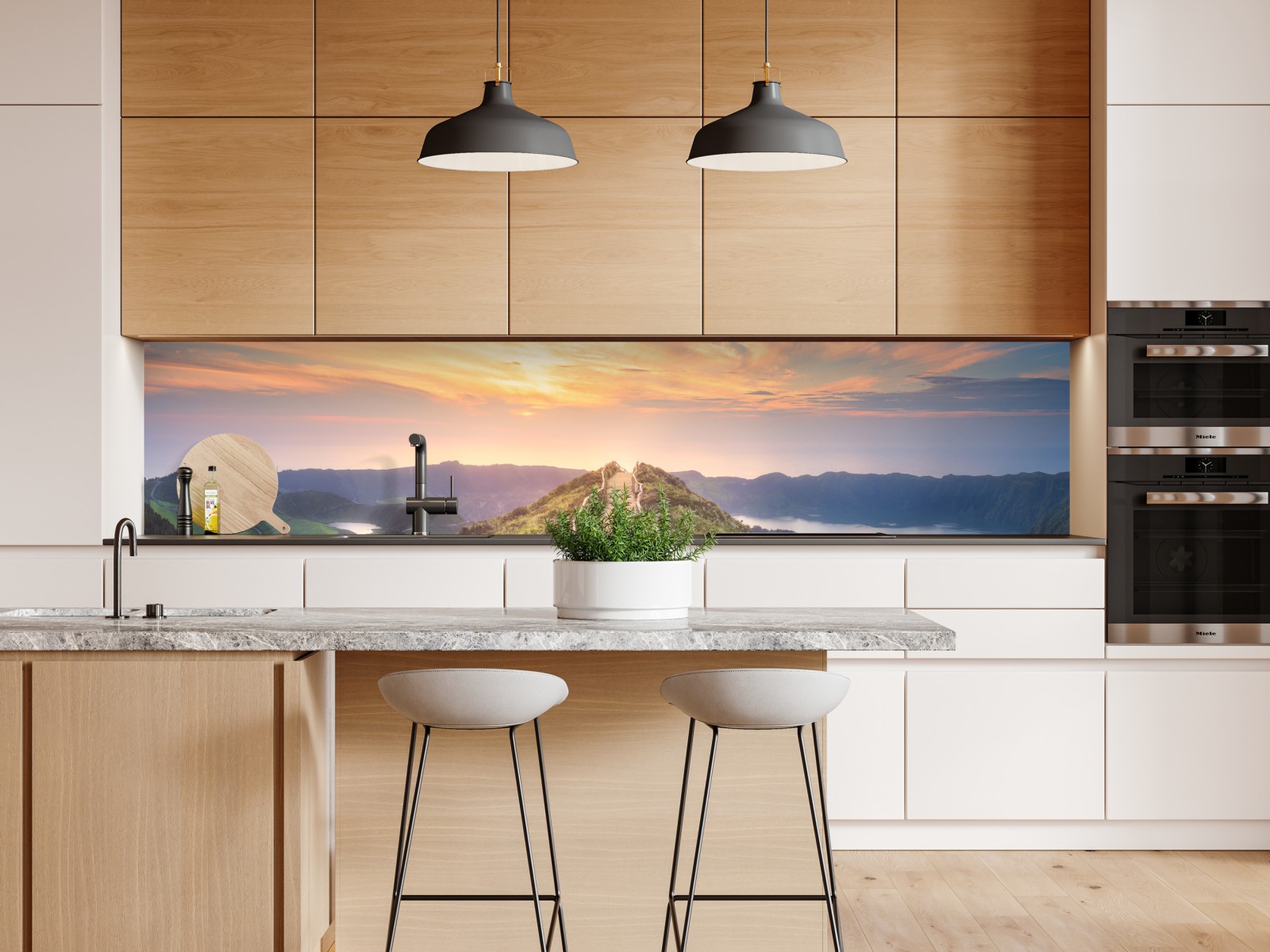 Ein atemberaubender Panoramablick auf einen Berggrat bei Sonnenuntergang mit Blick auf Seen und grüne Täler, ideal um Ruhe und natürliche Schönheit in den Raum zu bringen.