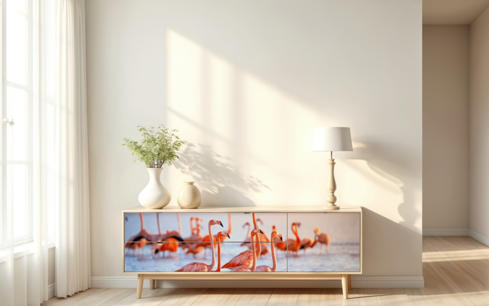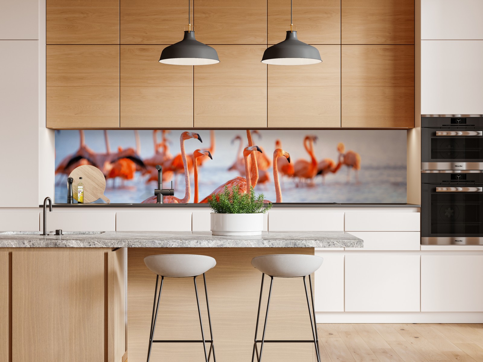 Lebendige Szene rosa Flamingos, die bei Sonnenuntergang im flachen Wasser waten und jedem Raum tropische Wärme und natürliche Eleganz verleihen.