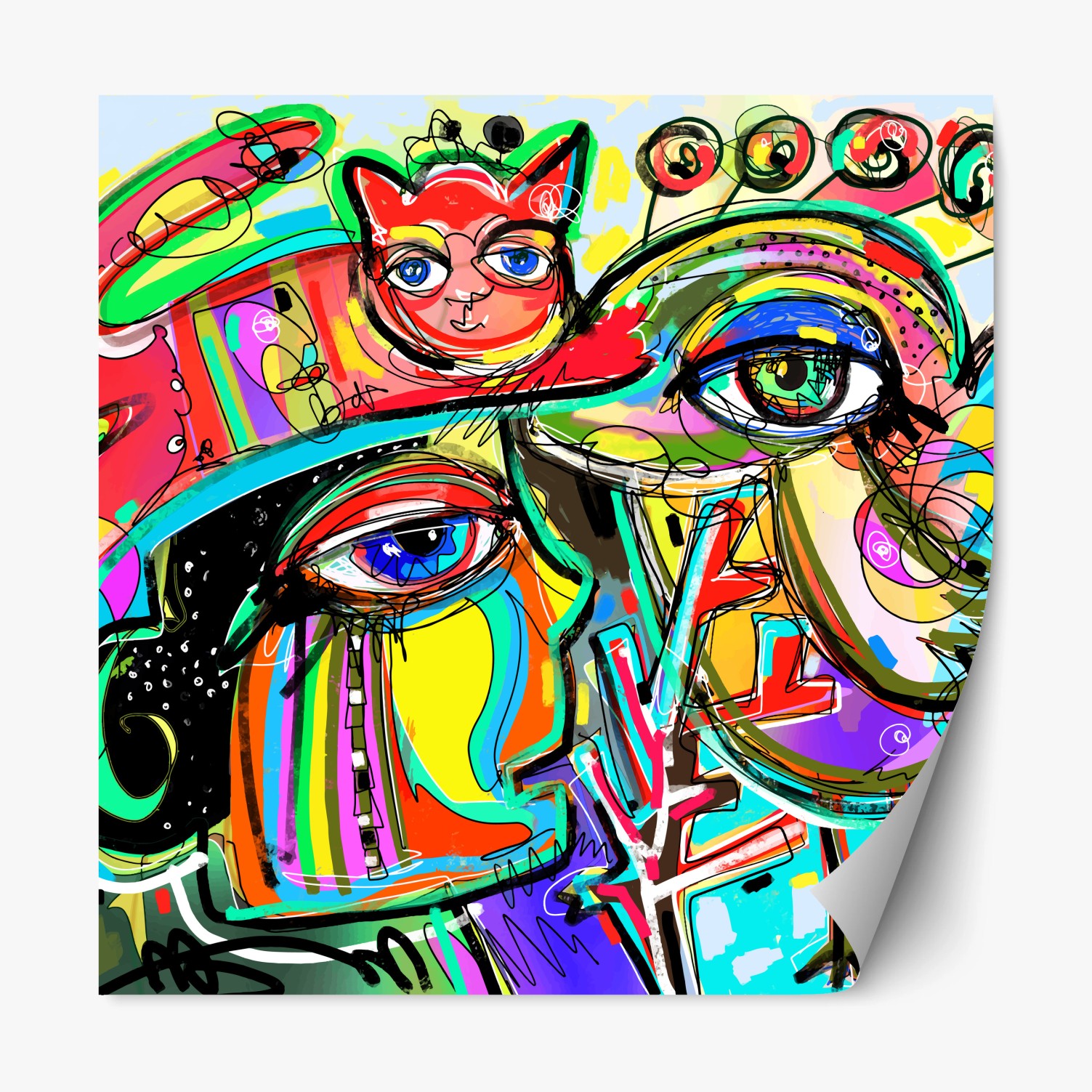 Repositionierbarer Aufkleber Lebendige abstrakte gesichter mit katze und vogel