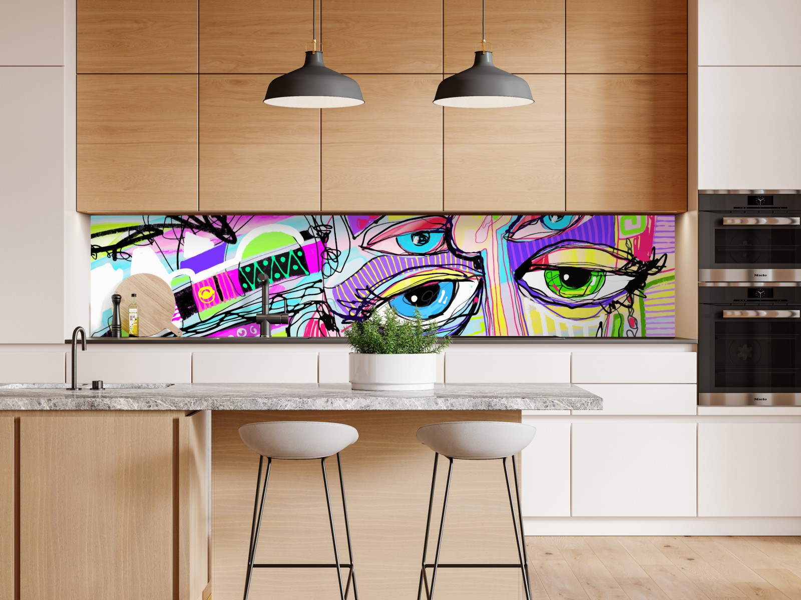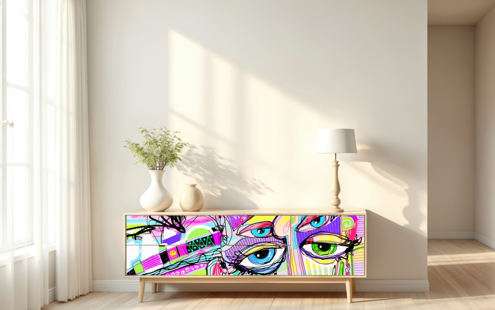 Ein lebhaftes zeitgenössisches abstraktes Porträt mit kräftigen Farben und expressiven Linien, das jedes Interieur belebt.