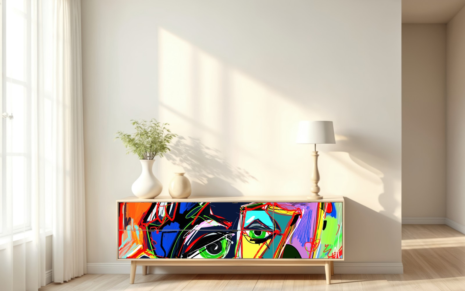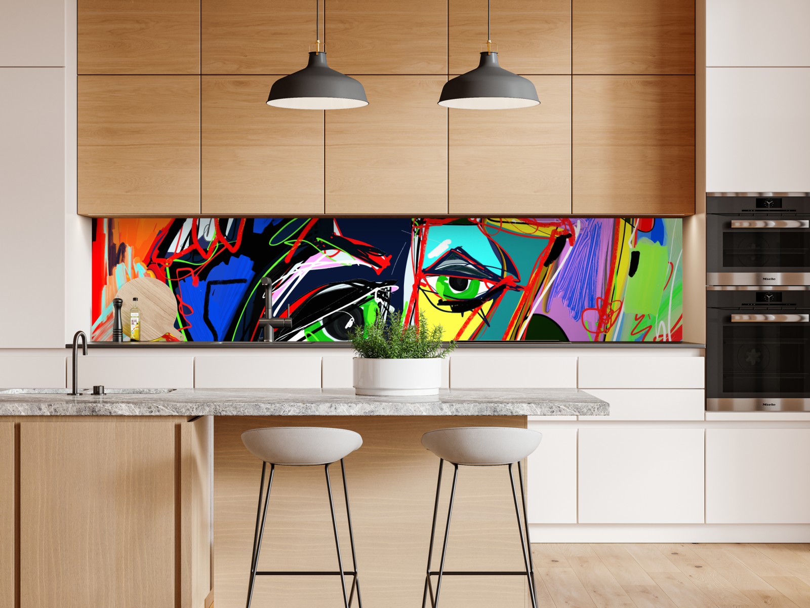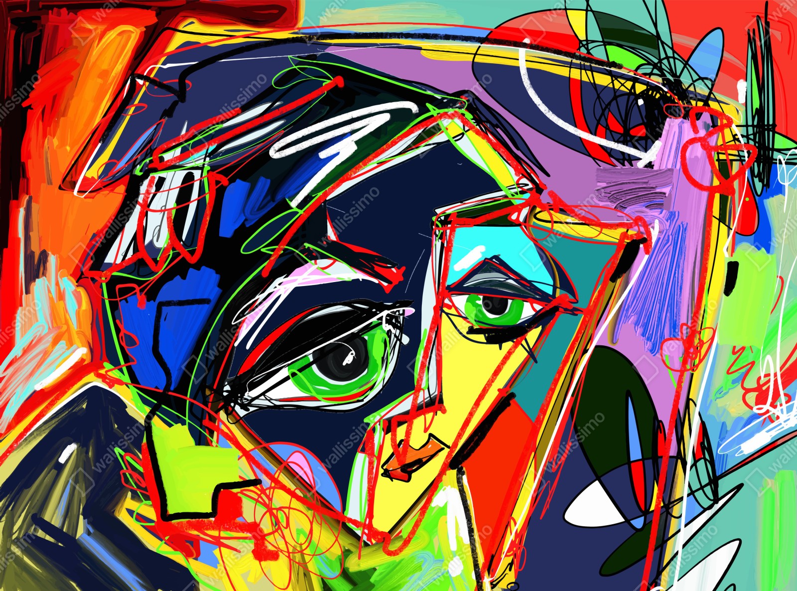 Kräftiges und farbenreiches abstraktes Porträt, das Räume belebt und modernen Ausdruck verleiht.