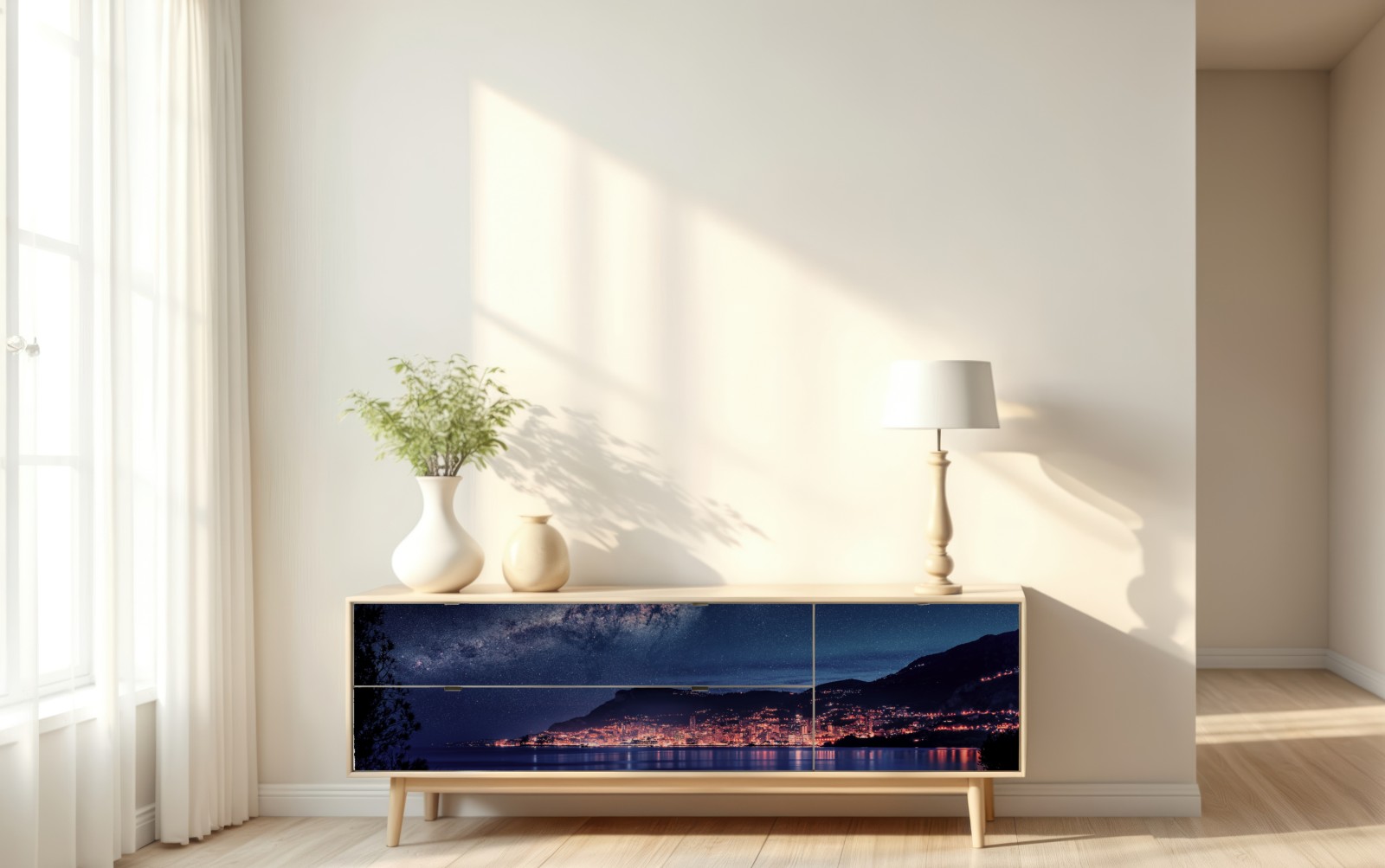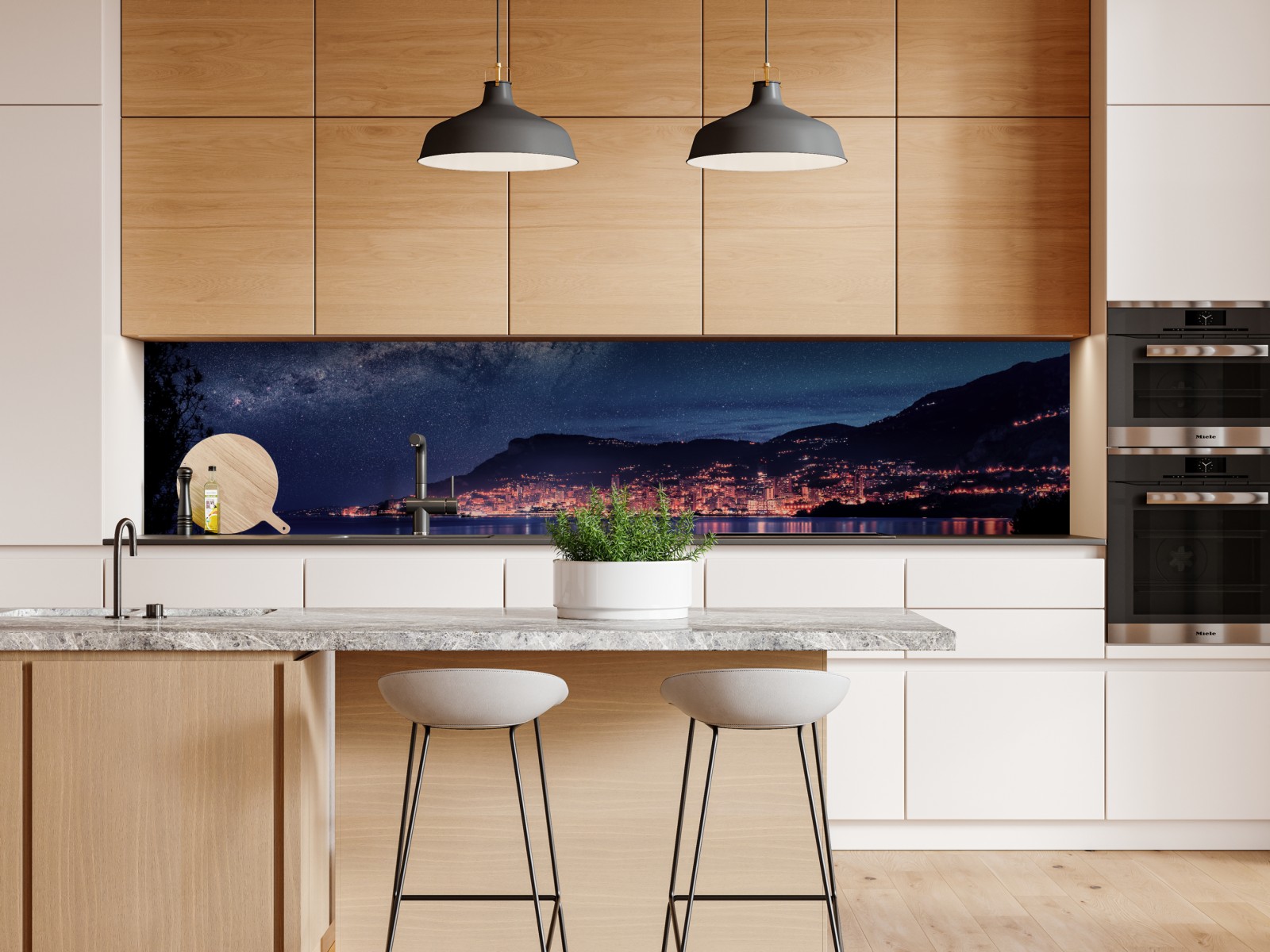 Atemberaubende nächtliche stadtlandschaft, in der die Milchstraße über einer leuchtenden Küstenlinie spannt und jedem Raum Tiefe und Atmosphäre verleiht.