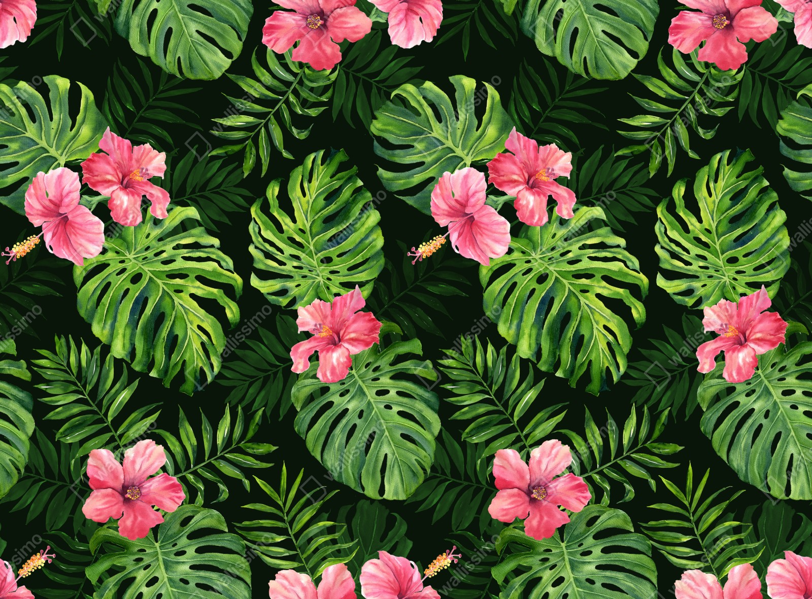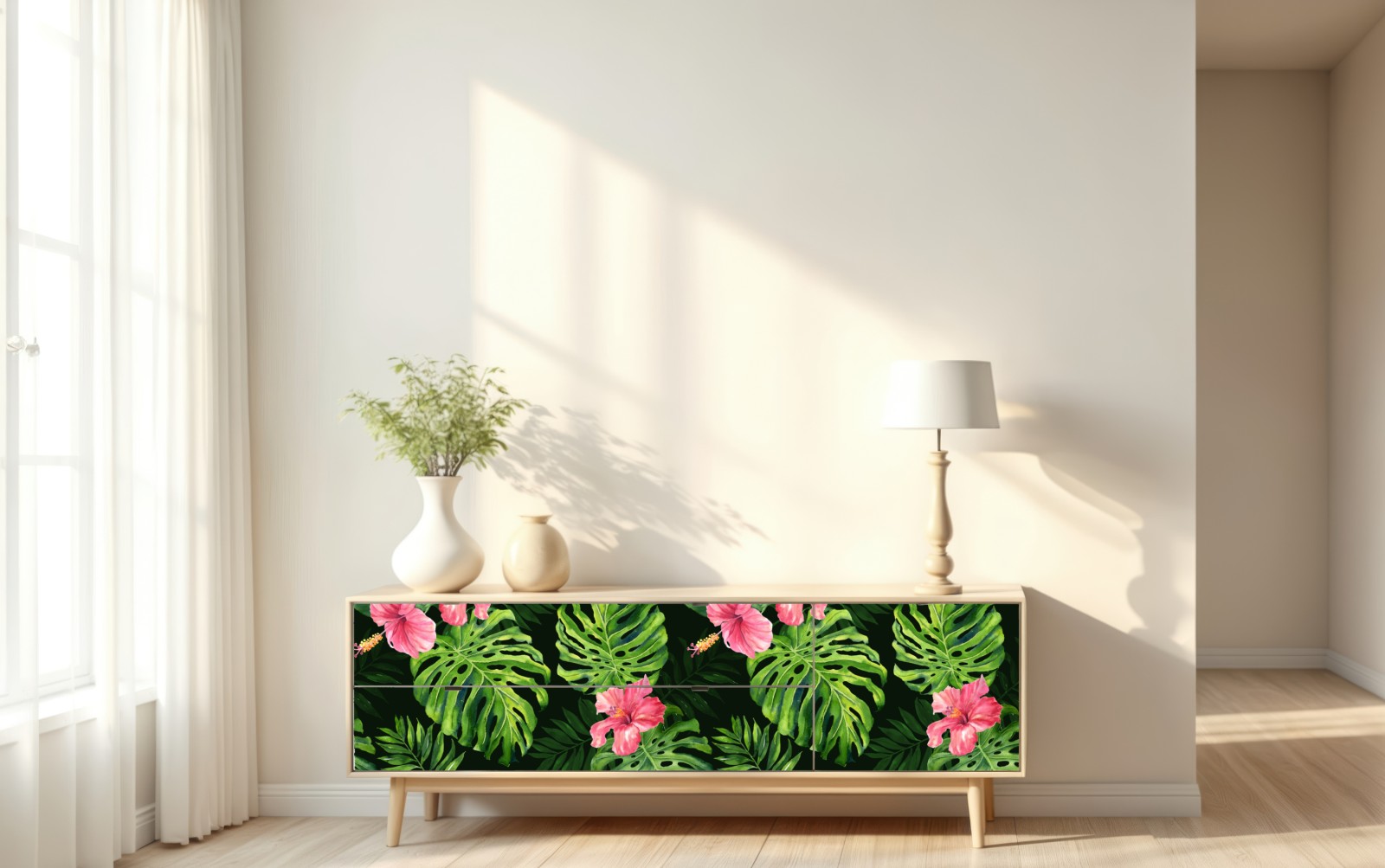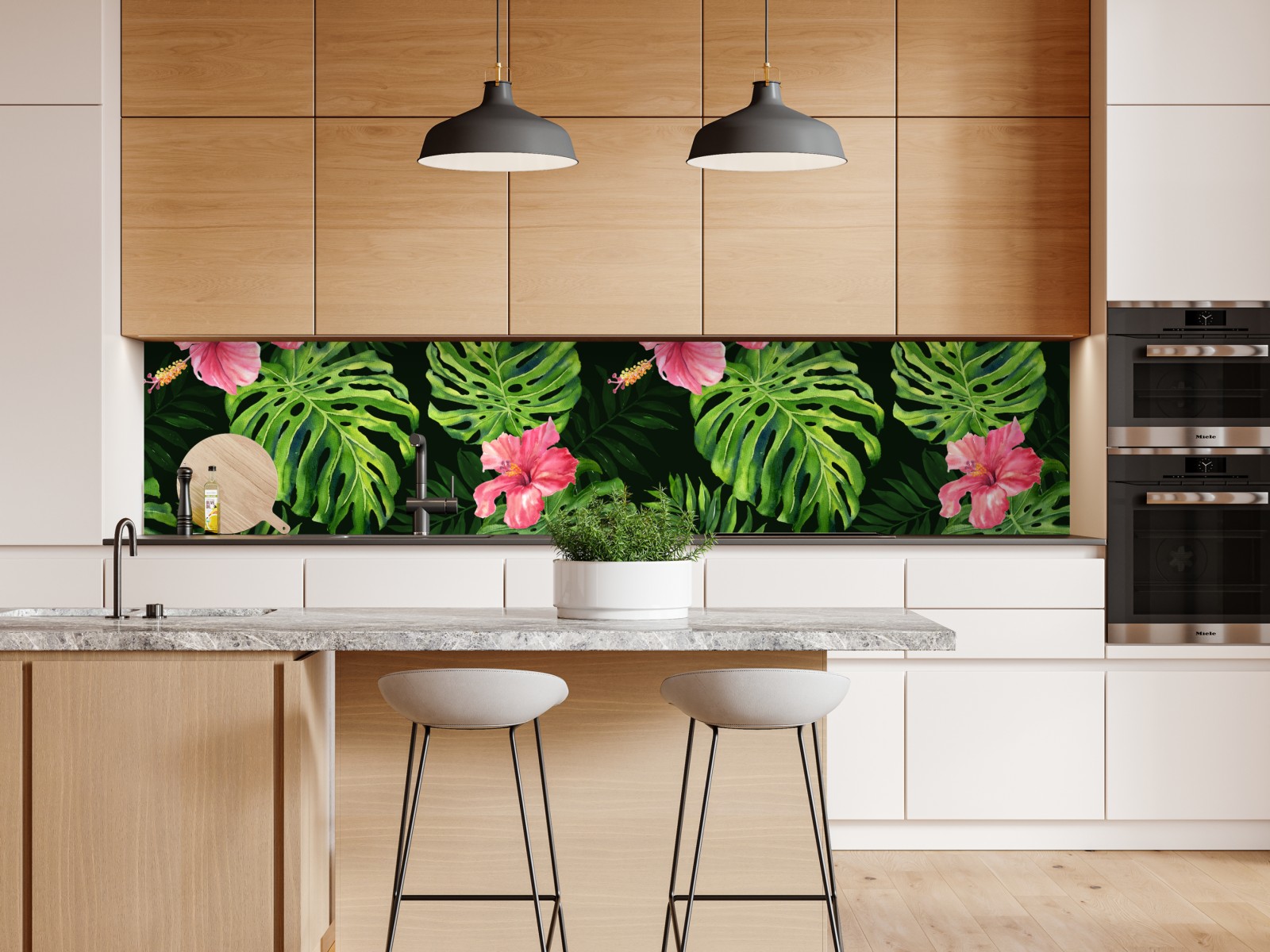 Lebendiges tropisches Muster mit Monsterablättern und Hibiskusblüten, das ihrem Raum üppige botanische Energie verleiht.
