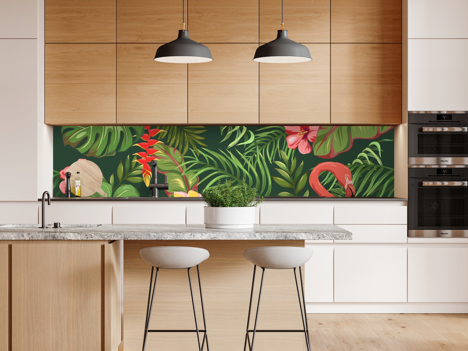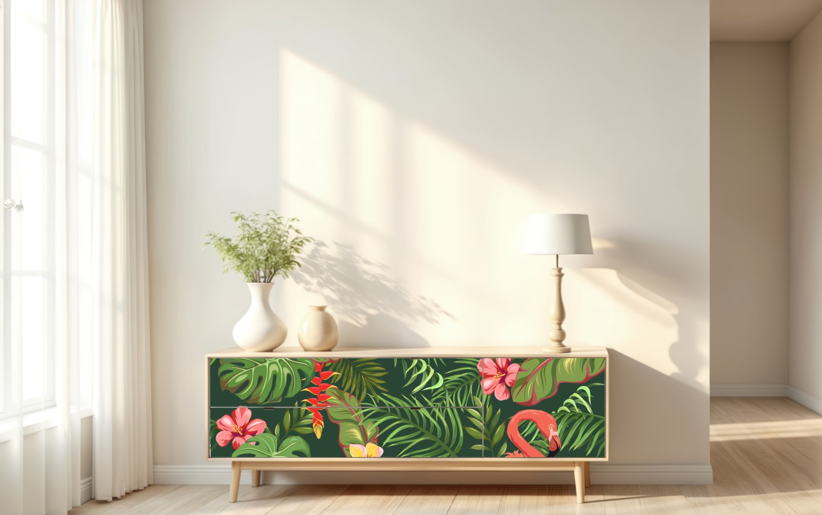 Lebendige tropische Illustration mit rosa Flamingos und üppigem Grün, die jedem Raum eine exotische Atmosphäre verleiht.