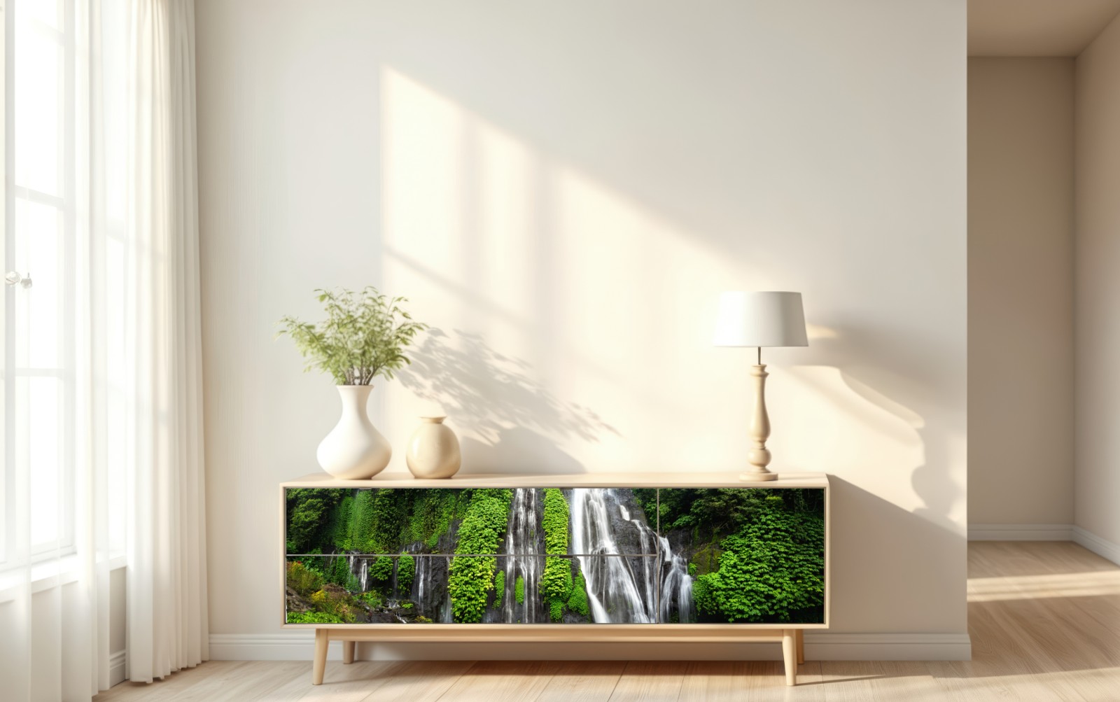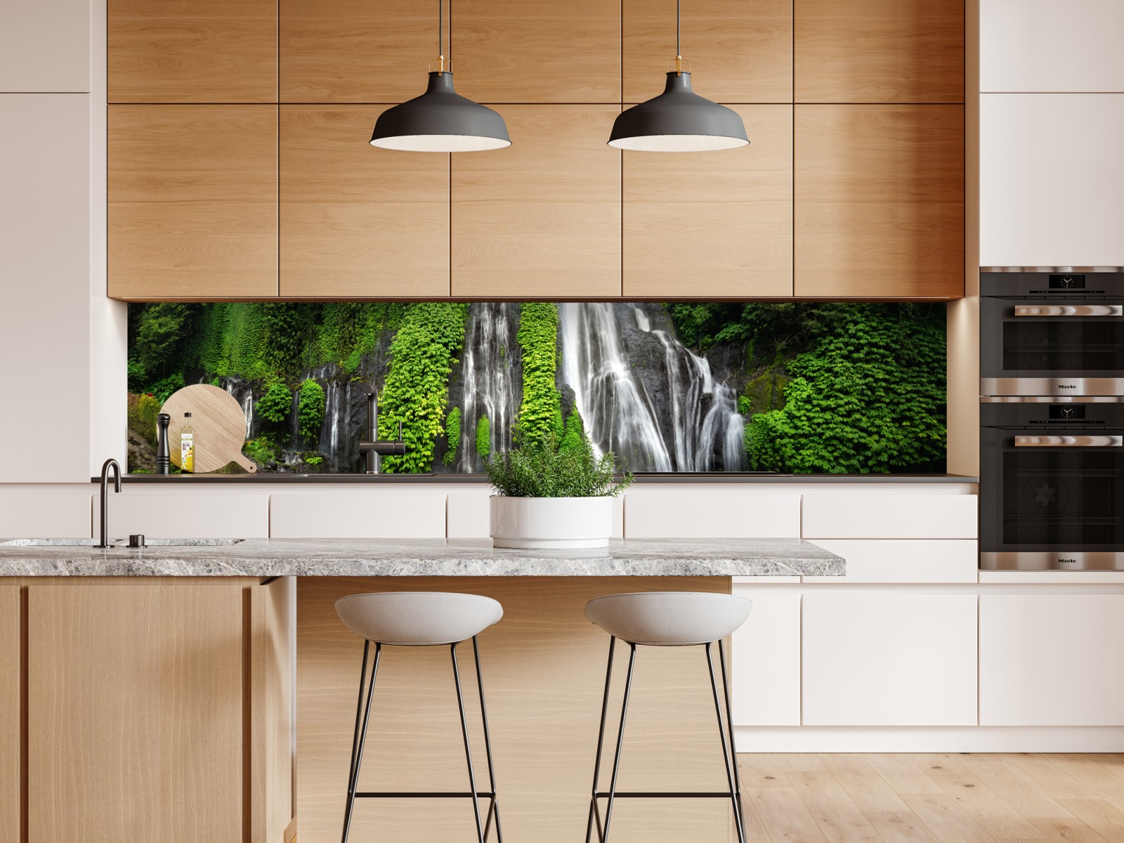 Ein ruhiger wasserfall, der in türkisfarbenen pool stürzt, umgeben von üppigem grünem dschungel, perfekt, um naturnahe atmosphäre ins interieur zu bringen.
