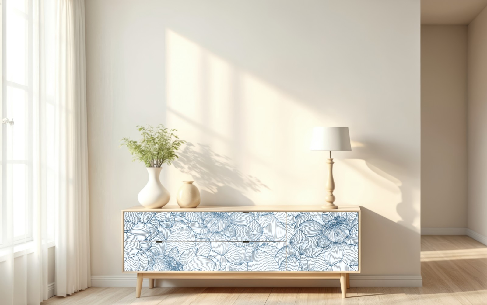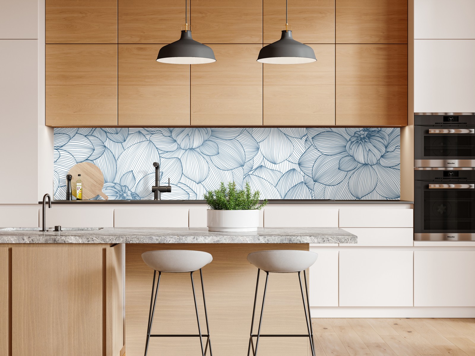 Zart gezeichnete Blumenlinien in sanftem Blau schaffen einen beruhigenden, modernen Akzent für Schlafzimmer und Wohnzimmer.