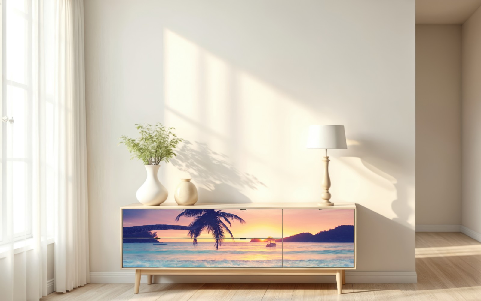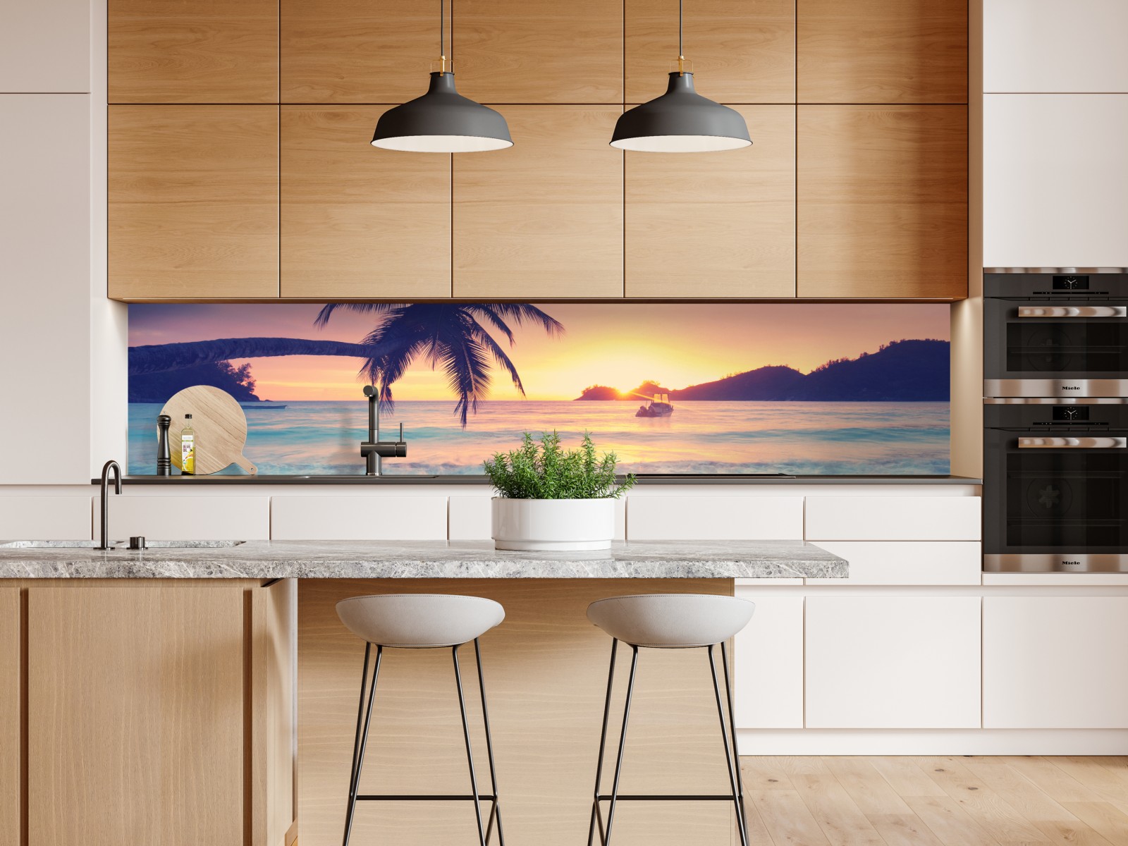 bringen sie beruhigende inselatmosphäre in ihr zuhause mit diesem pastellfarbenen tropischen sonnenuntergang über sanften wellen.