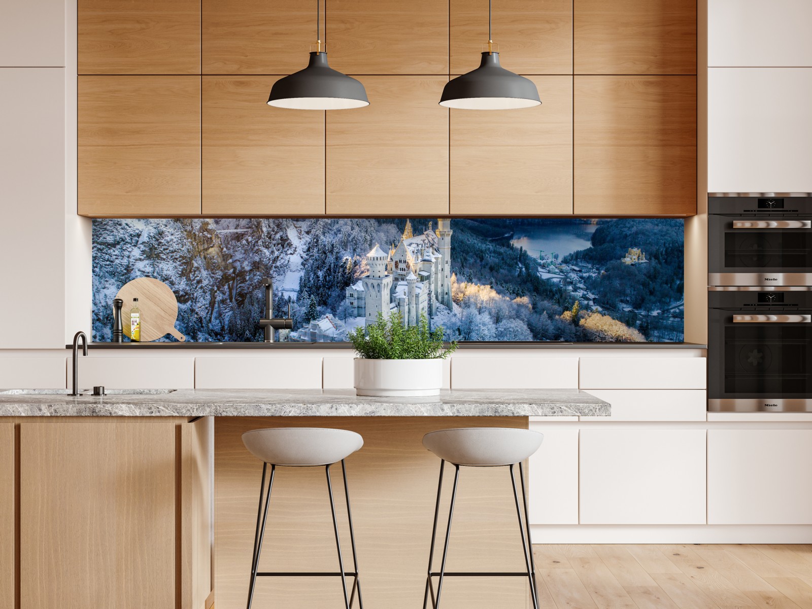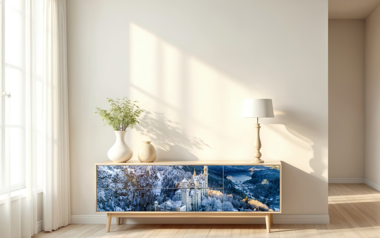ein majestätisches schloss eingebettet in verschneite berge und einen ruhigen see, das jedem raum eine romantische winteratmosphäre verleiht.