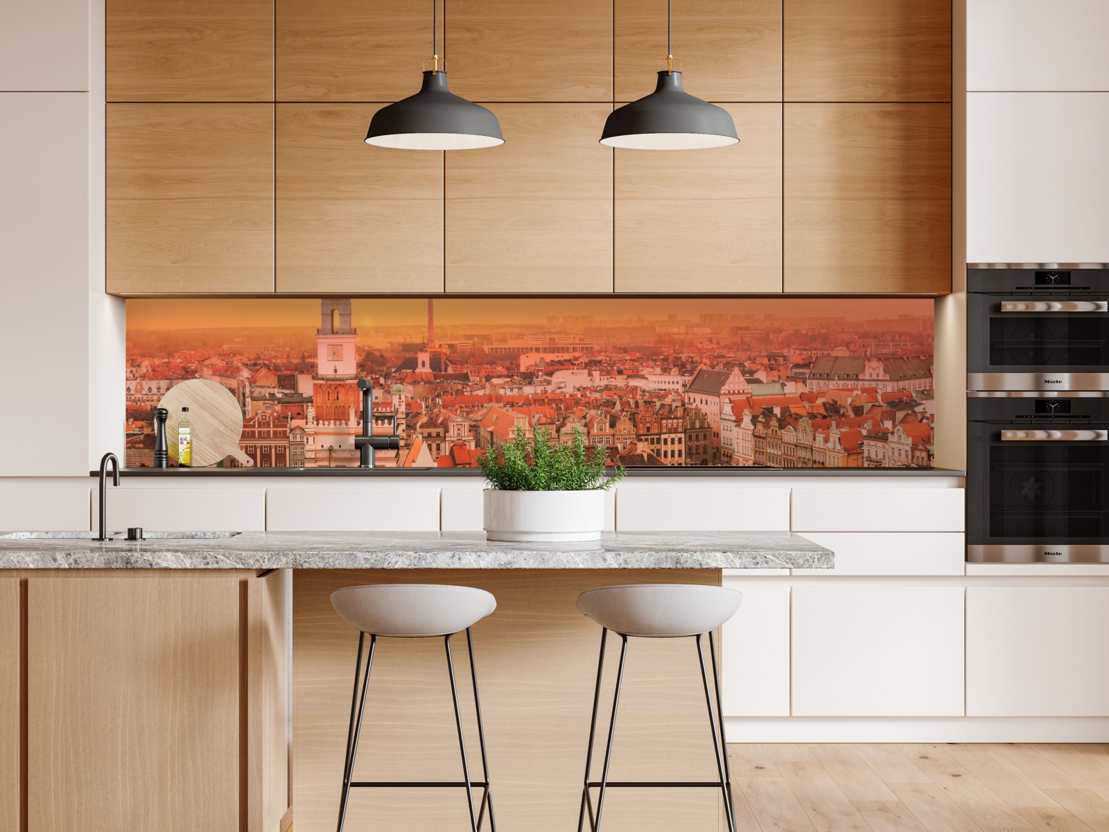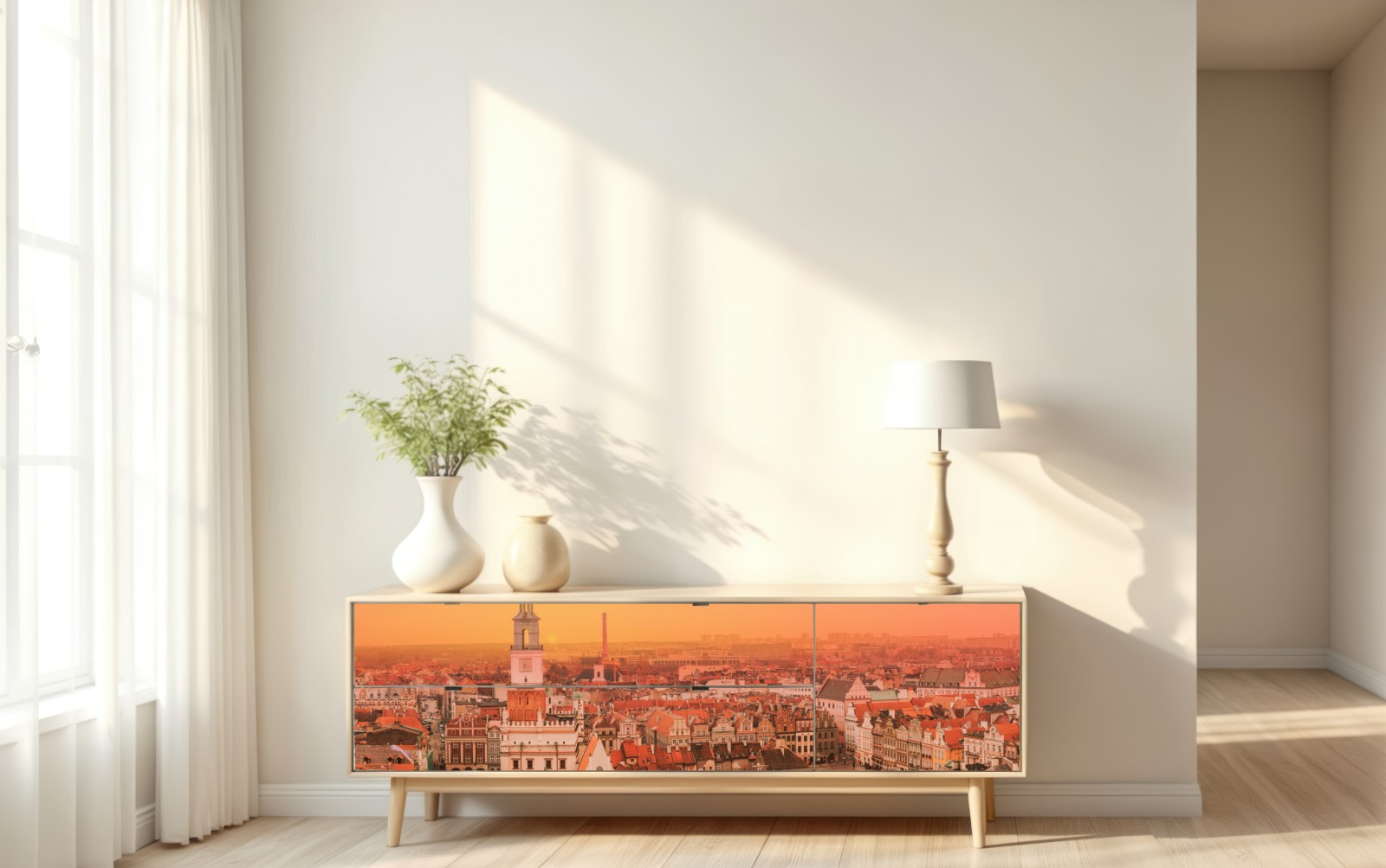 Warmer Panoramablick auf historische Stadtdächer bei Sonnenuntergang, perfekt um Innenräume mit Vintage-Charme zu bereichern.